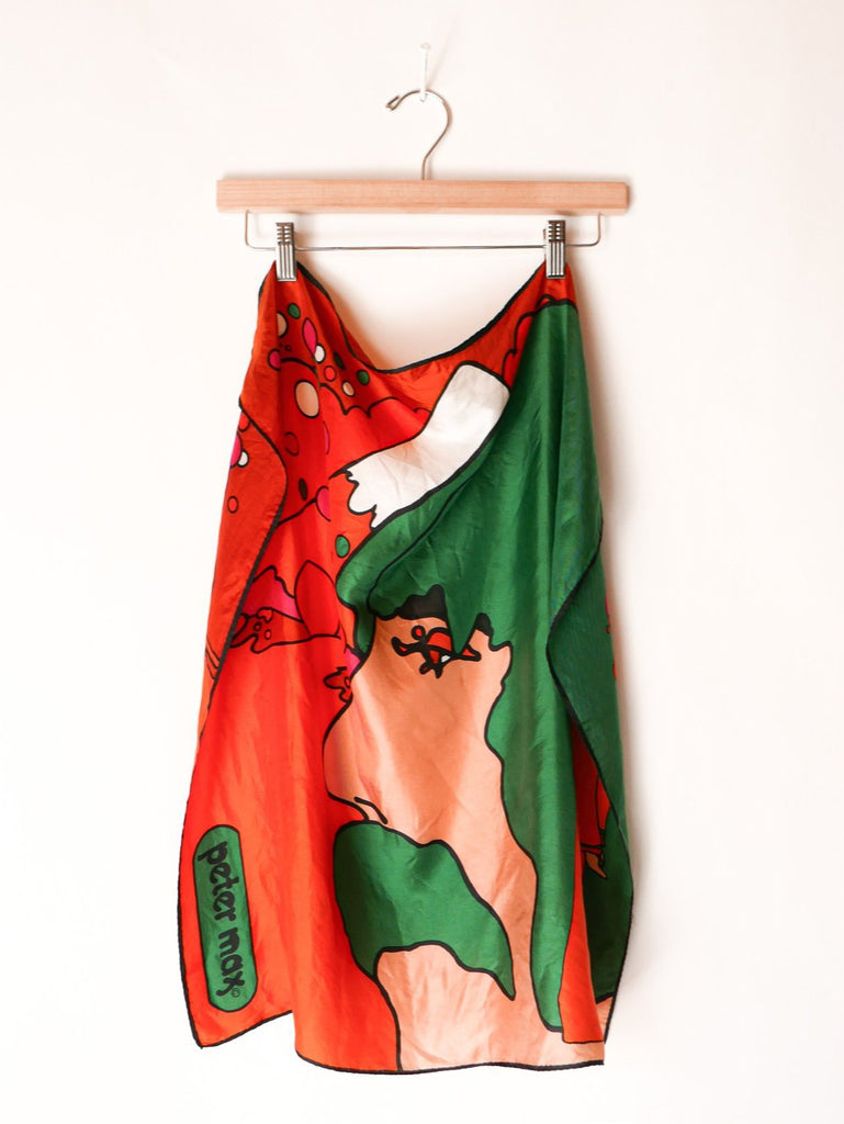 Collectible Peter Max silk scarf. Vivid orange, green, and fuchsia. This is an iconic self portrait of the artist himself.