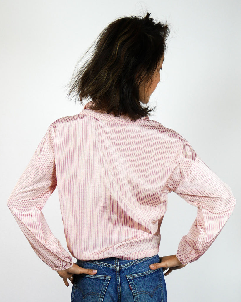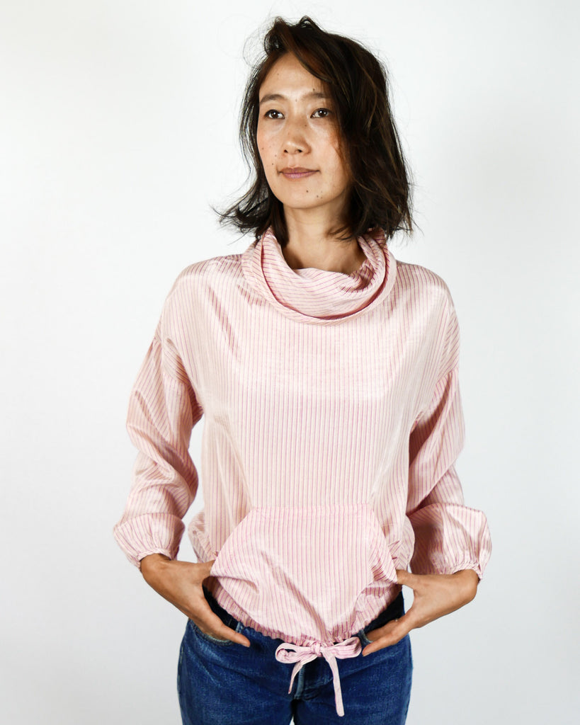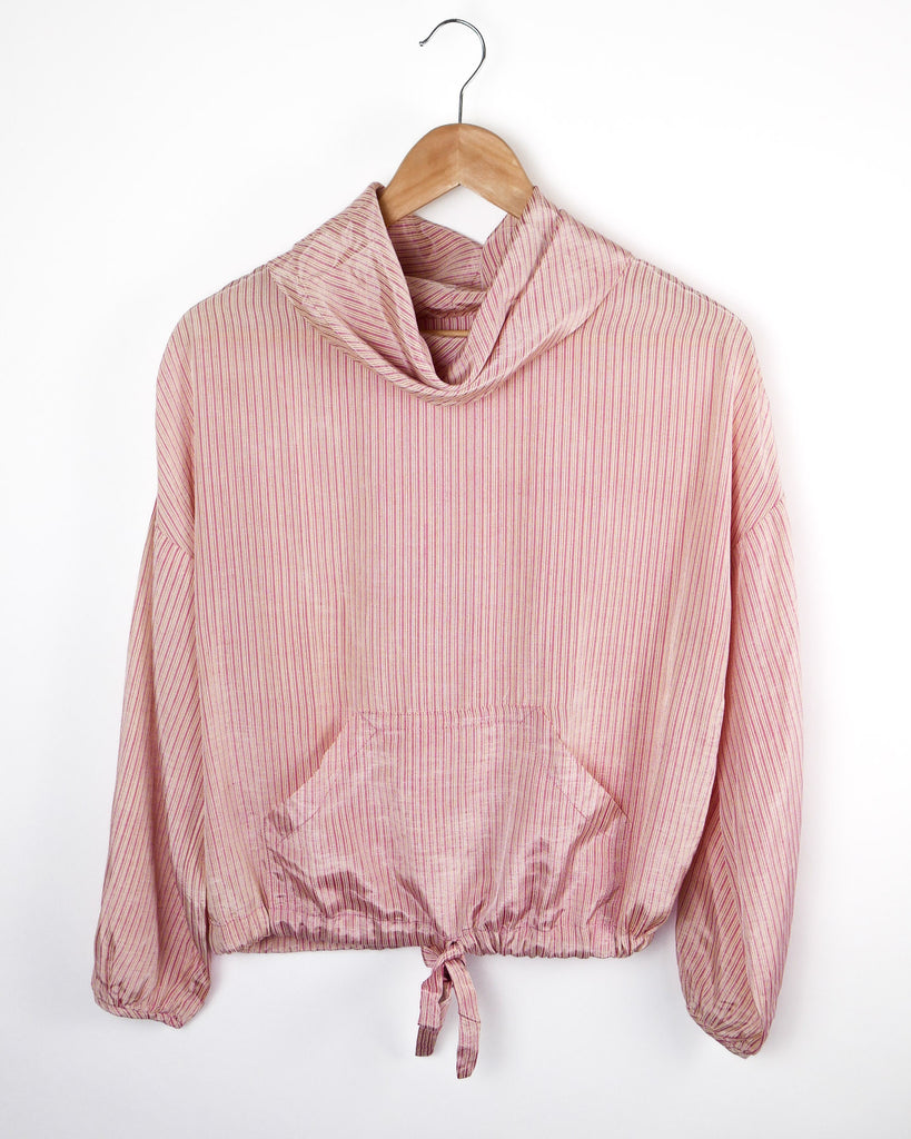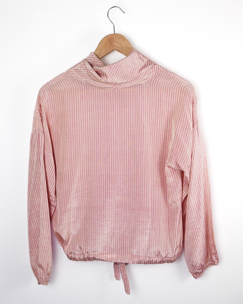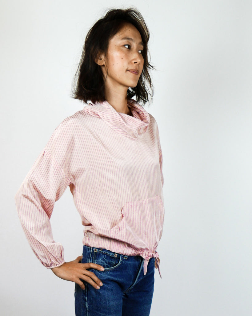 Sweet loose cowel neck pullover top with drawstring waist and front pocket. 1980's styling features pink and white striped light weight silk.