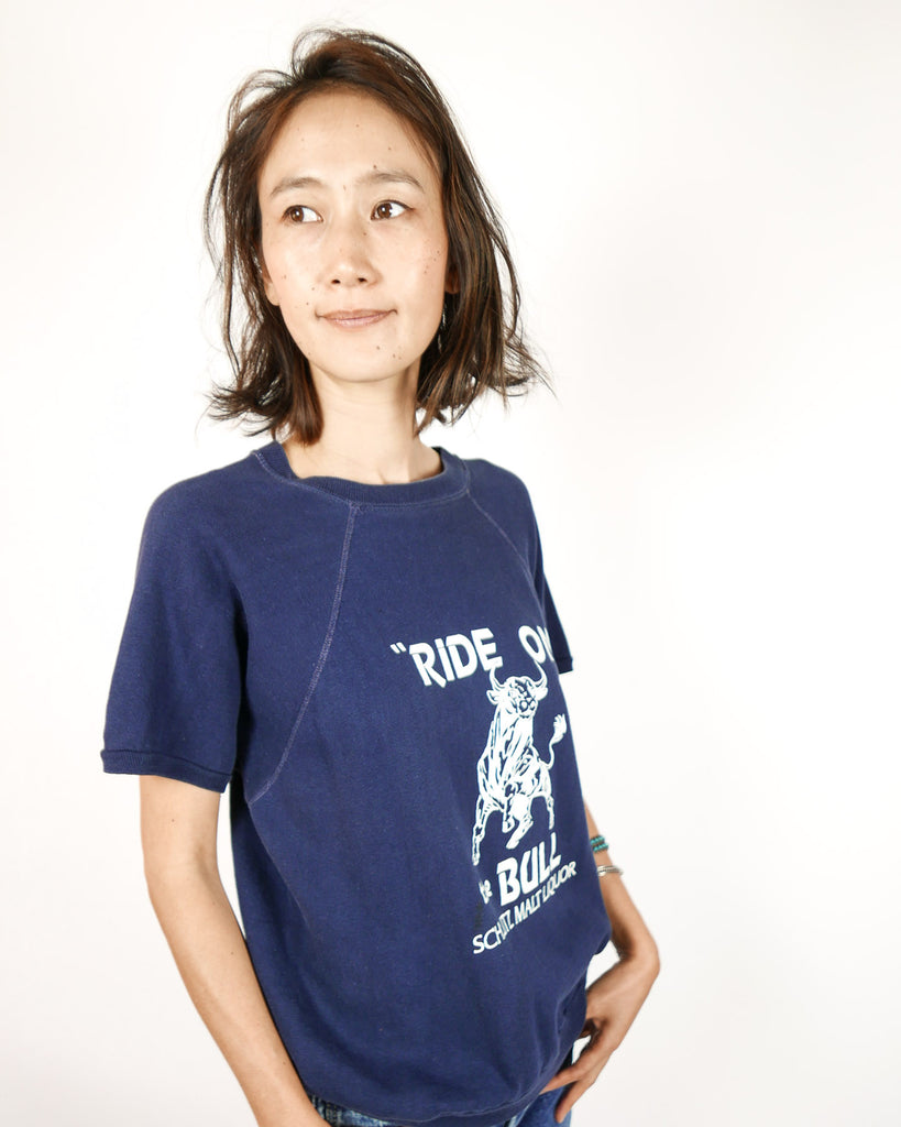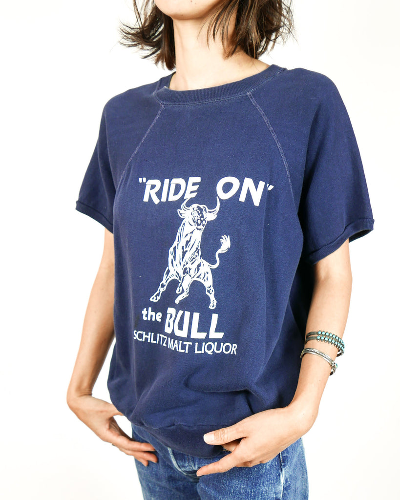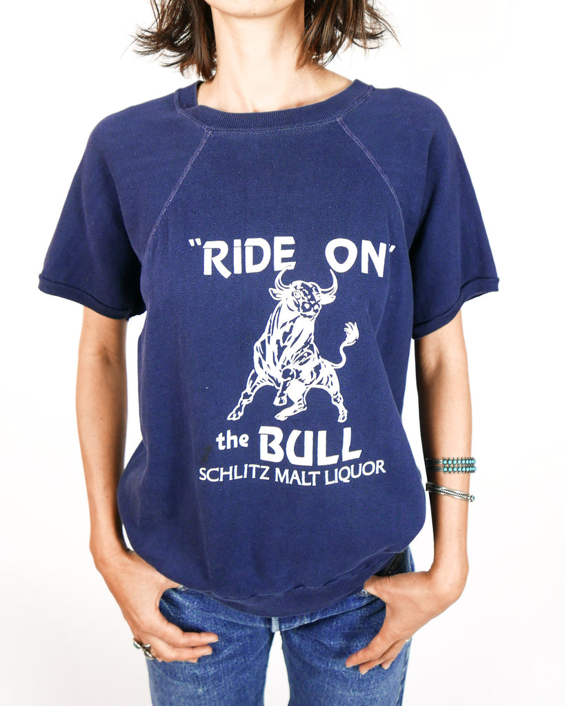Fun navy Schlitz Malt Liquor advertising short-sleeve sweatshirt.  "Ride On" the Bull! Great graphics.