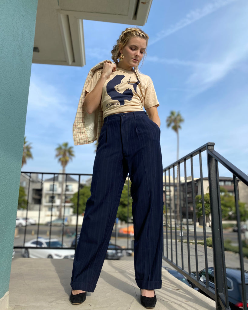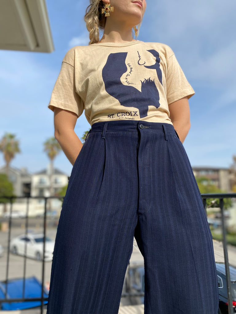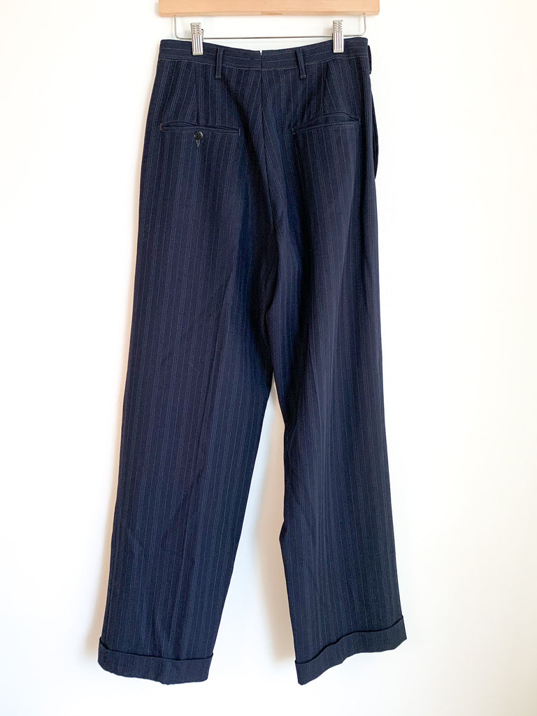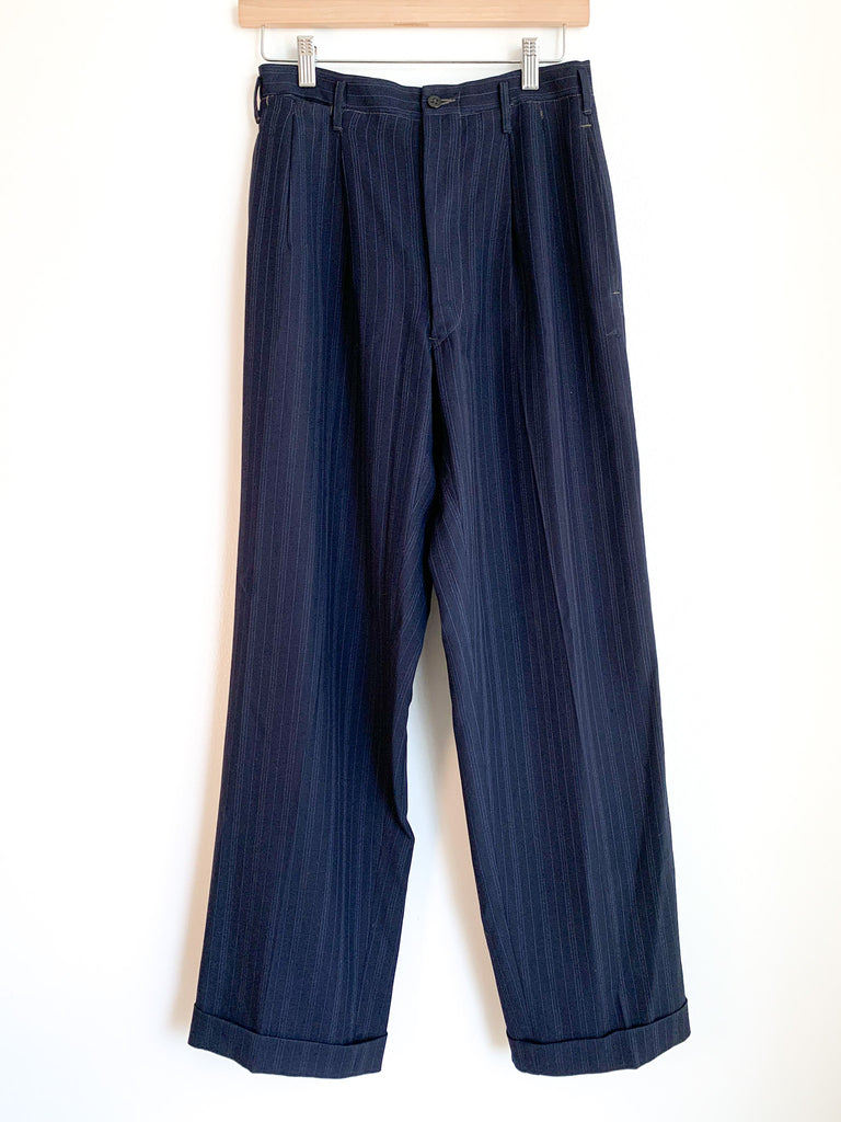 Wool pinstripe mens wear trousers circa 1940’s with watch chain pocket. Rare find classics. Timeless style.