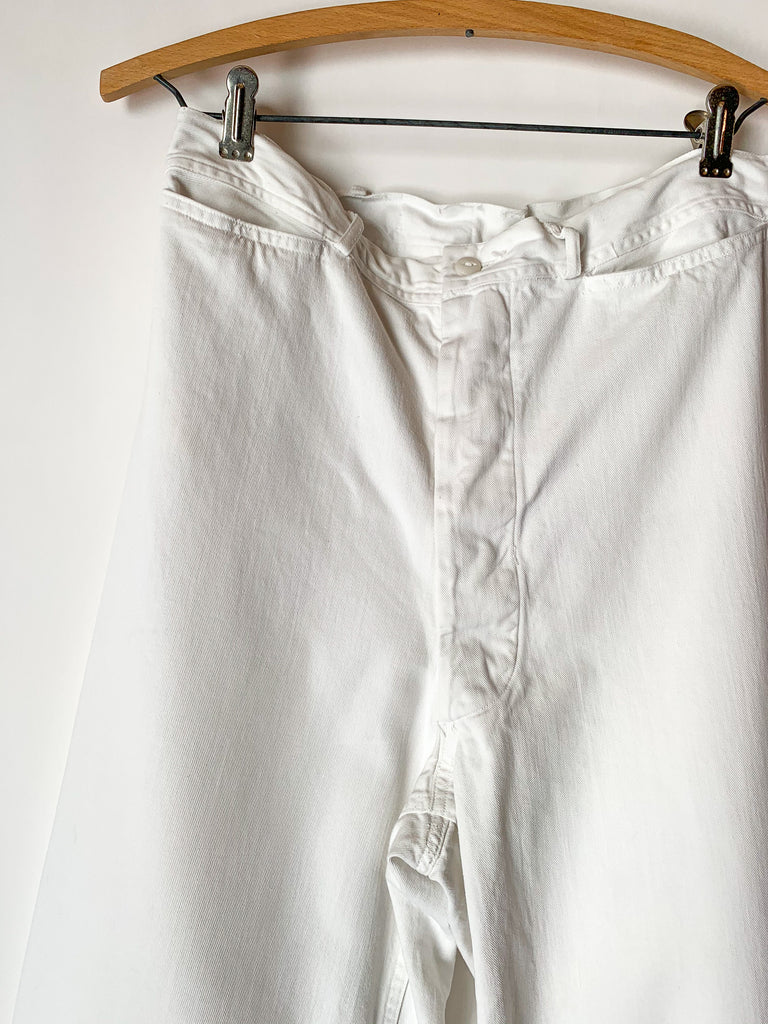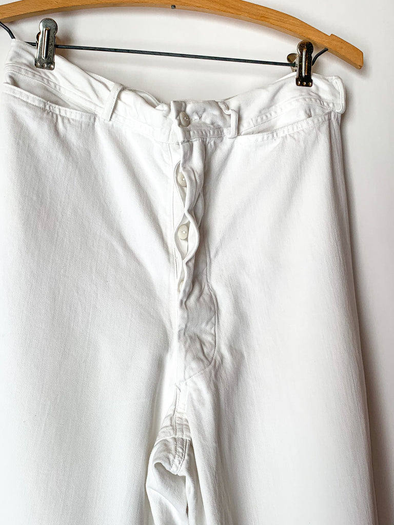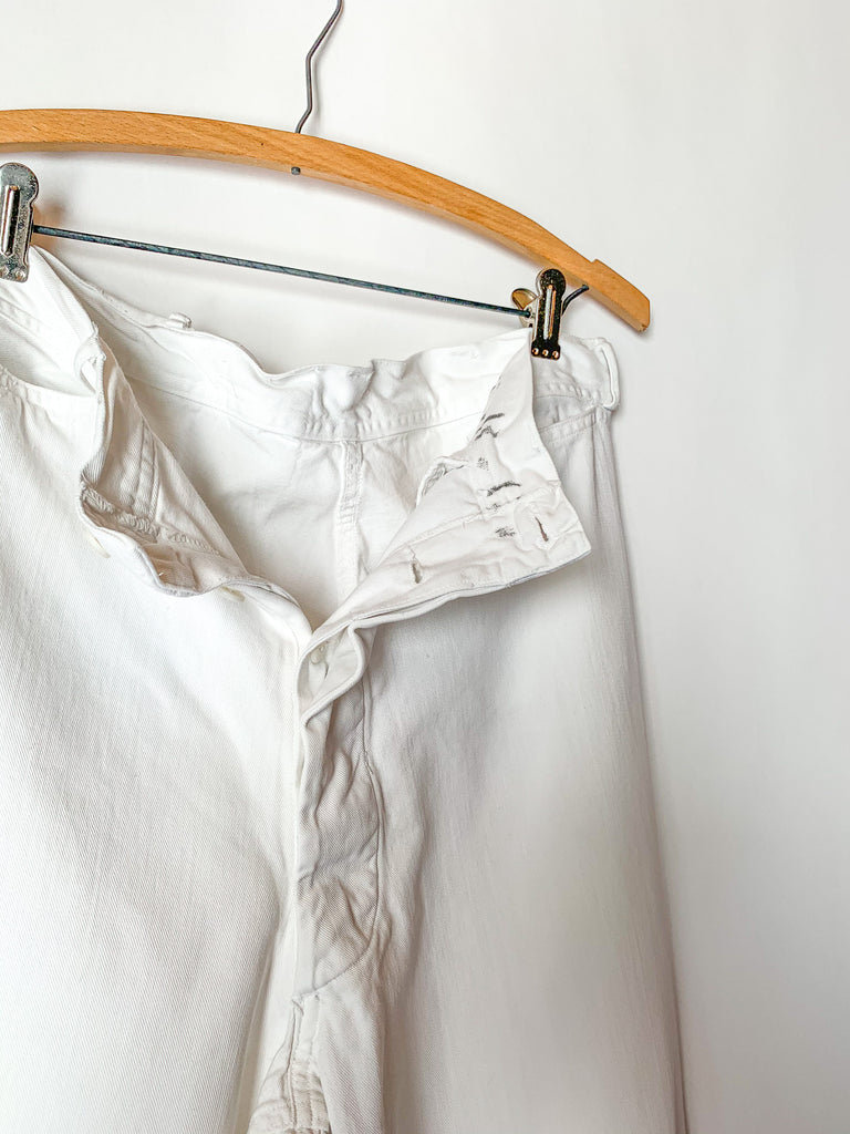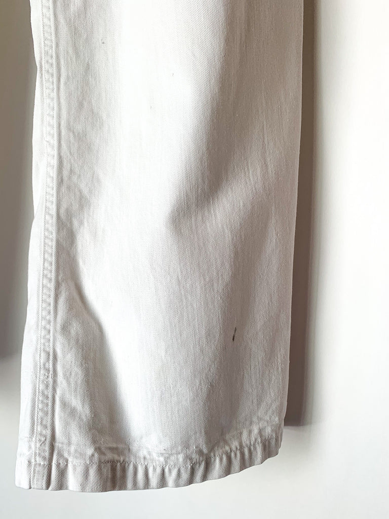 1940’s white heavy cotton US Navy button fly dungarees. Two front pockets, belt loops.