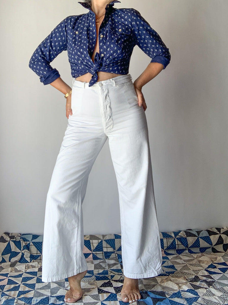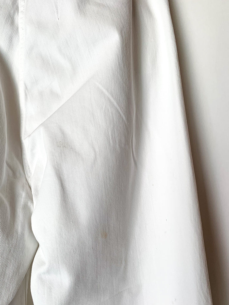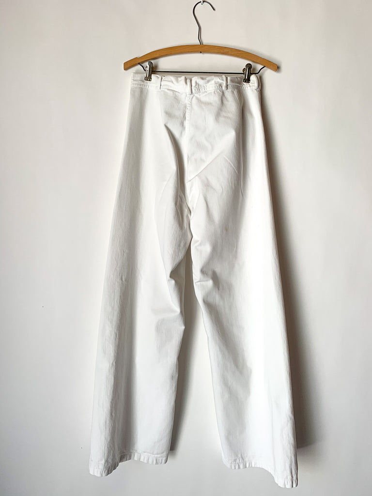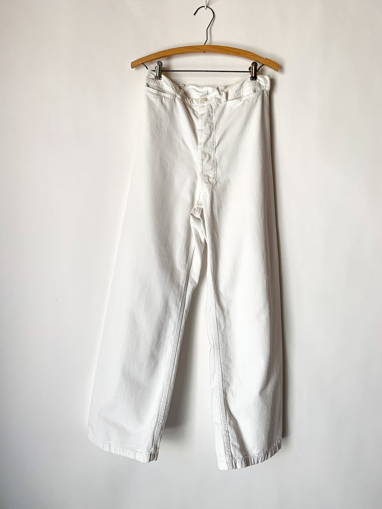 1940’s white heavy cotton US Navy button fly dungarees. Two front pockets, belt loops.