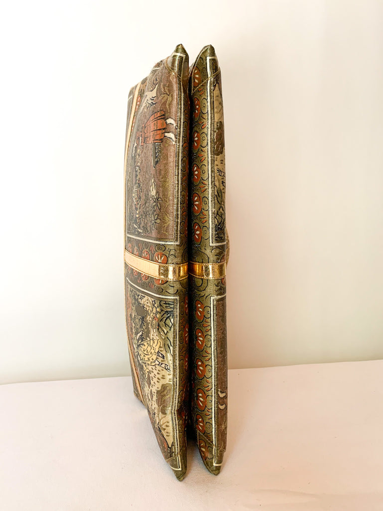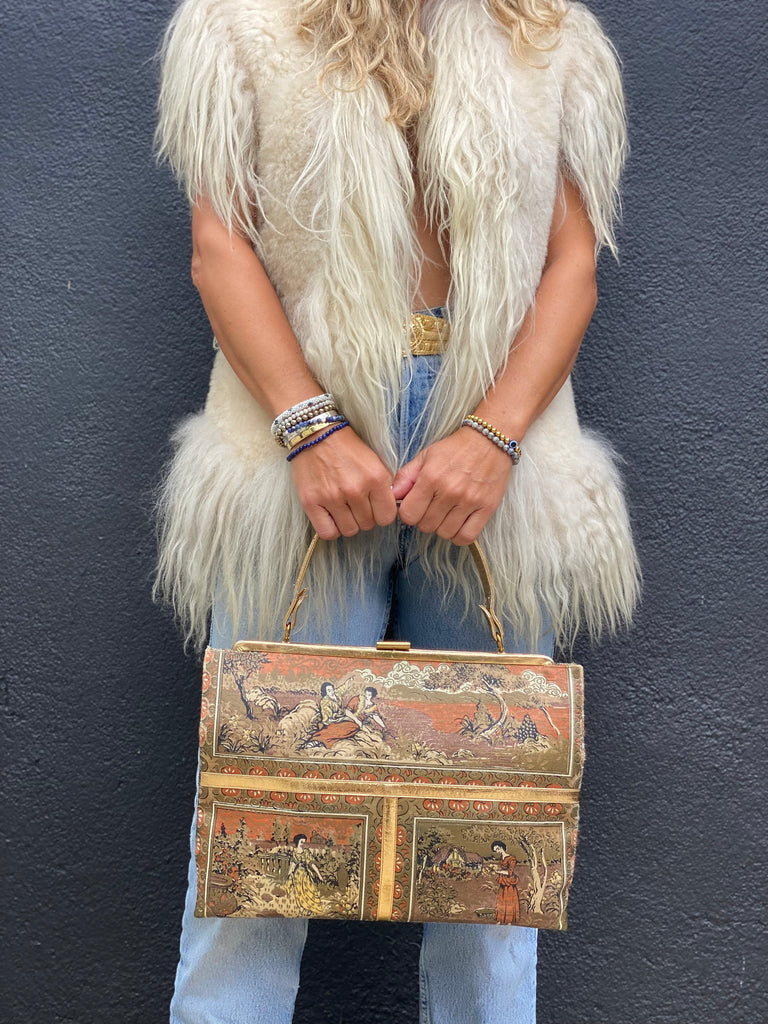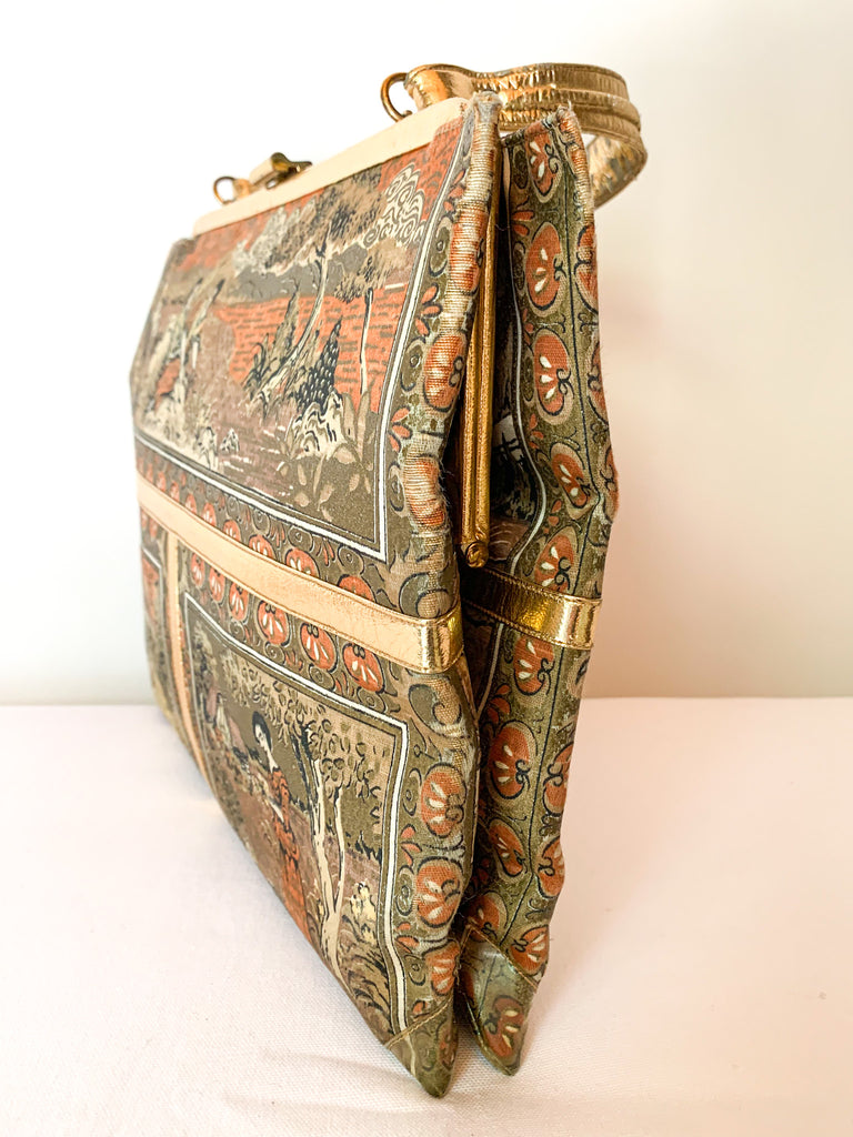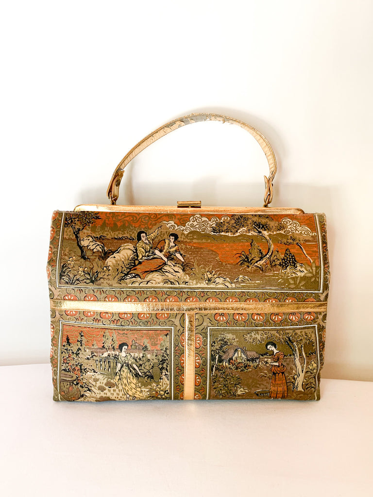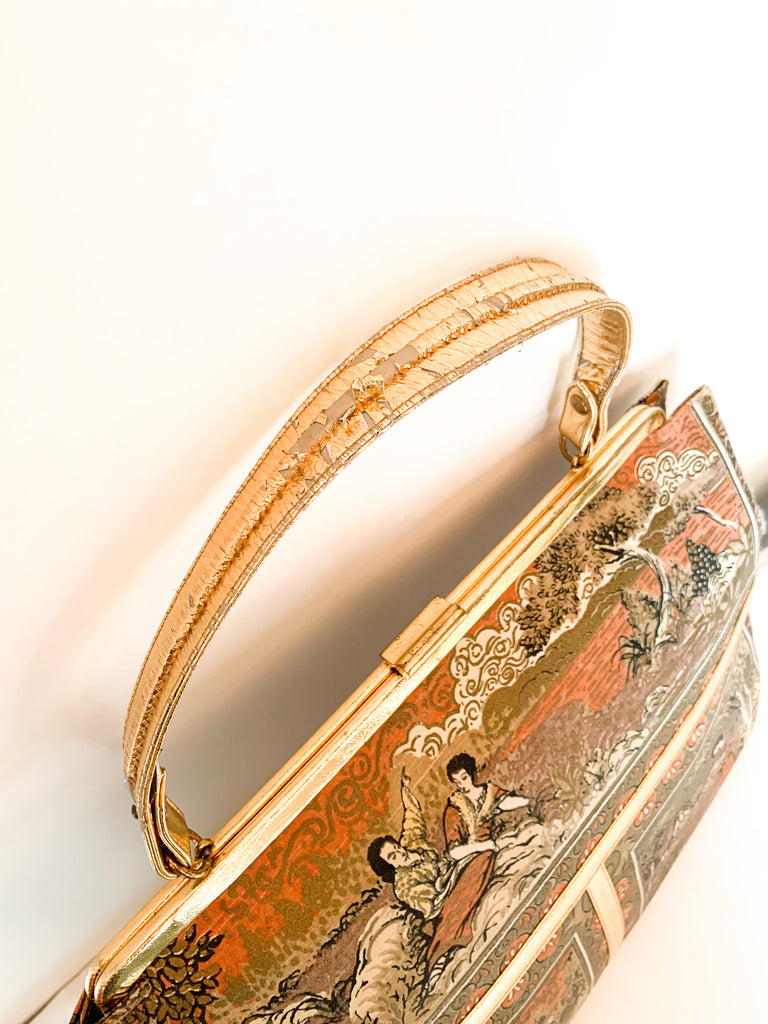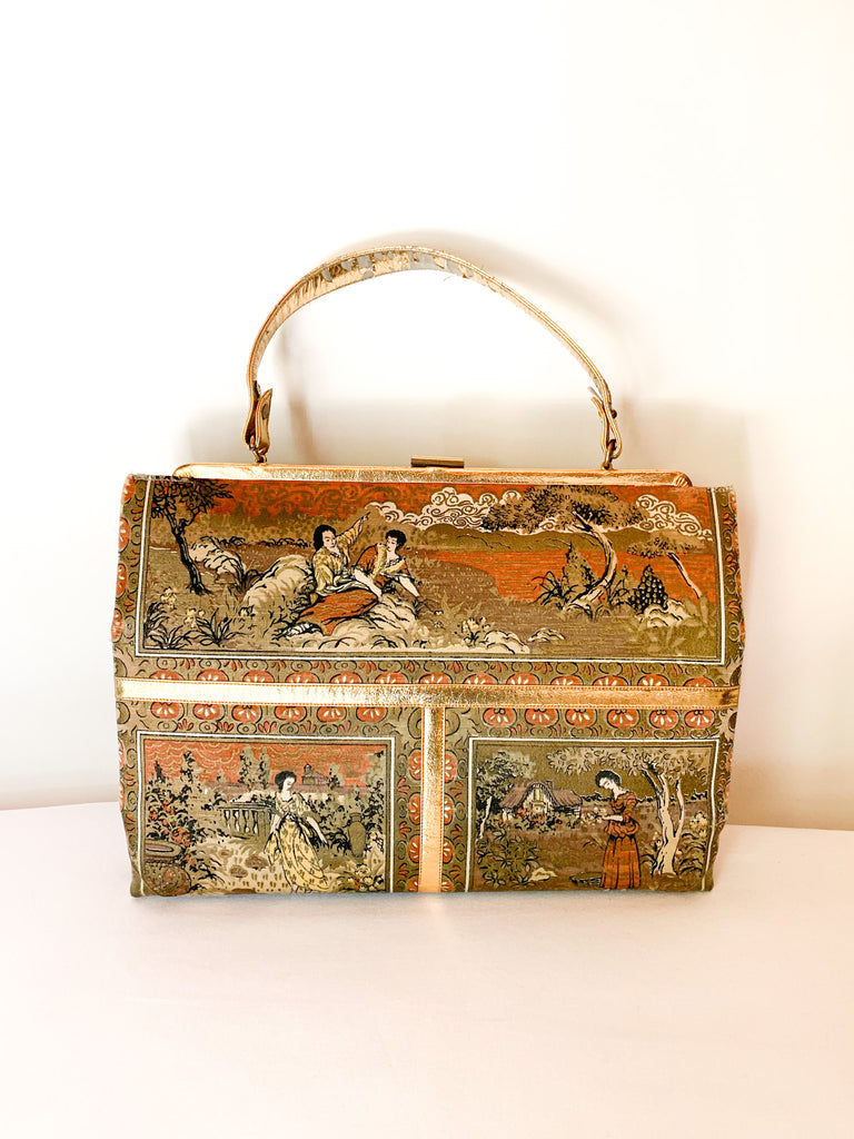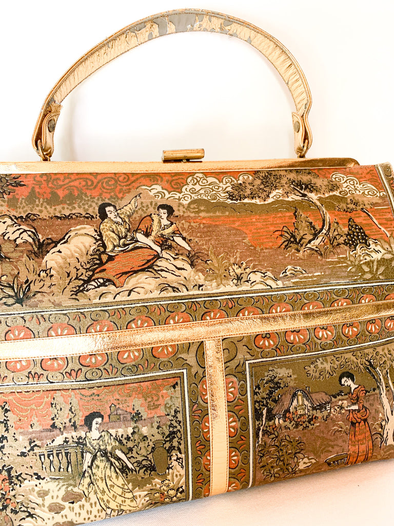 Fabric printed frame purse bag with romantic period pictorial scenery. Shades of orange and gold with black accent. Looks almost like a painting of different idyllic romantic scenes.