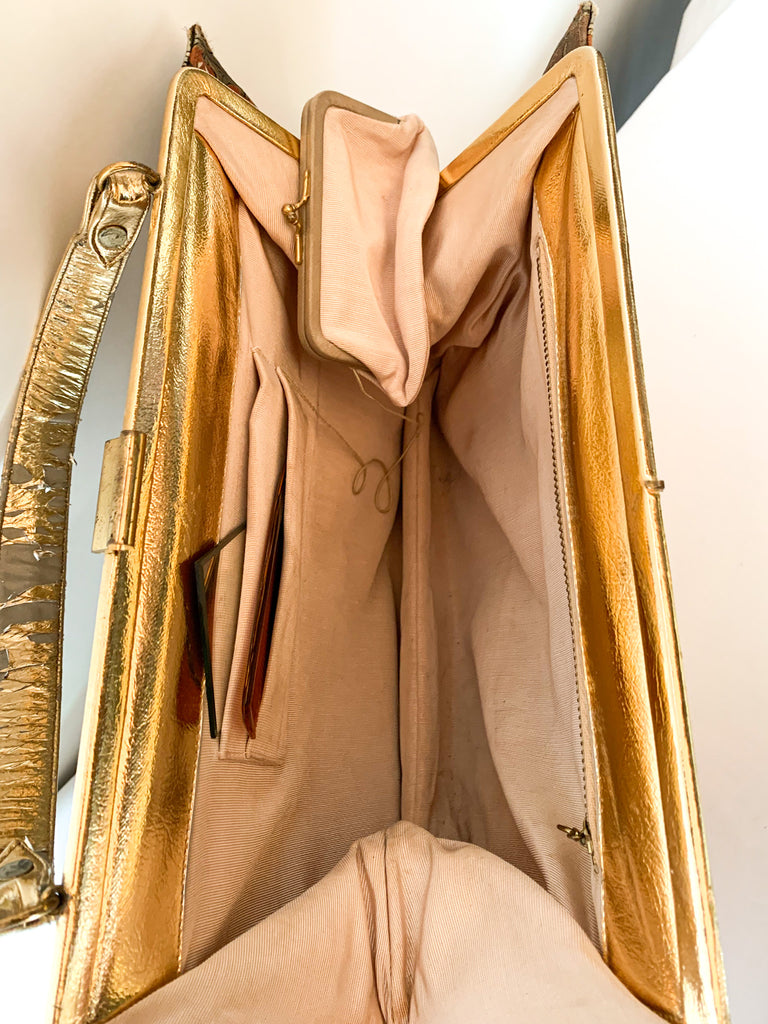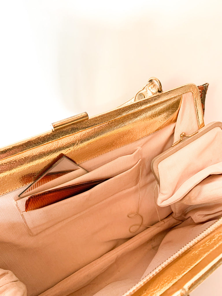 Top handle has flaking of the foil, but we would probably wrap with a scarf like we do on many of our top handled bags. Complete with comb, mirror and attached coin purse. Lady like 1960’s conversation accessory.