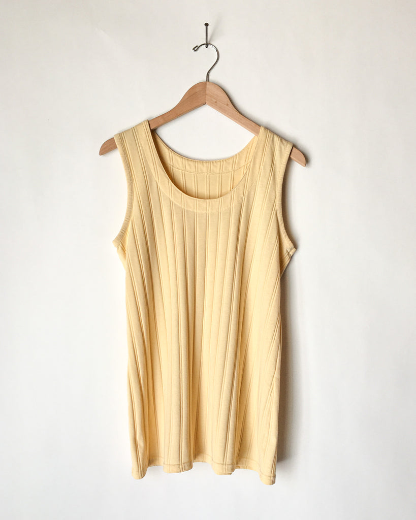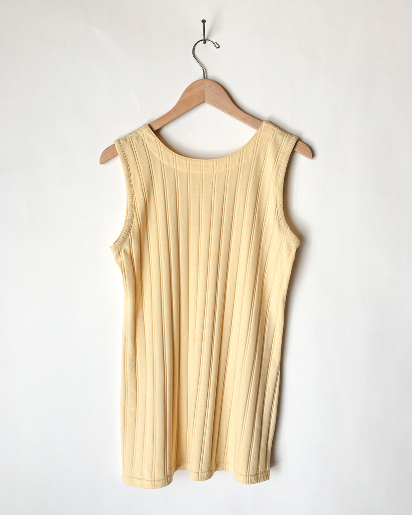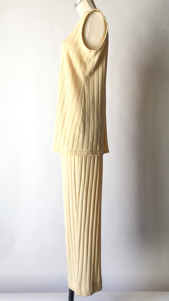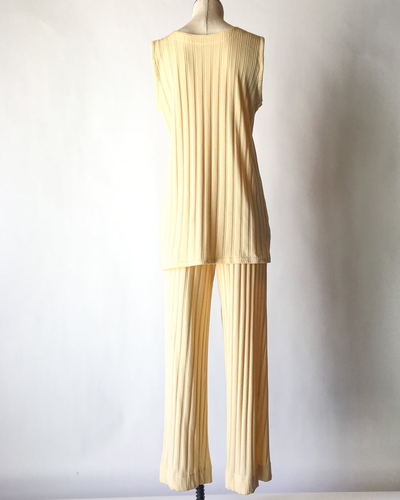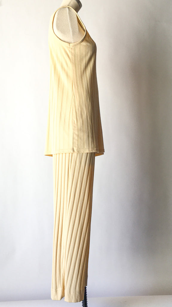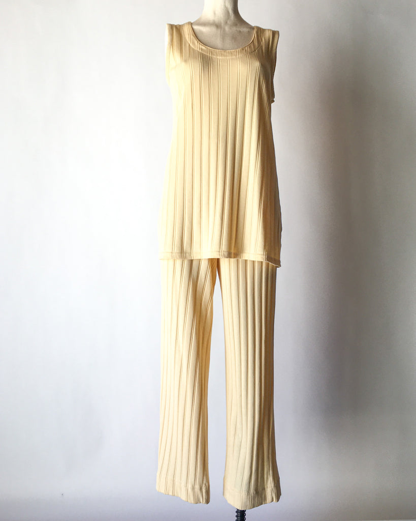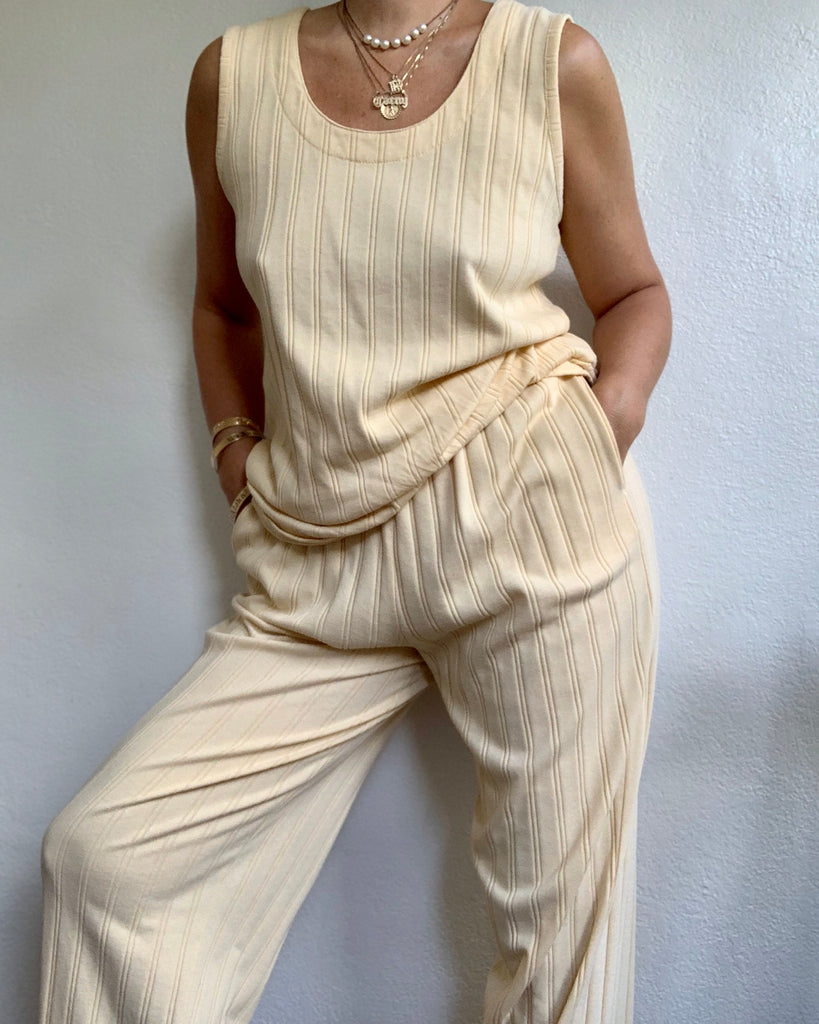 Pale yellow cotton tank and pant set. Lounge wear or add a blazer or denim jacket. Pockets in pants. Wear together or separate. Sold as set only.