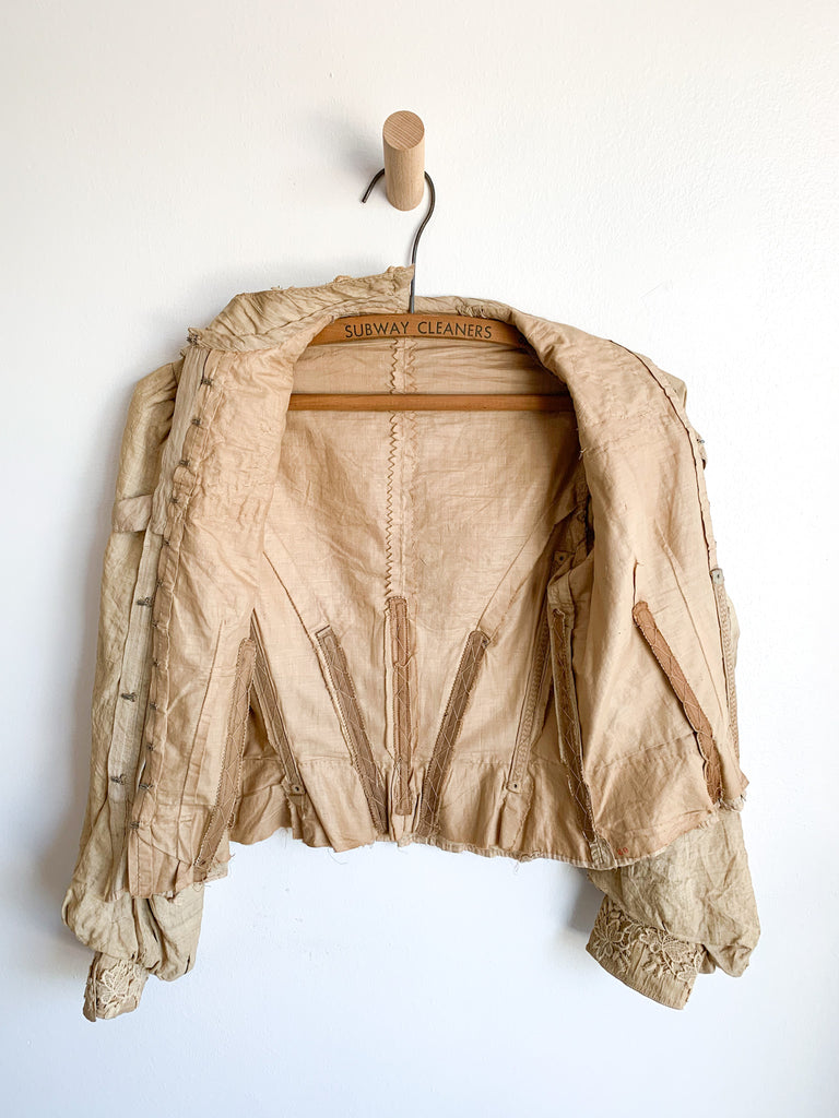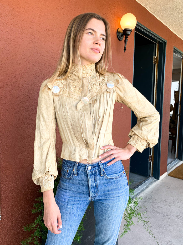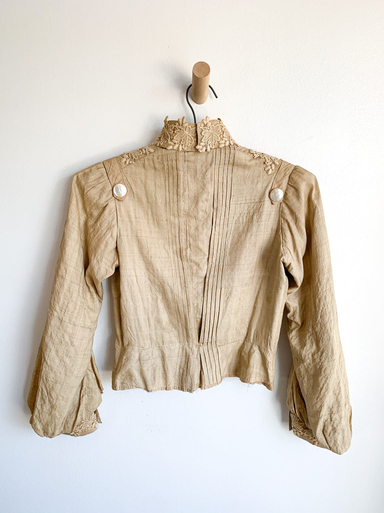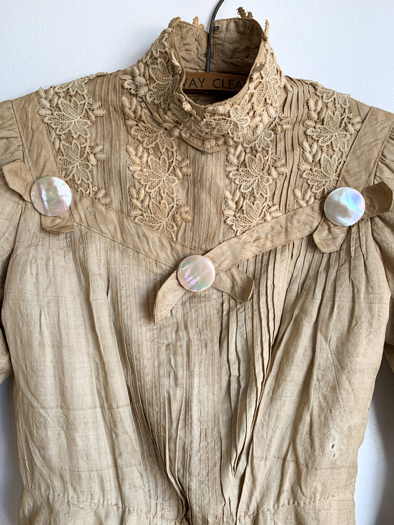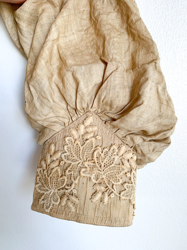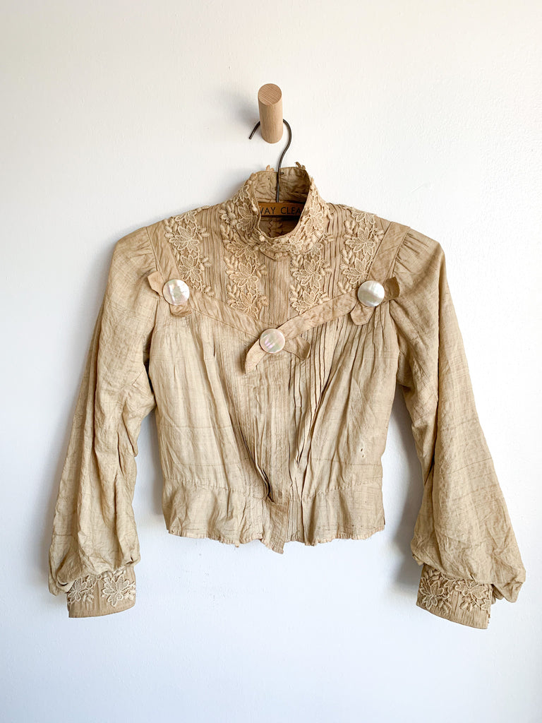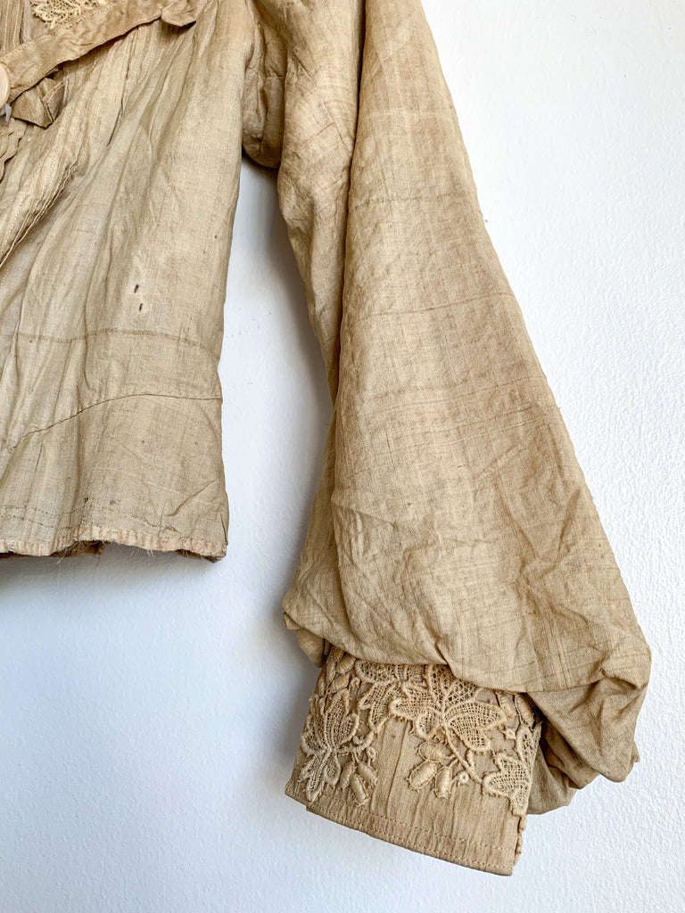 The most glorious antique ecru silk blouse. High neck, puff shoulder, lace at cuffs and chest, delicate pin tucks at front and back. So many good details and such structure.