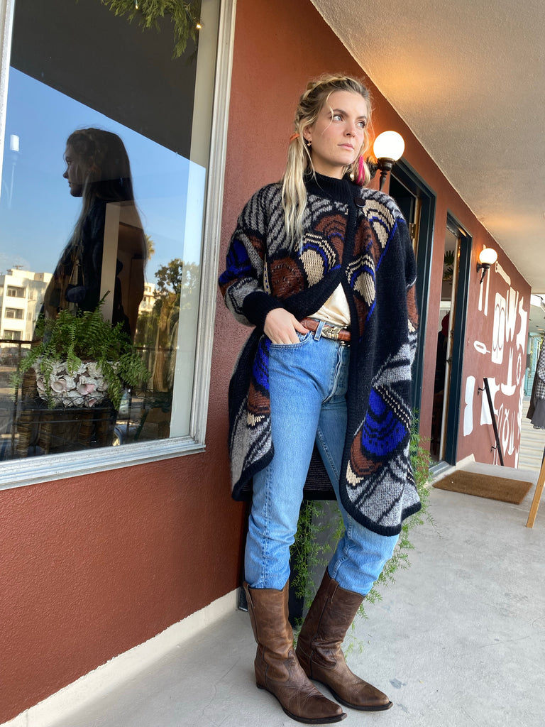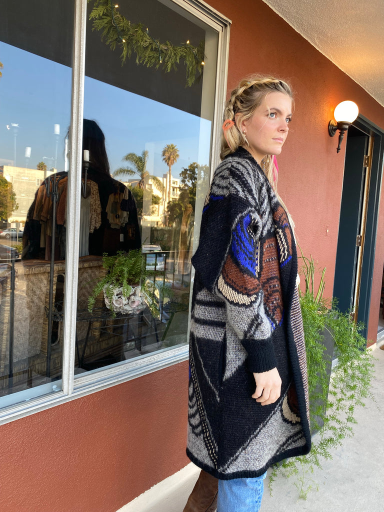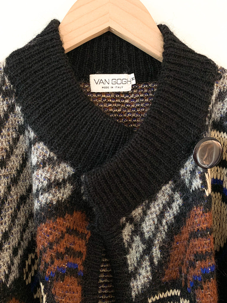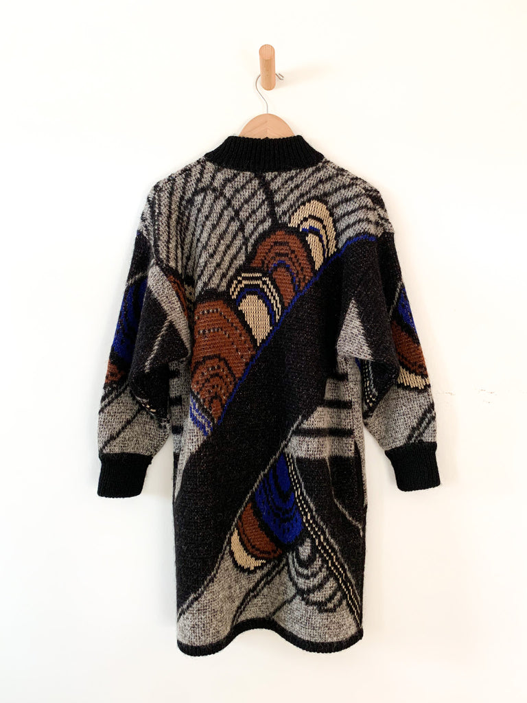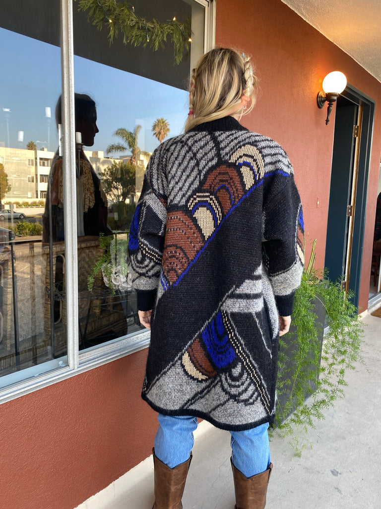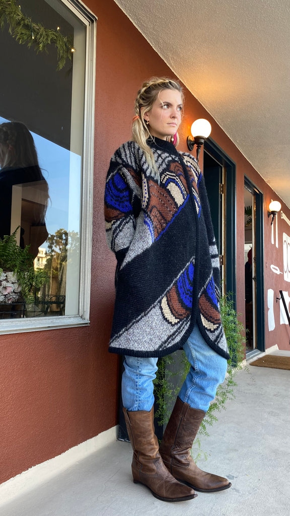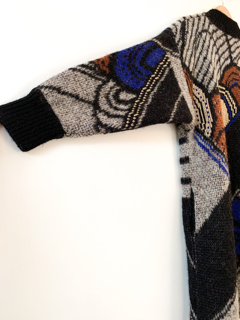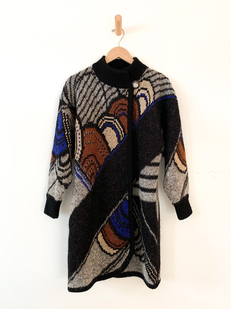 Graphic and bold design Italian 1980’s long cardigan sweater coat. Rich hues of blue, rust, bone and gray. Side button at high neck and full side pockets. Make a statement and feel extra cozy in this epic sweater.
