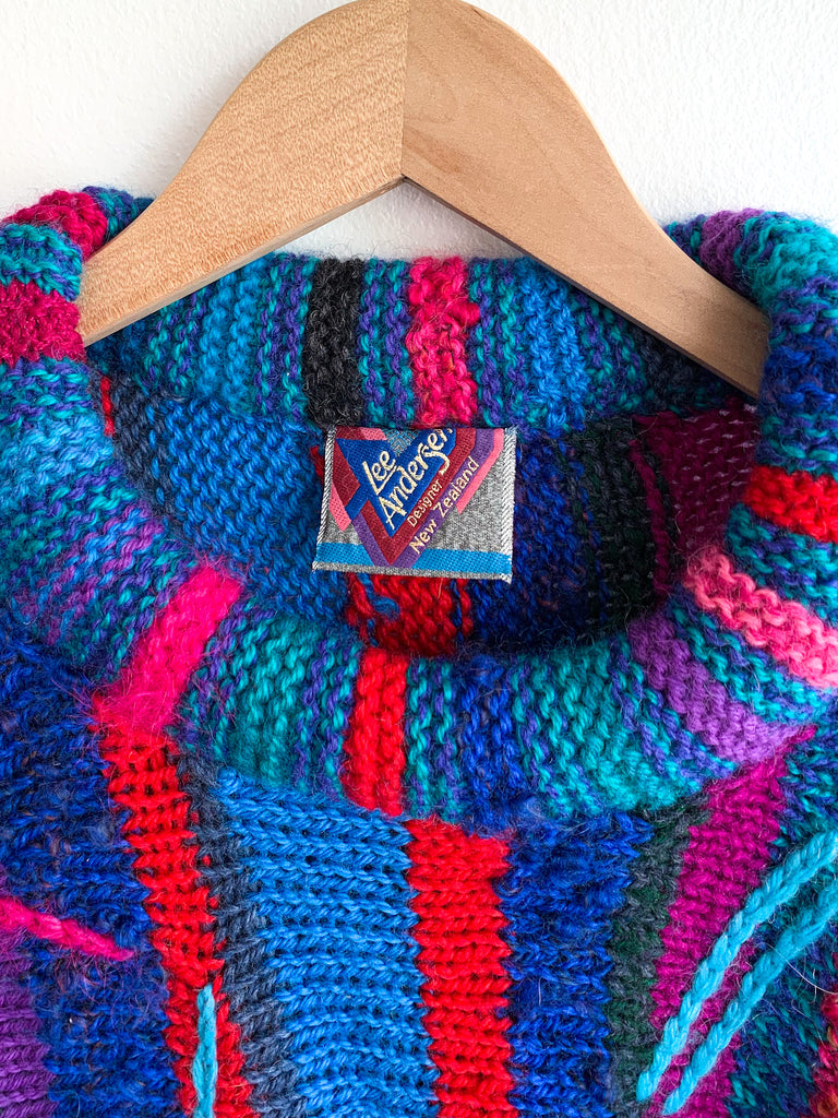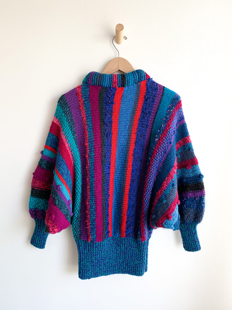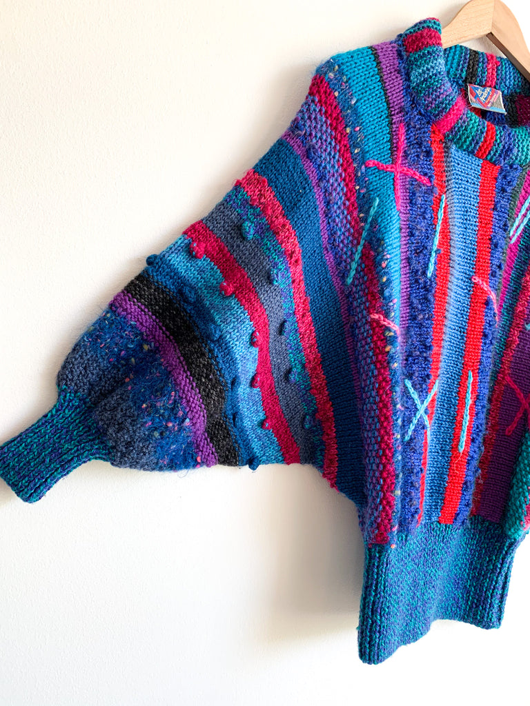 Avant Garde 1980’s dolman sleeve sweater in bold fuchsia, blue, and teals. So good, collectible and unique.