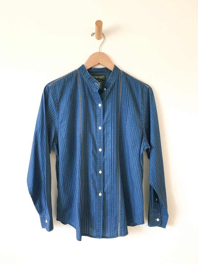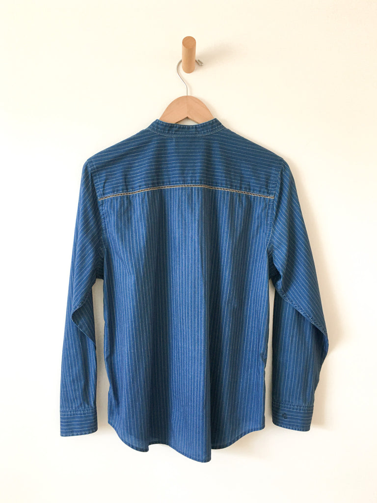 Classic indigo blue striped calico print cotton long sleeve button front blouse. Mandarin collar and dainty crochet lace inserts.