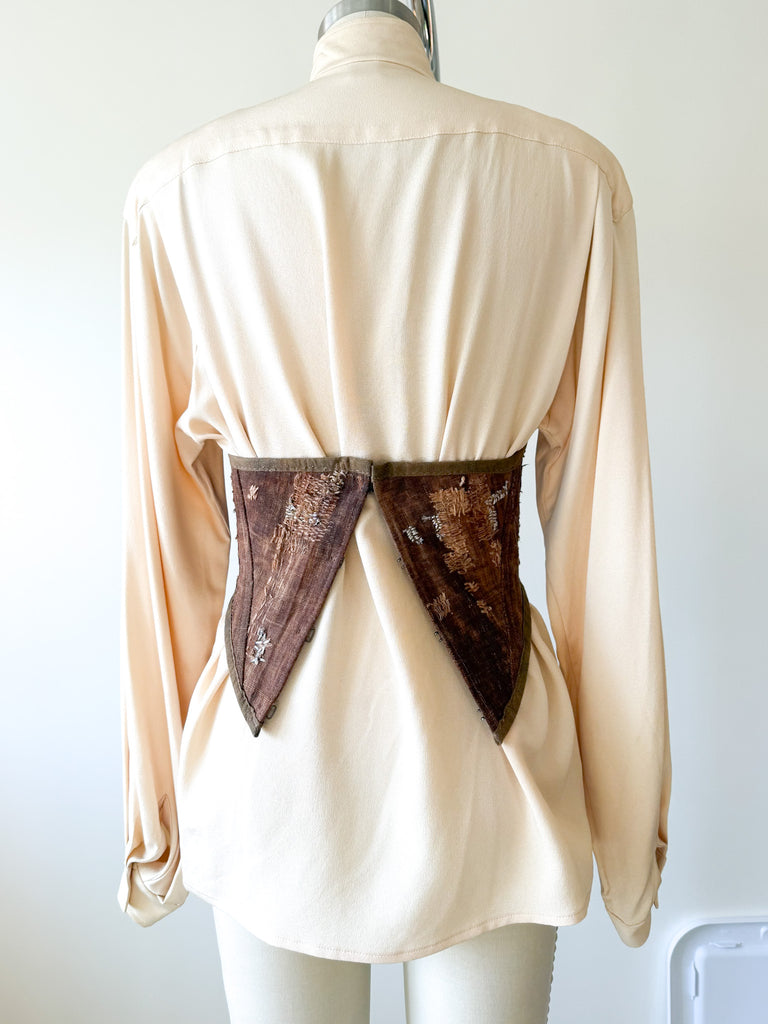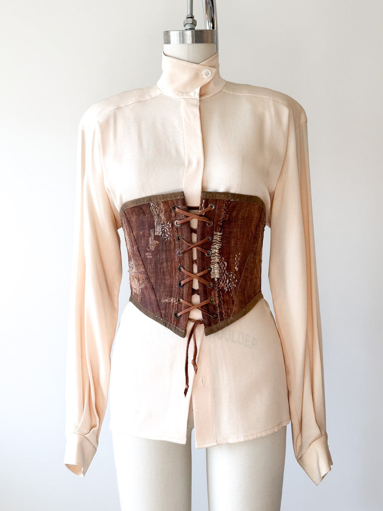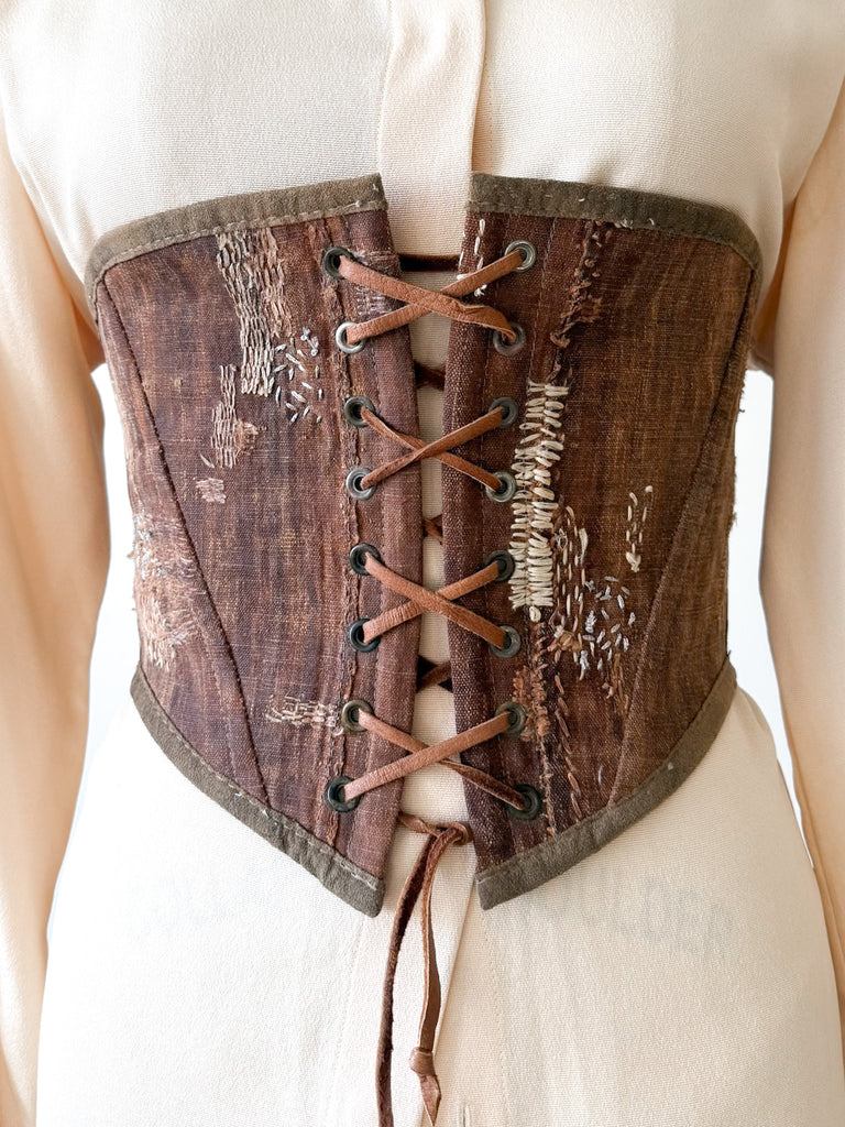 Judy is a colleague and fellow lover of old textiles. She is renowned for her talents and has been supplying Double RL for ages with the most sought after one of a kind bags. While she endeavored to create these corsets, they proved more laborious than she wanted so there was a very small number created. I was fortunate enough to scoop up a mini collection directly from Judy. I am so grateful, such a talented woman! Each corset or bustier is unique and enchanting.