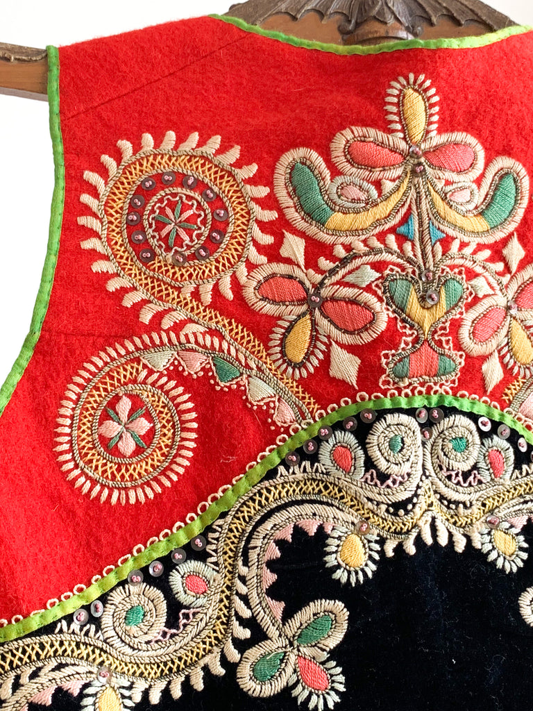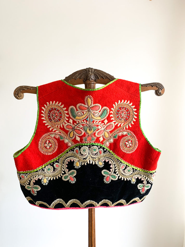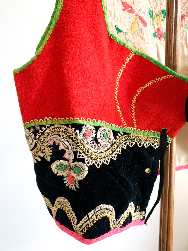 Ethnic bustier or corset vest with intricate needlework and front lacing. Original ribbon tie is a bit short, an extra ribbon will be included.