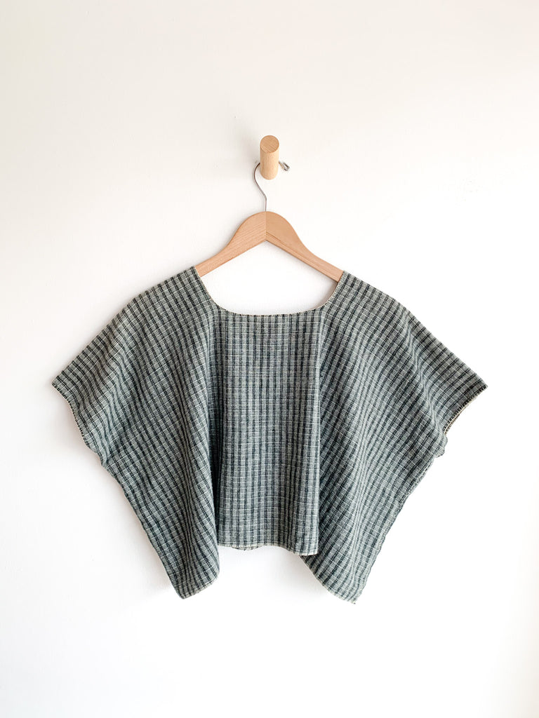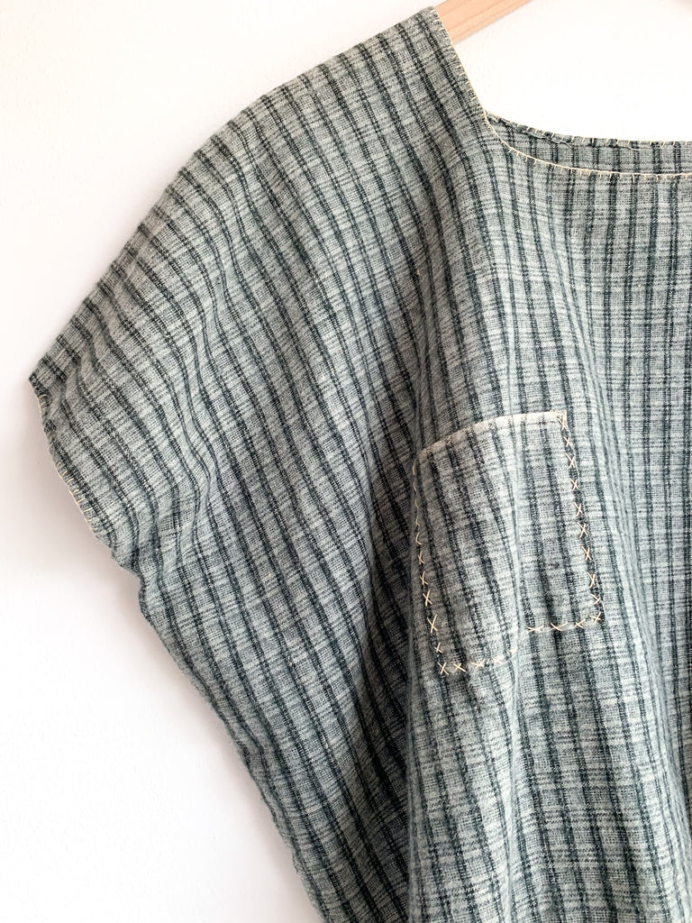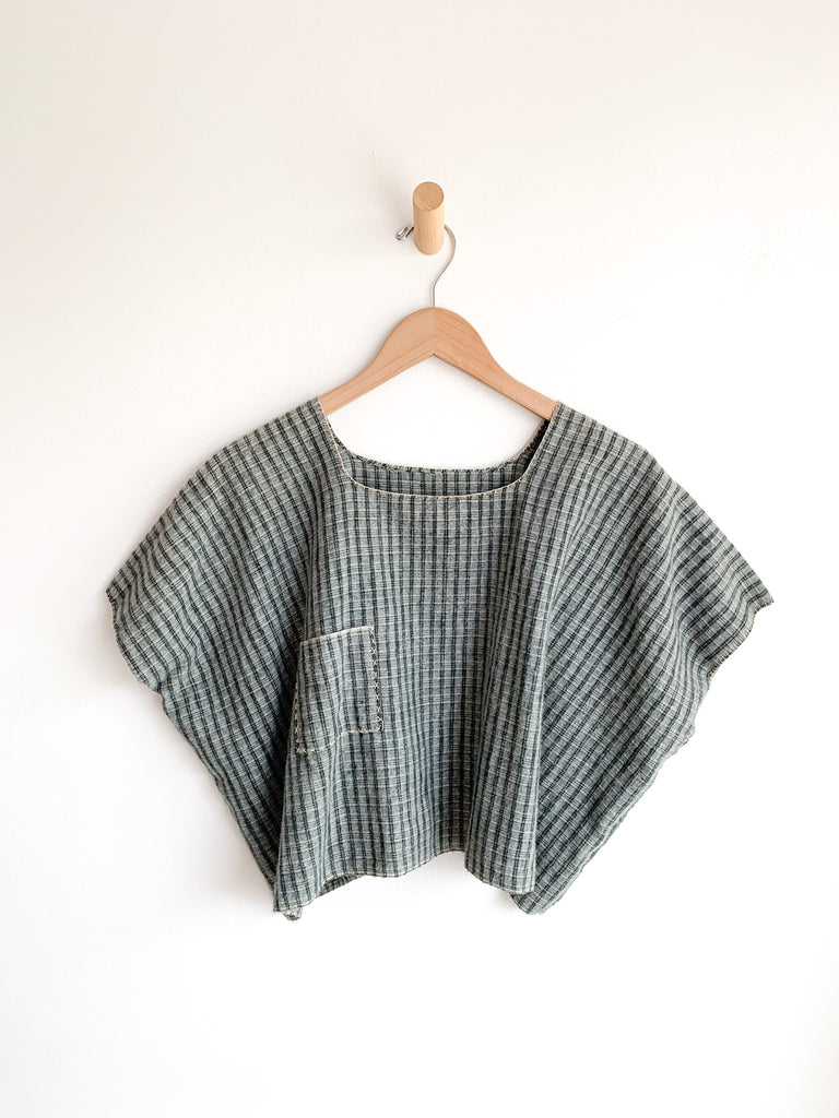 Artisan made flannel pullover crop top. Sweetest hand stitching throughout and single pocket details. The entire top is made by hand stitching. Color in soft hued green tones reminiscent of forests and fields.