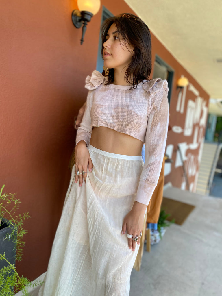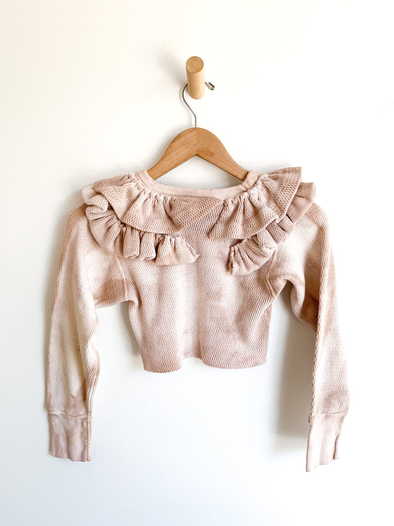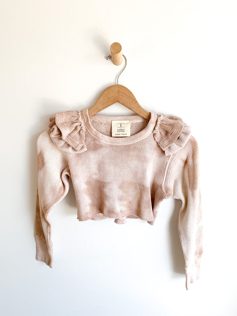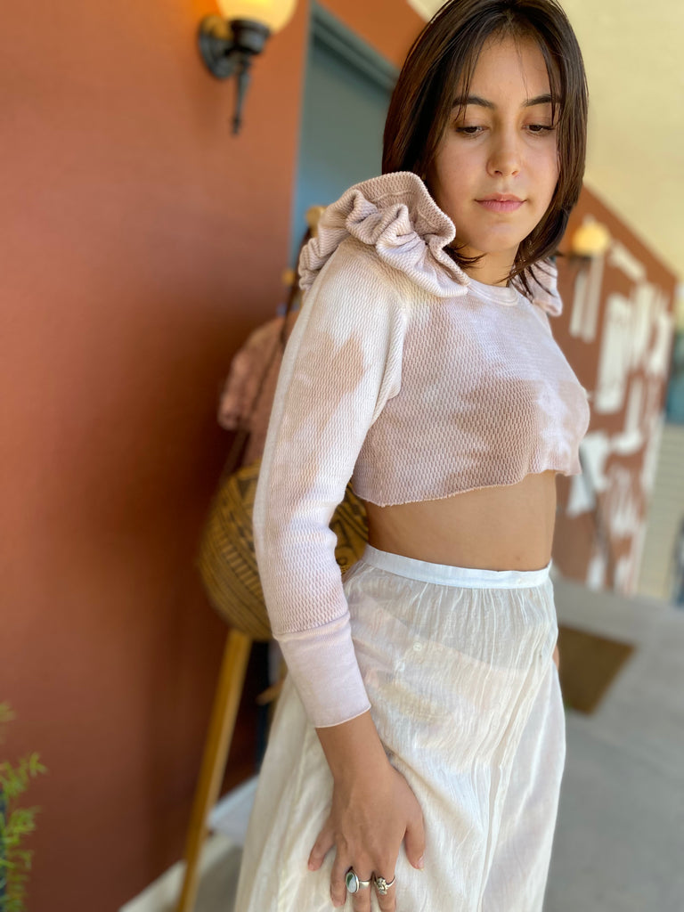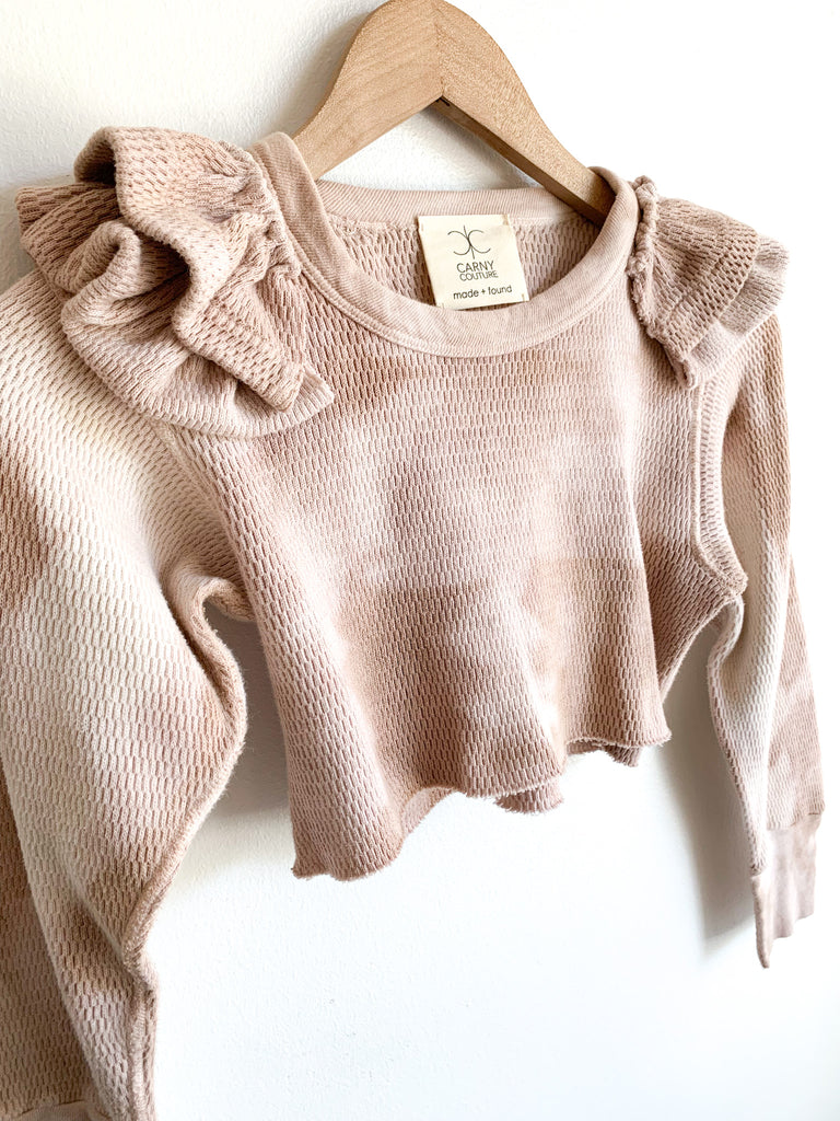One-of-a-kind hand-dyed, cropped and hand-sewn ruffle shoulder, asymmetrical at back, waffle thermal top reworked in the Carny Couture studio.