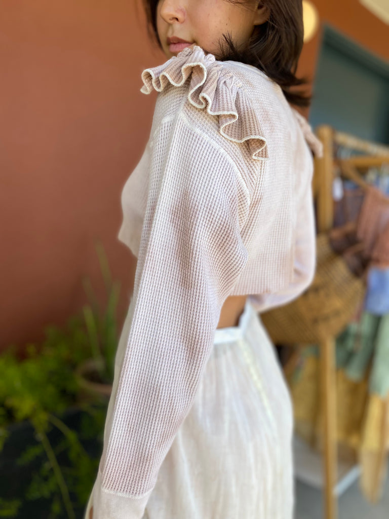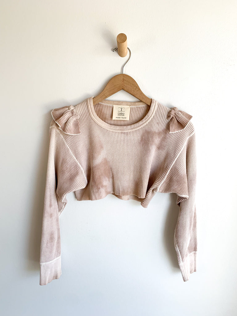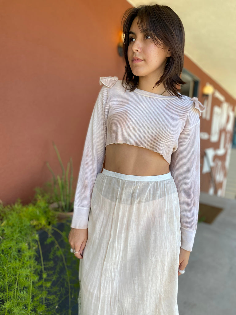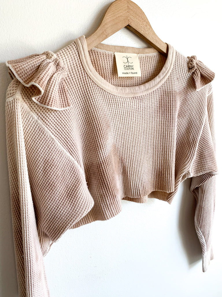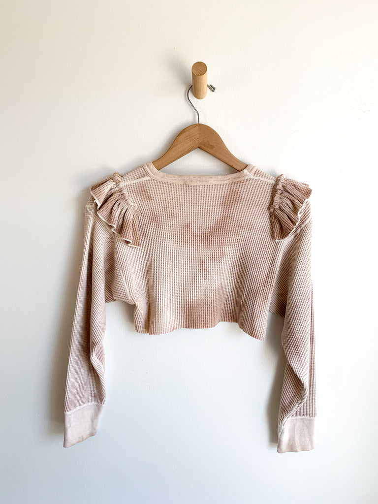 One-of-a-kind hand-dyed, cropped and hand-sewn ruffle shoulder waffle thermal top reworked in the Carny Couture studio.