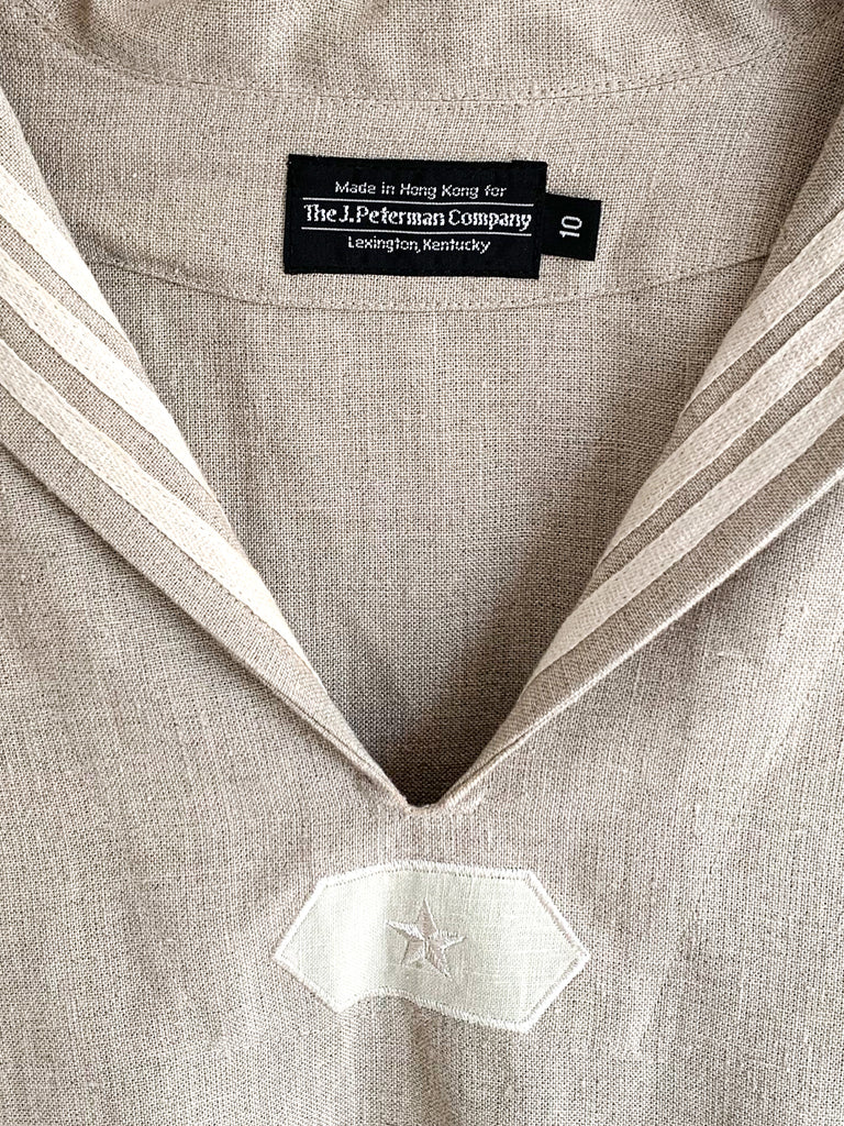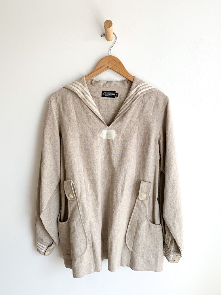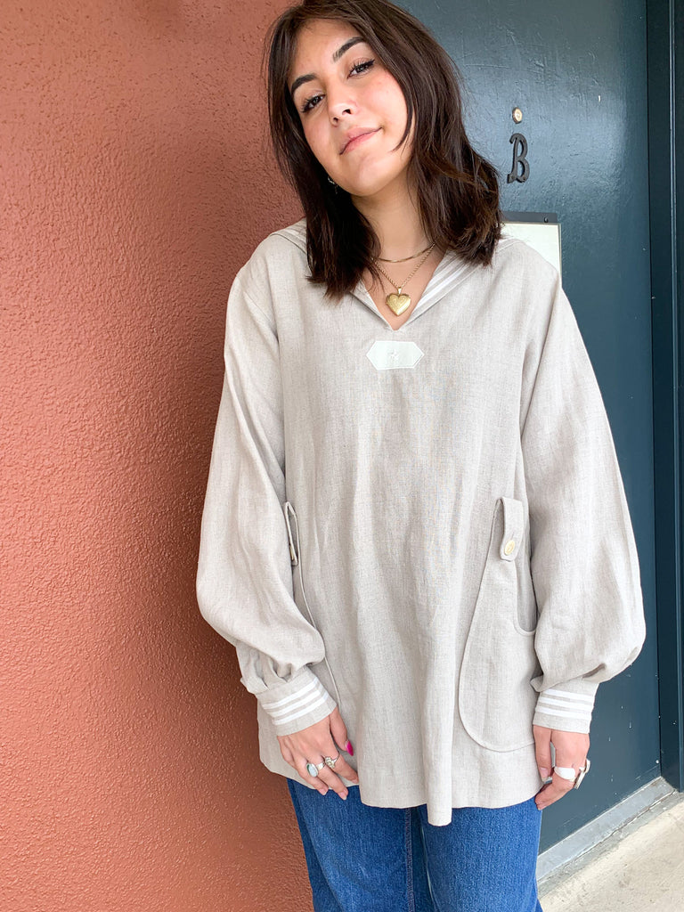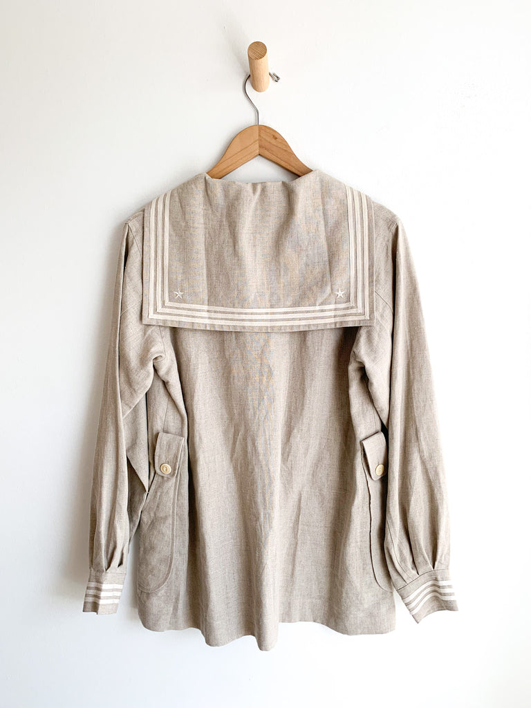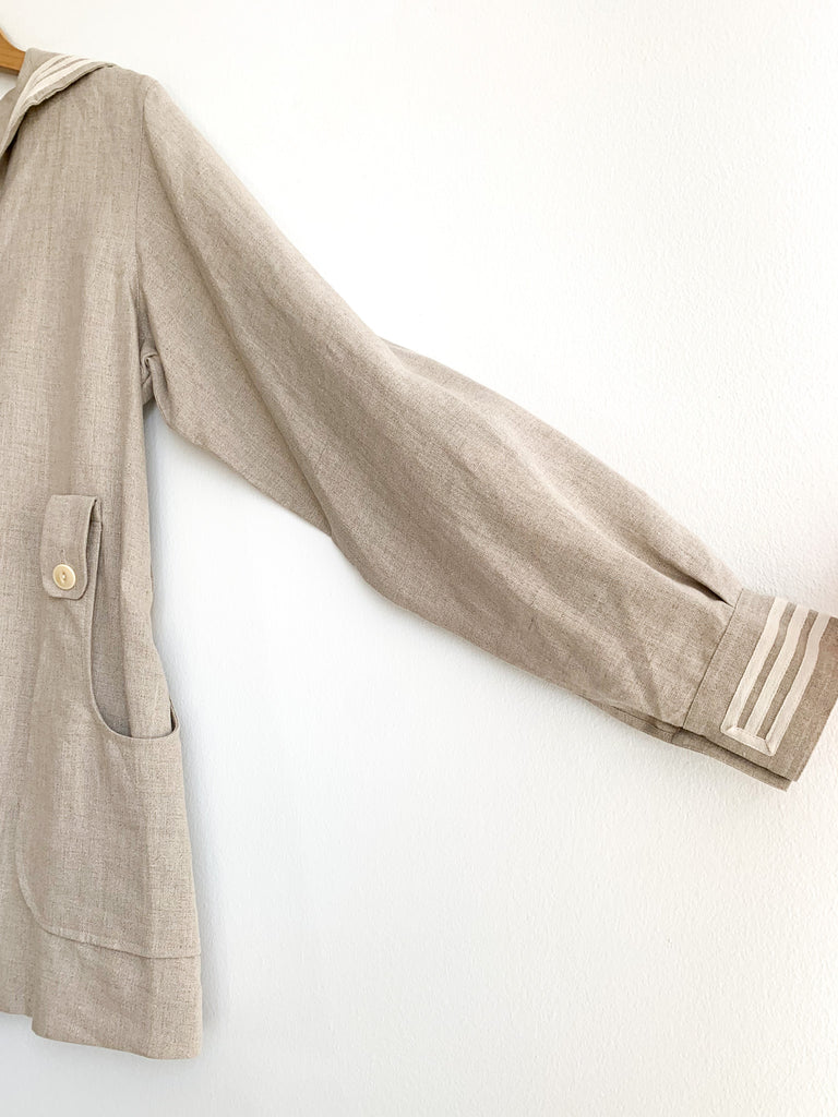 Oatmeal sailor, beach linen top with midi collar and white embroidered contrast stitching. Full side pockets and belt hoops. Looks great with our vintage rope belts.