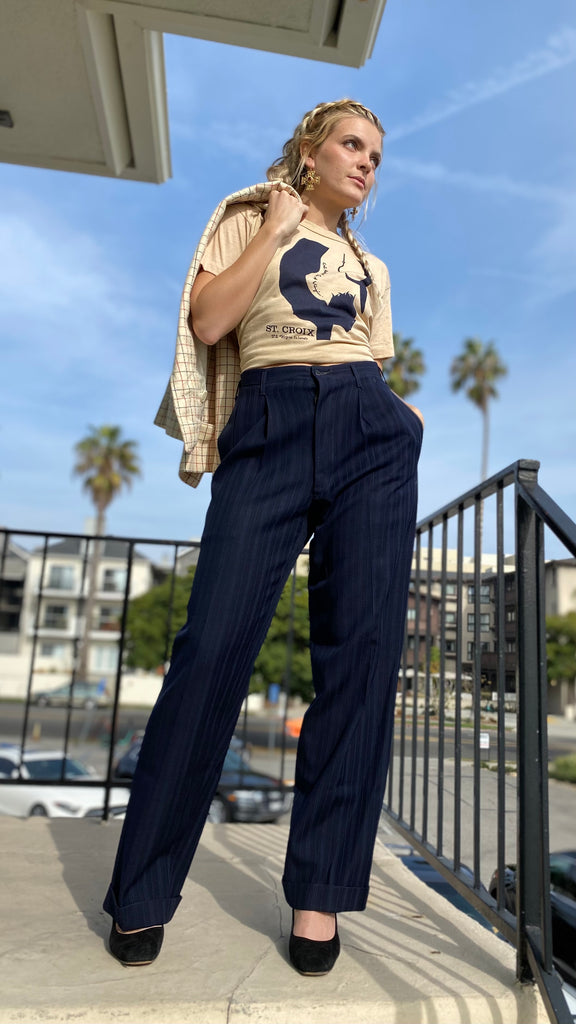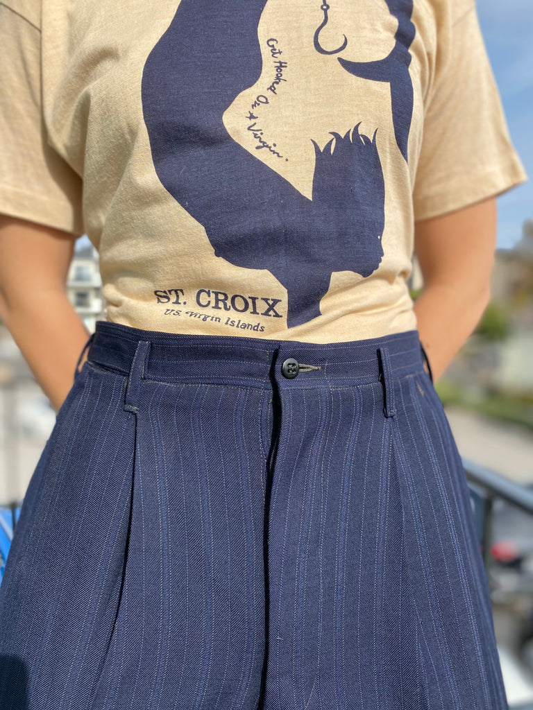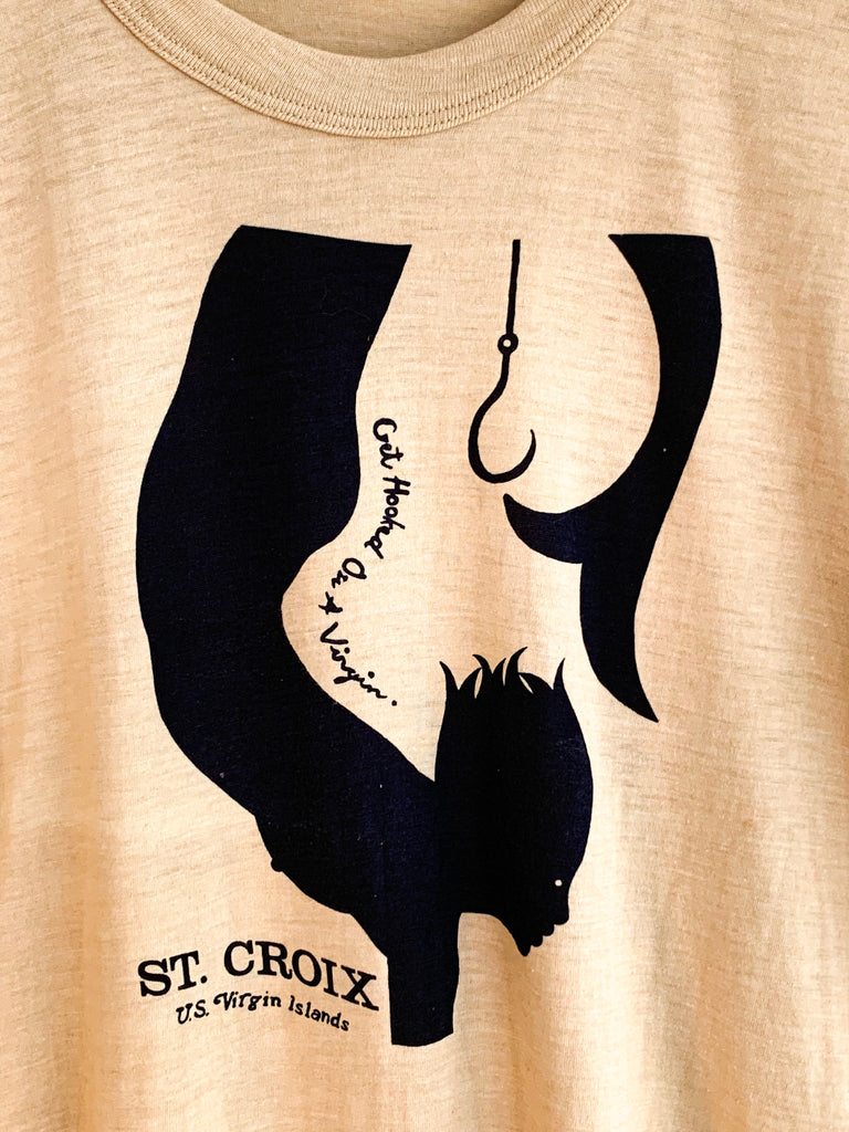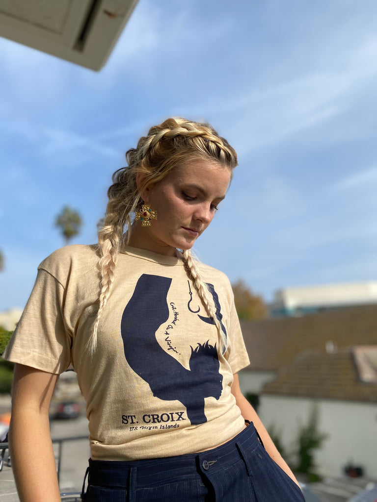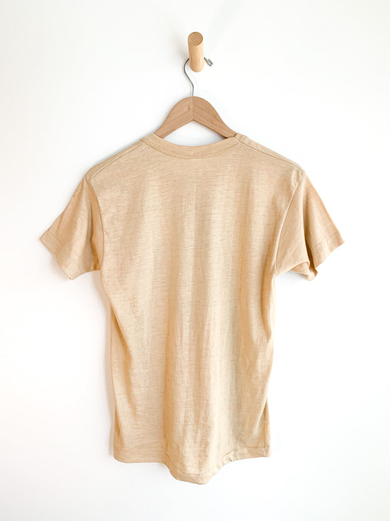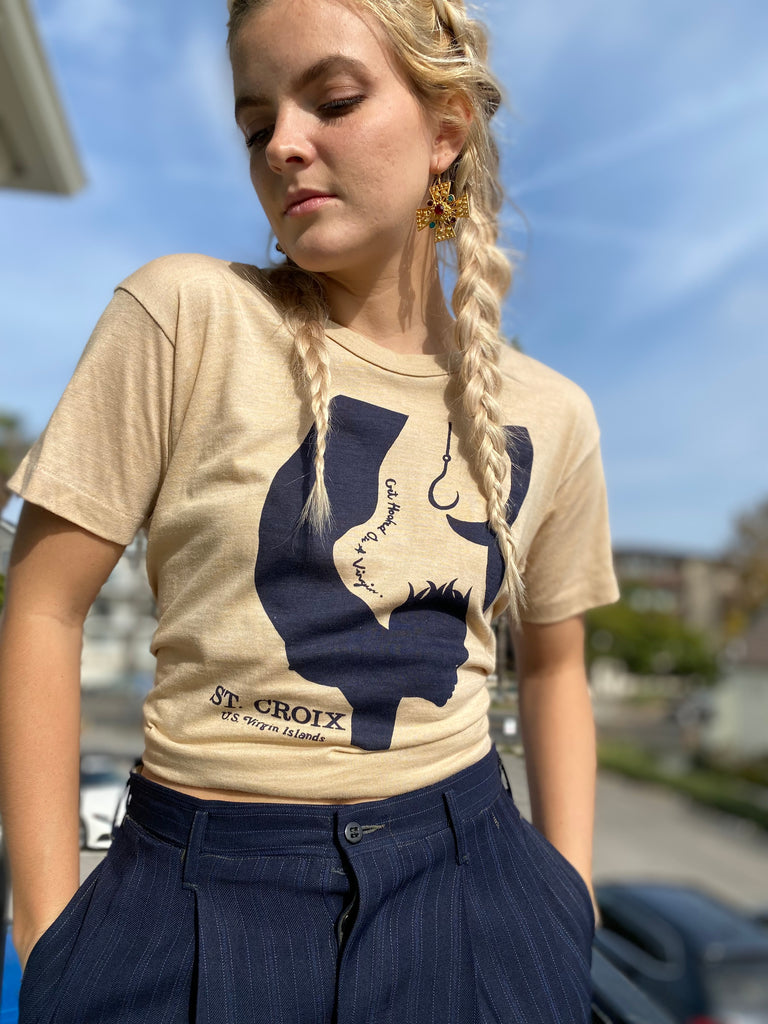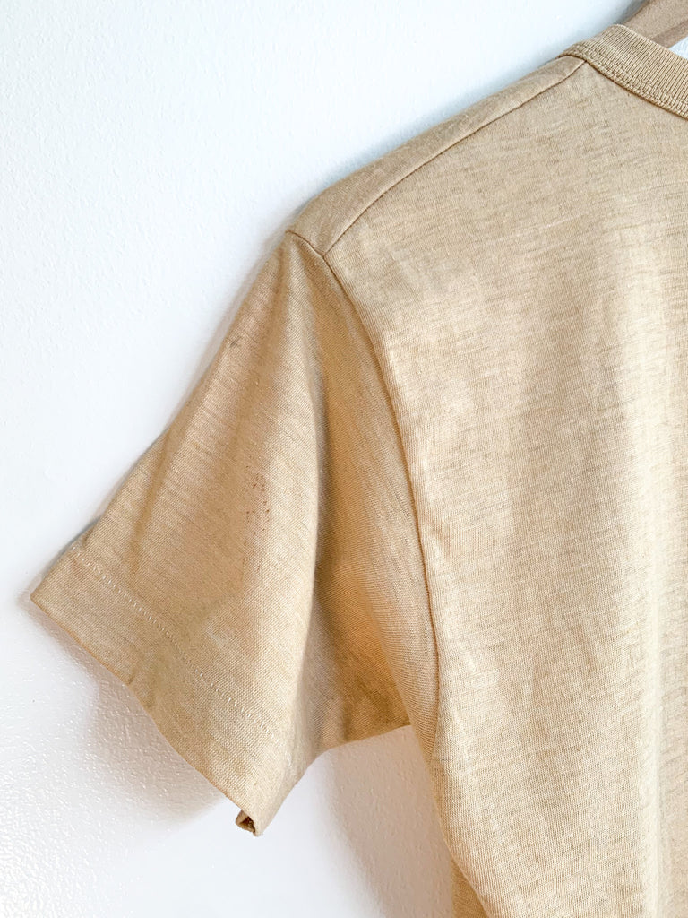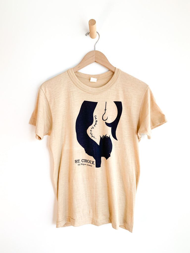Some of the best graphics we’ve seen on a t-shirt. Neutral buff colored background with deep blue screen print. Appears to have been worn only slightly if at all. Soft feel.