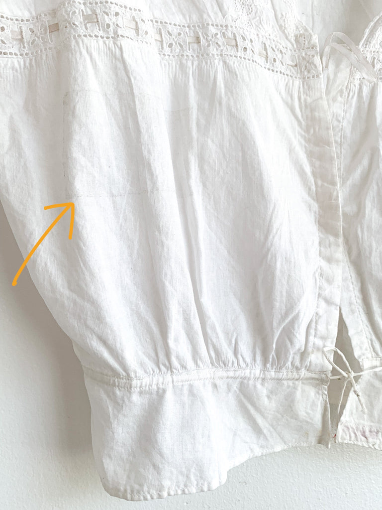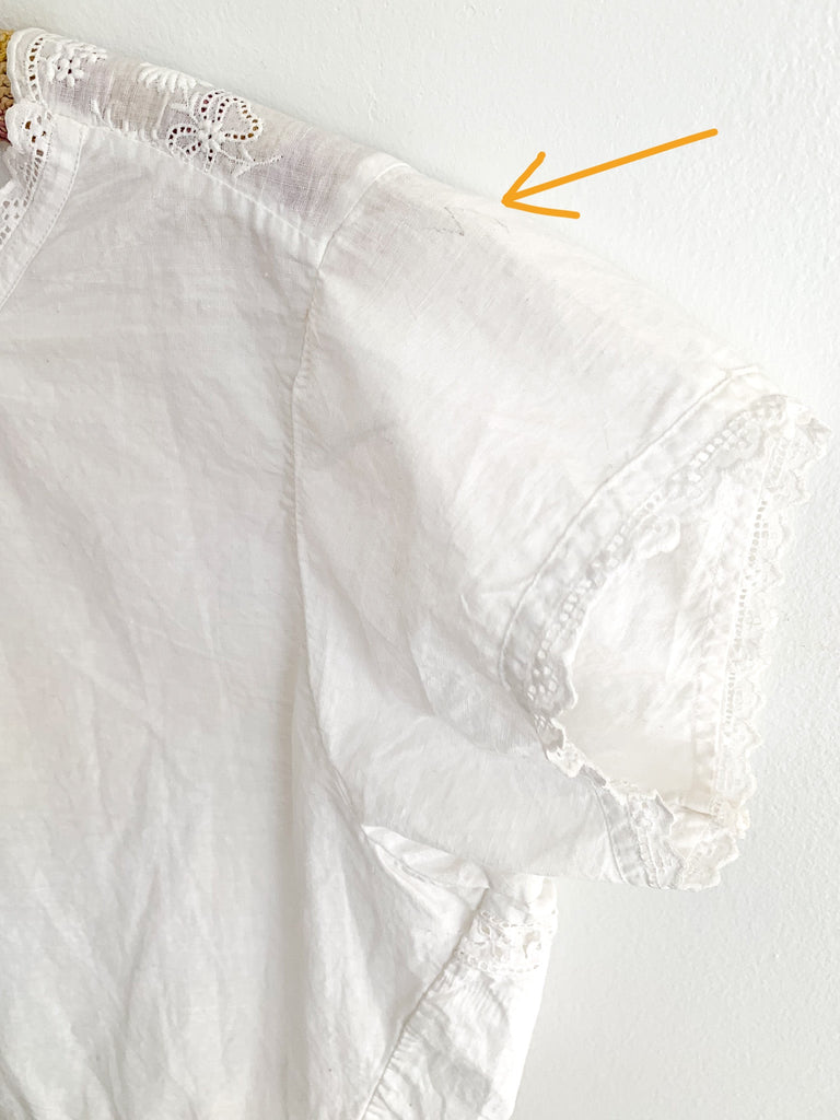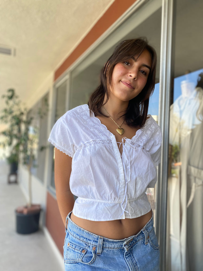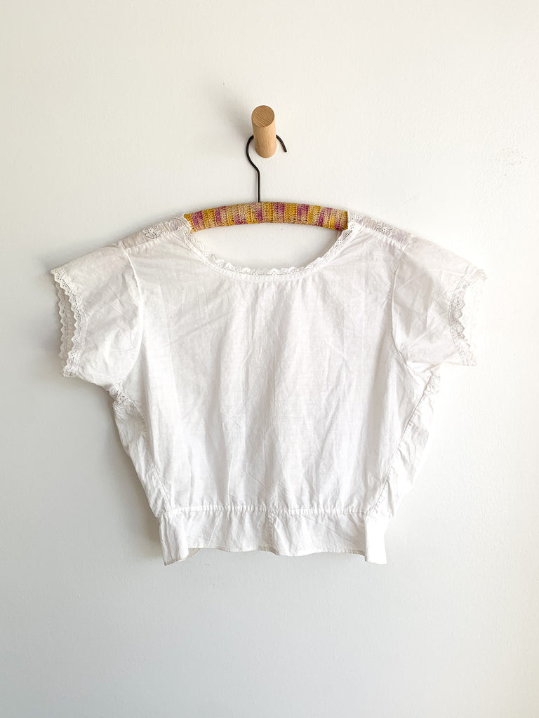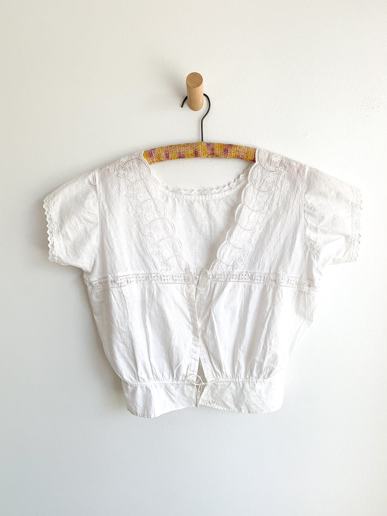 Sweetest antique white cotton and lace blouse. Ties at waist and bust. Bust tie has been replaced with modern ribbon.