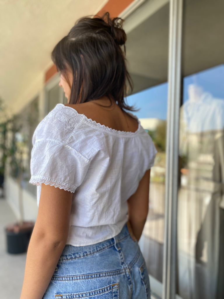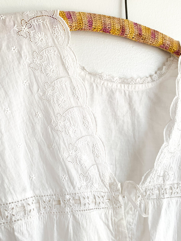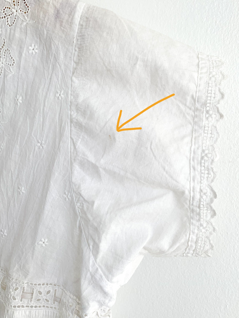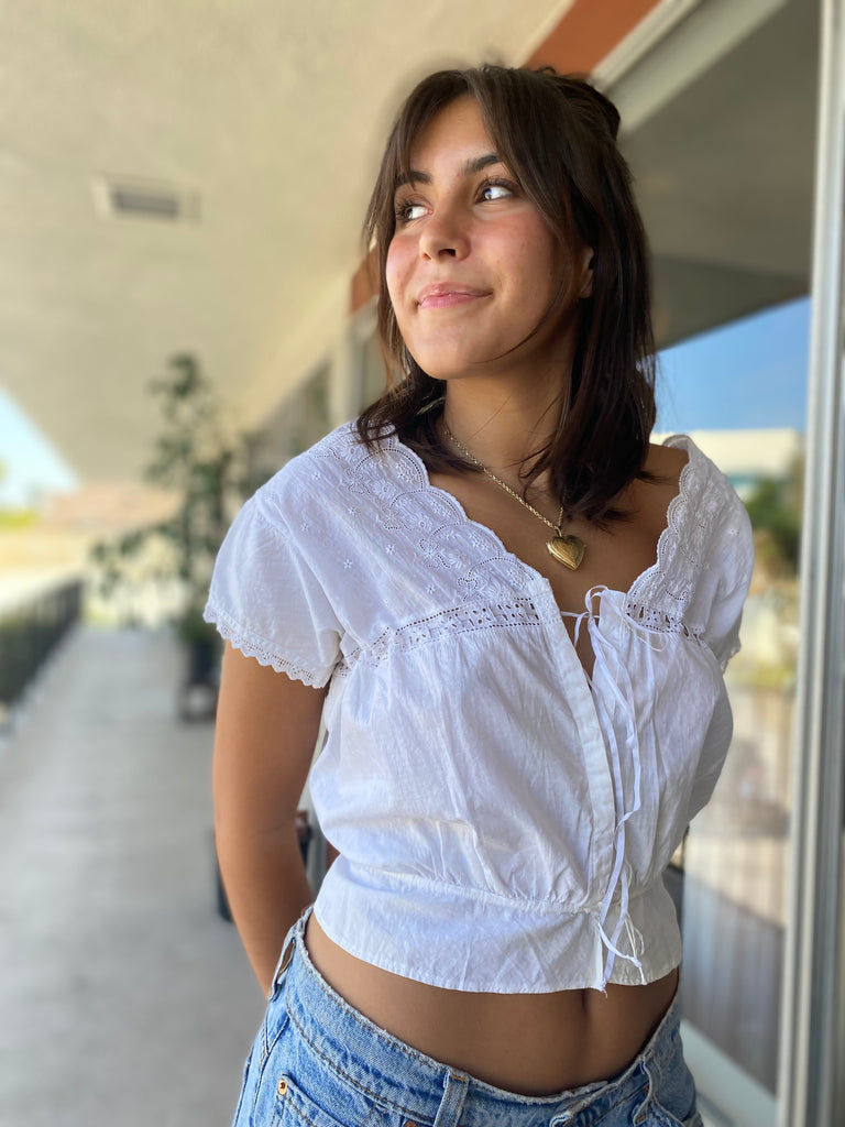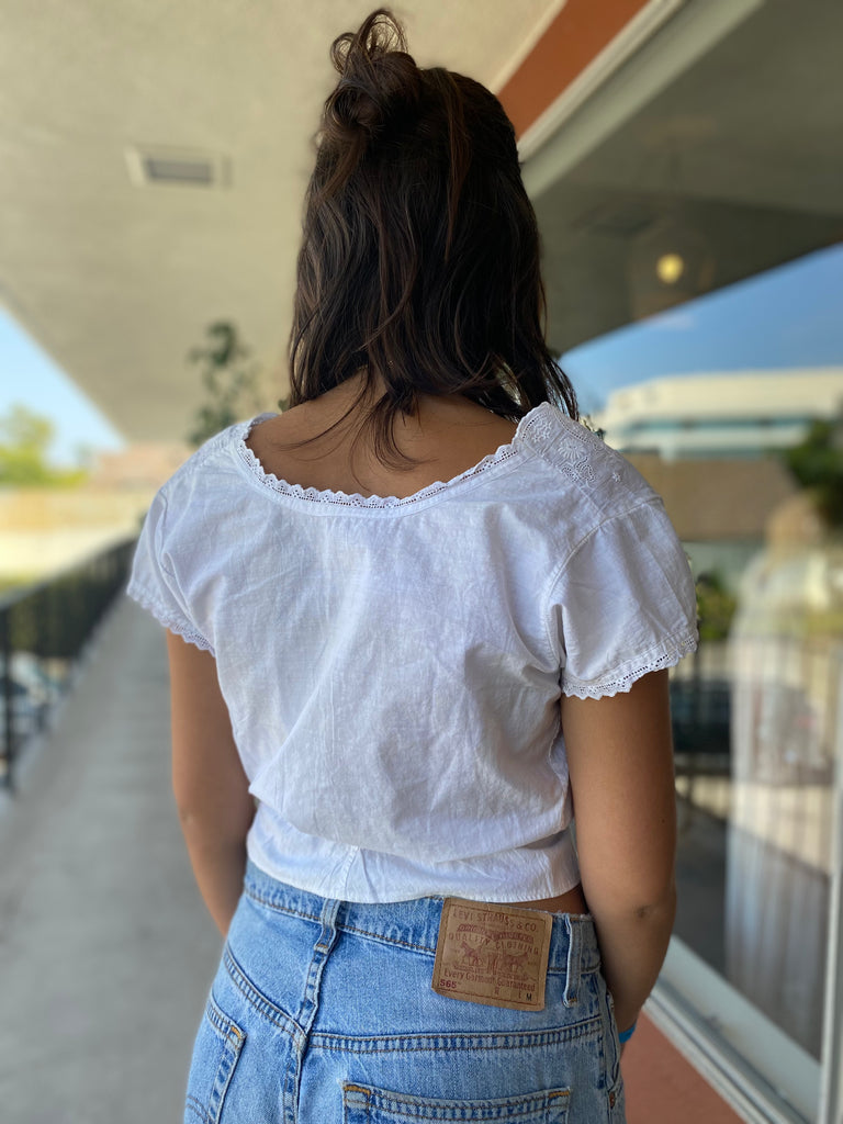 Sweetest antique white cotton and lace blouse. Ties at waist and bust. Bust tie has been replaced with modern ribbon.