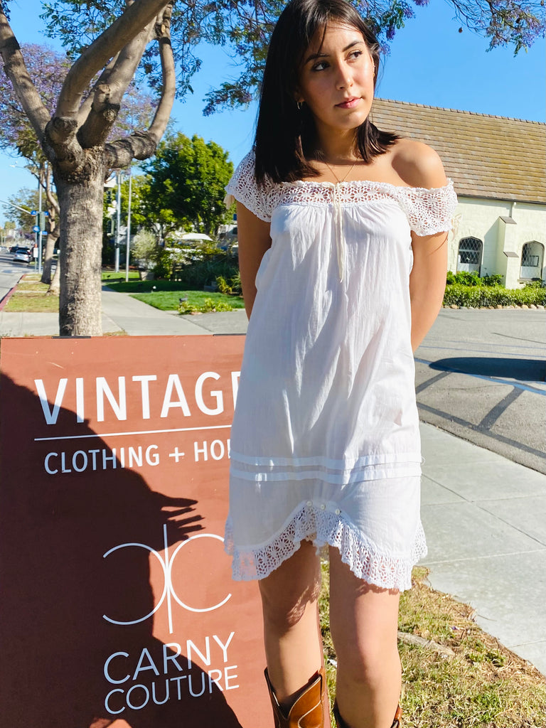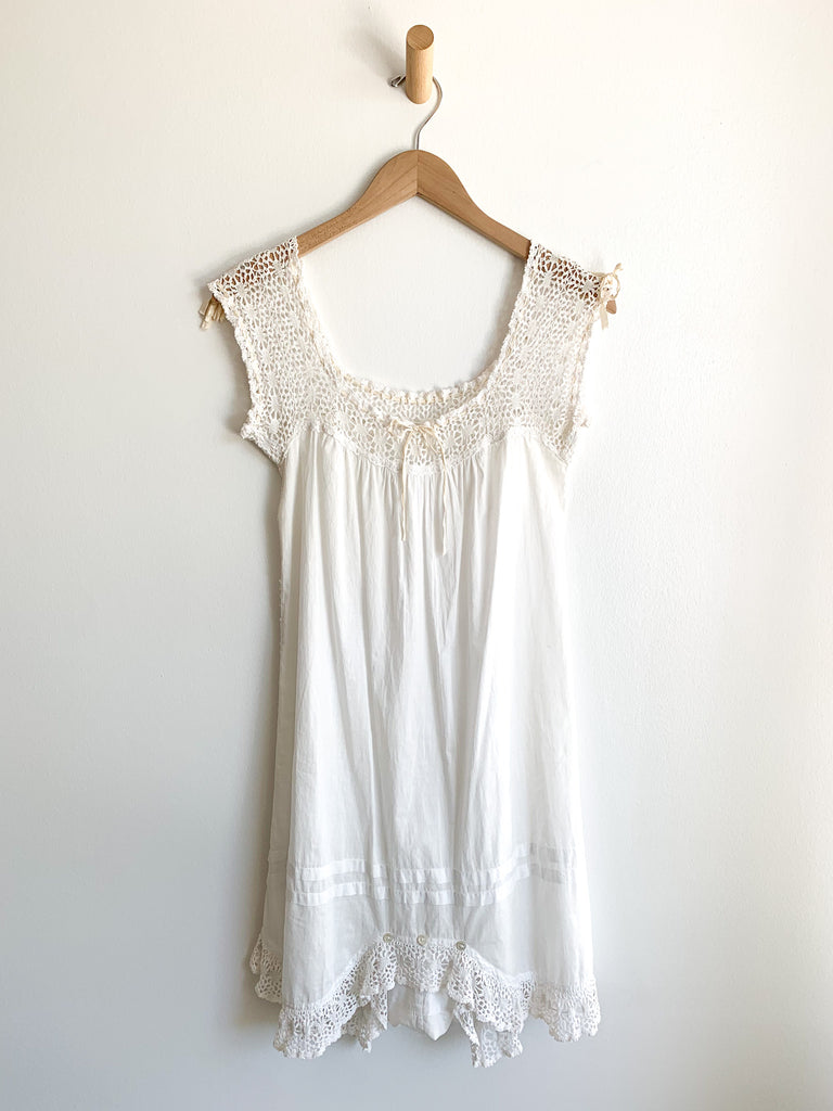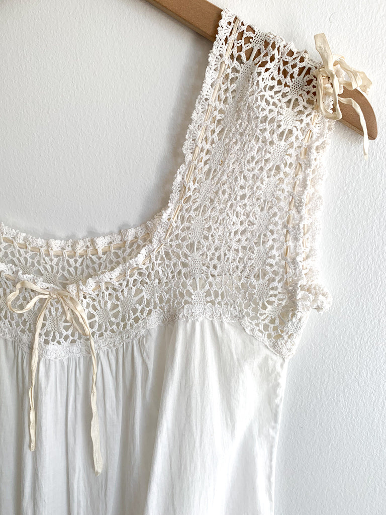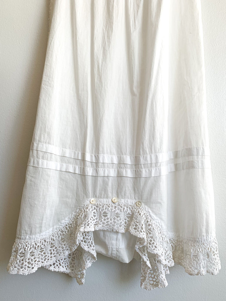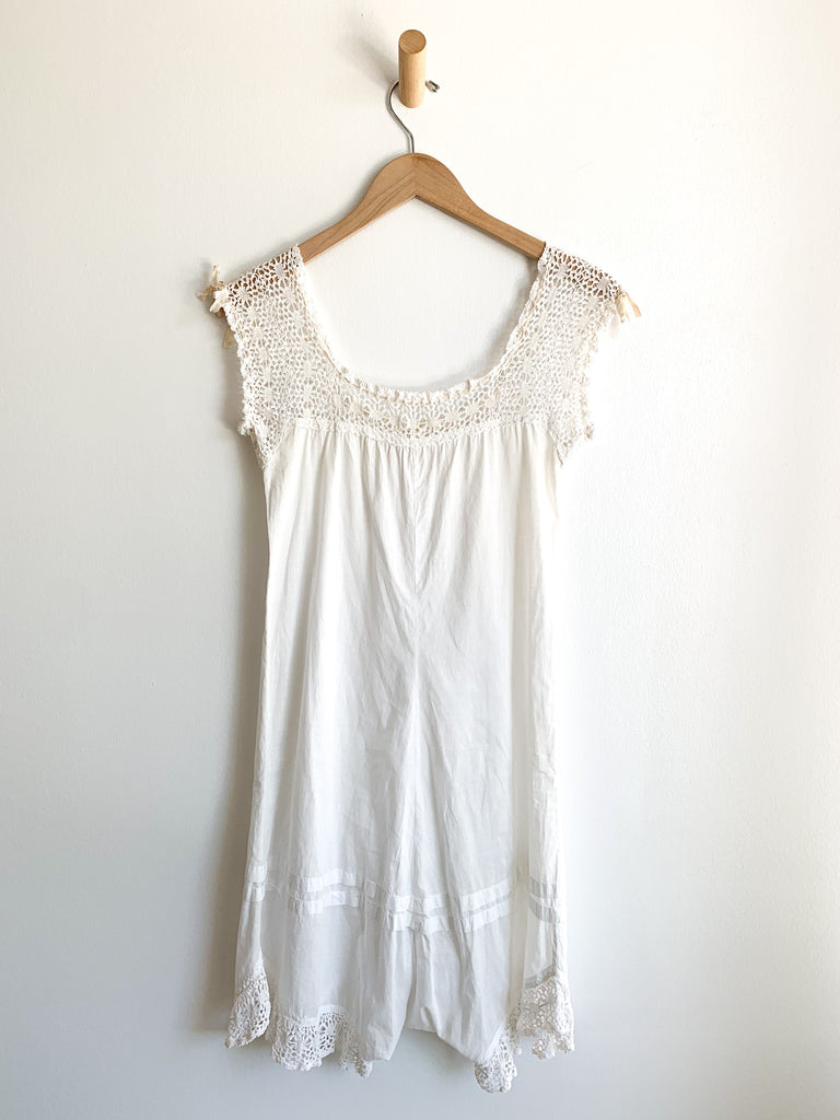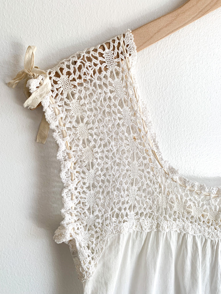 Crochet lace and cotton step-in or onesie. 1910-20’s. Buttons at bottom. Delicate silk ribbon at arms and neckline.