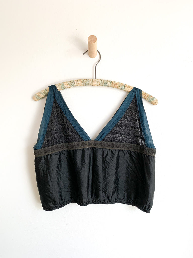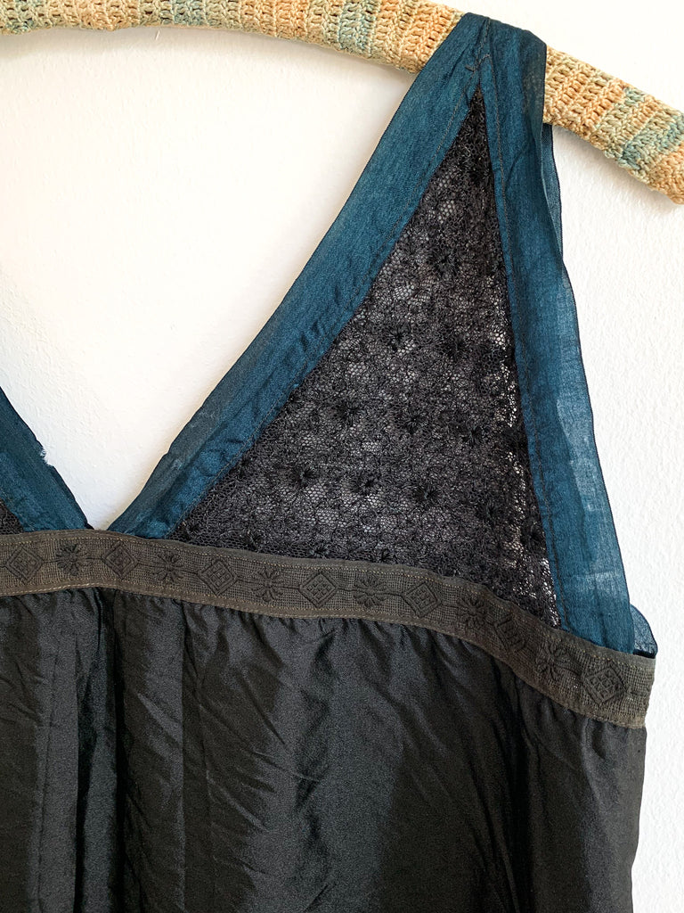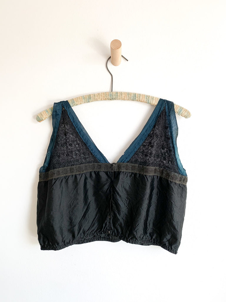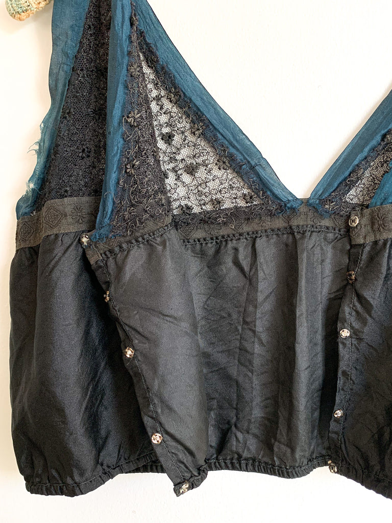 1910/20’s delicate black & teal silk and lace camisole top. Antique condition yet very wearable. Snap front closure.