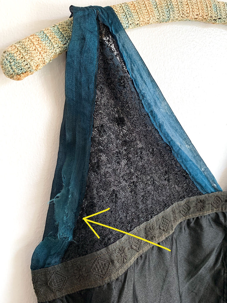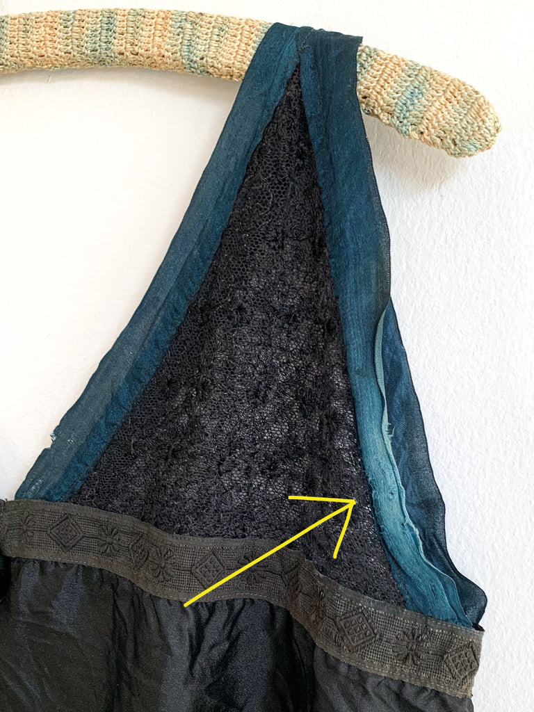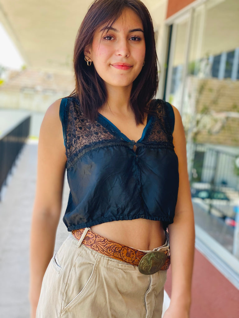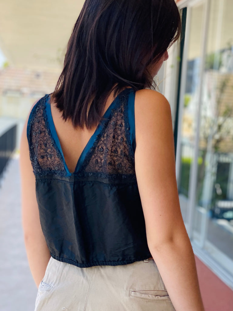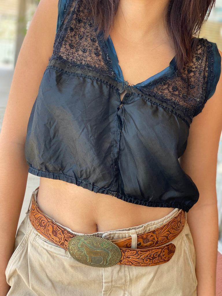 1910/20’s delicate black & teal silk and lace camisole top. Antique condition yet very wearable. Snap front closure.