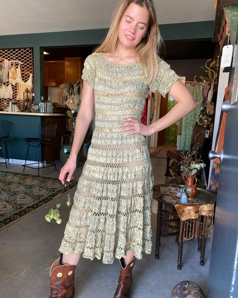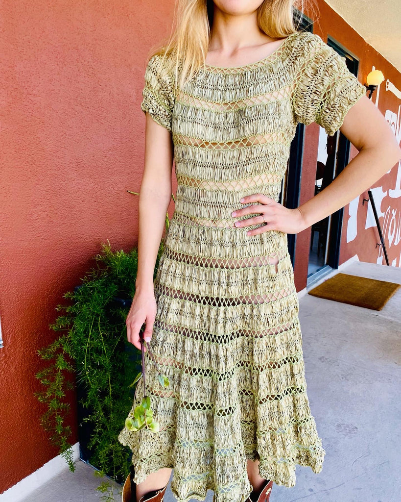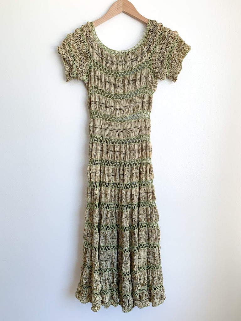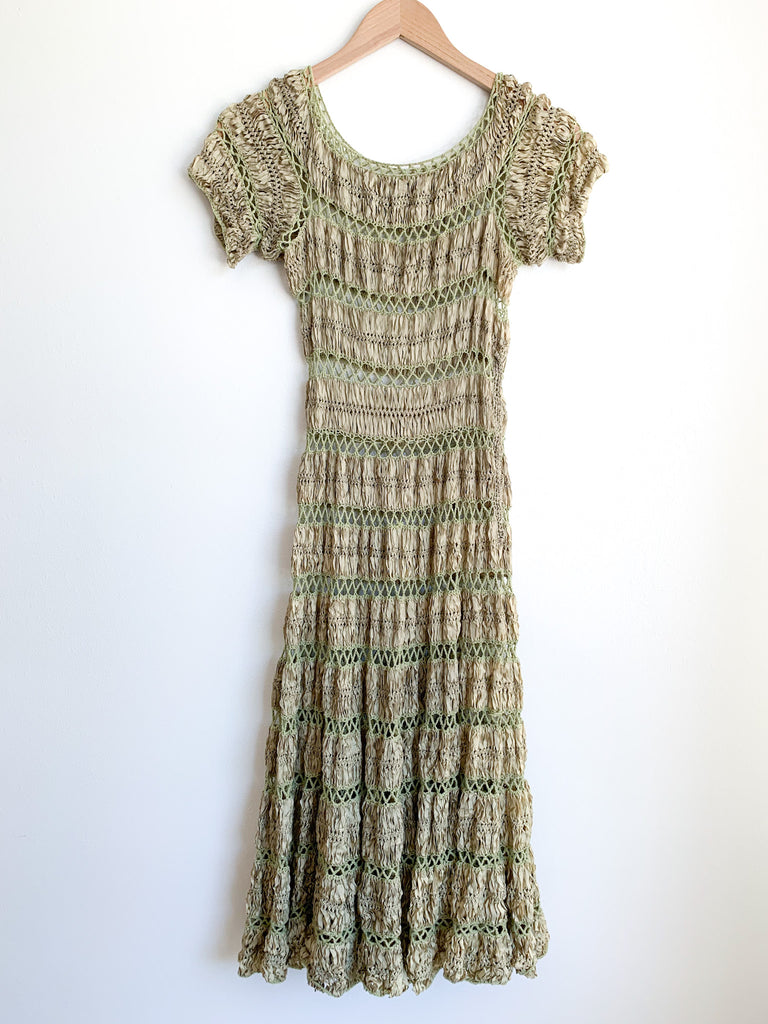 Crochet style ribbon dress from 1940-50’s in the prettiest dusty sage green. Nipped waist, scooped neckline, sweeping skirt and buttons at side. Some stretch.