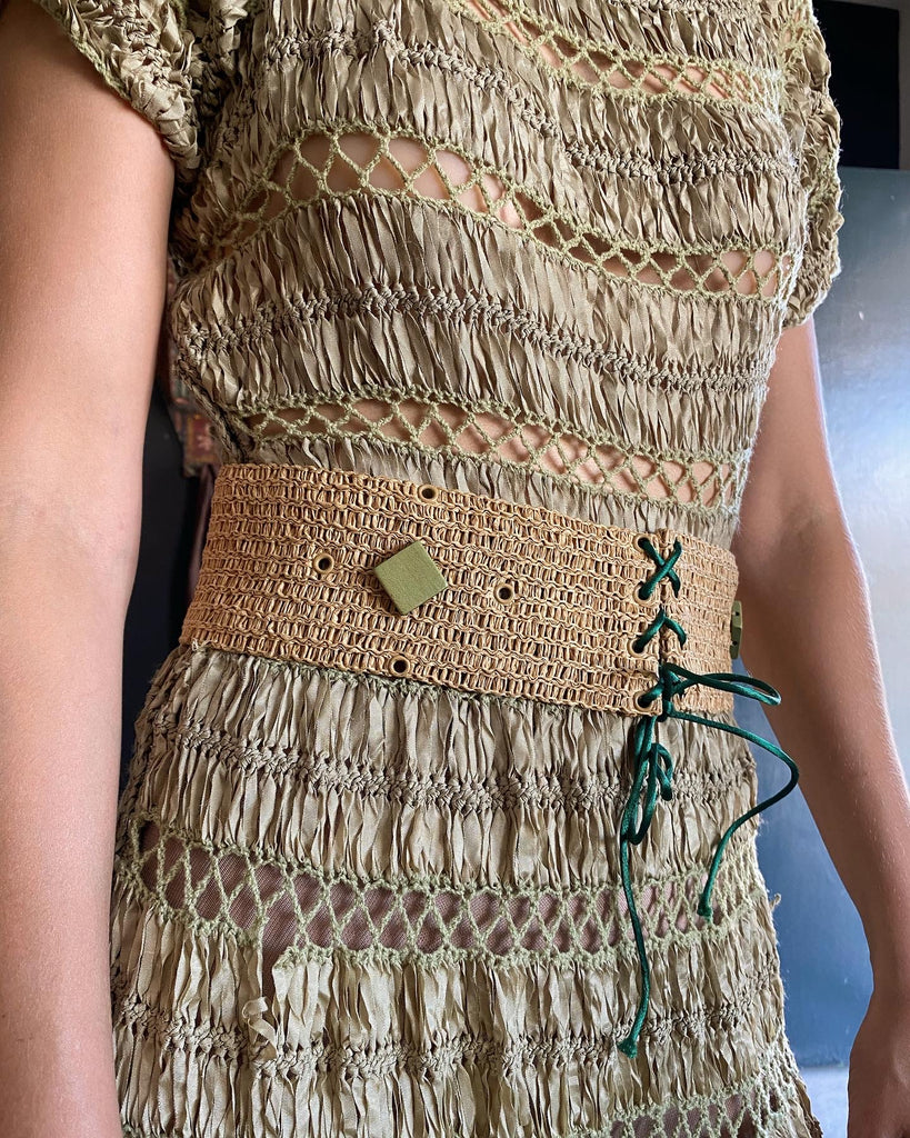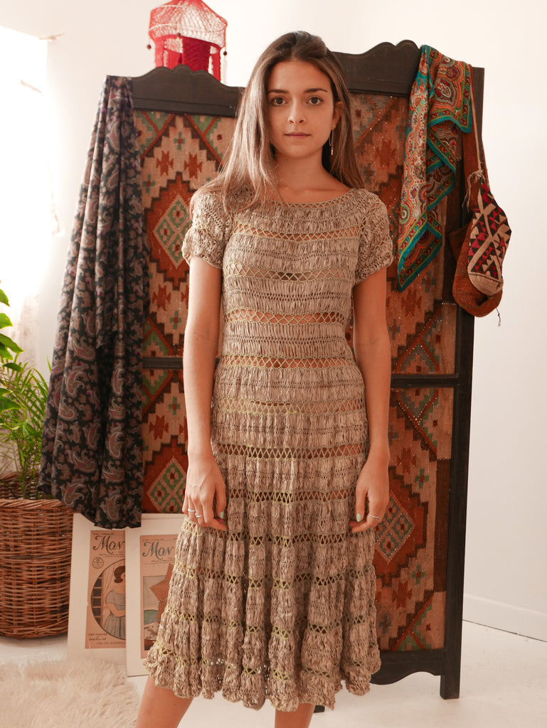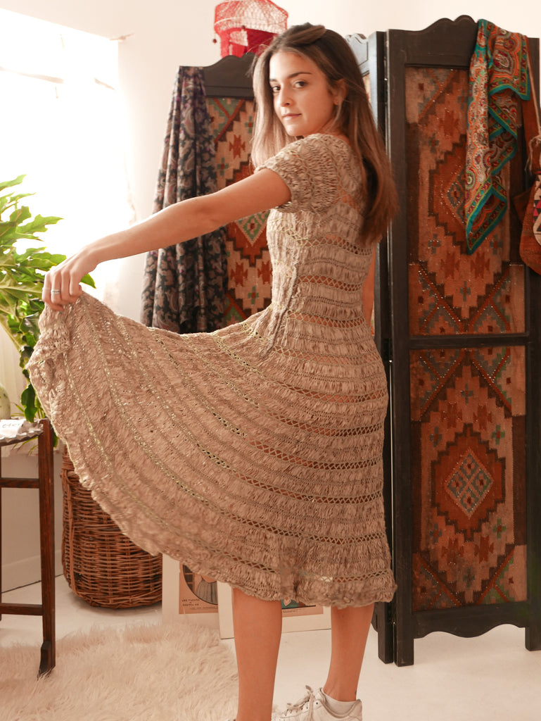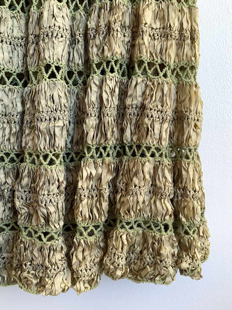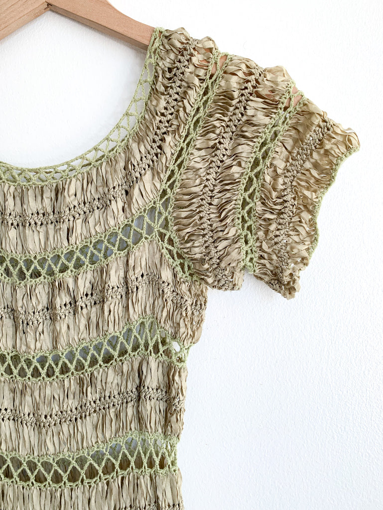 Crochet style ribbon dress from 1940-50’s in the prettiest dusty sage green. Nipped waist, scooped neckline, sweeping skirt and buttons at side. Some stretch.