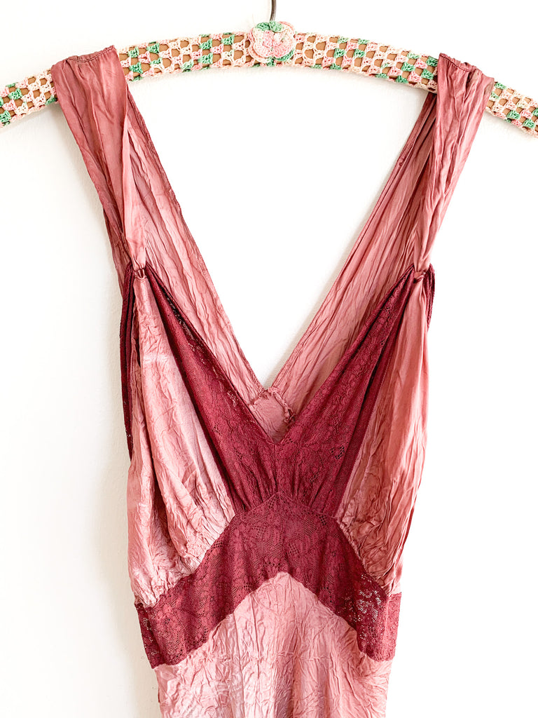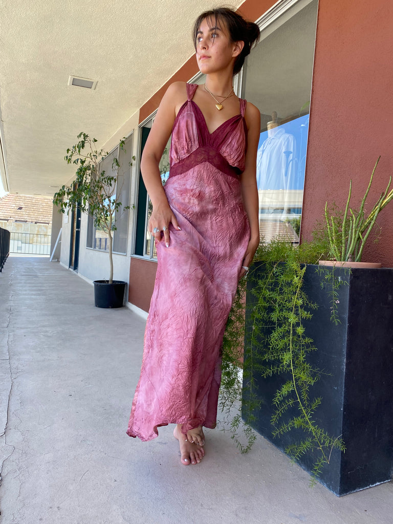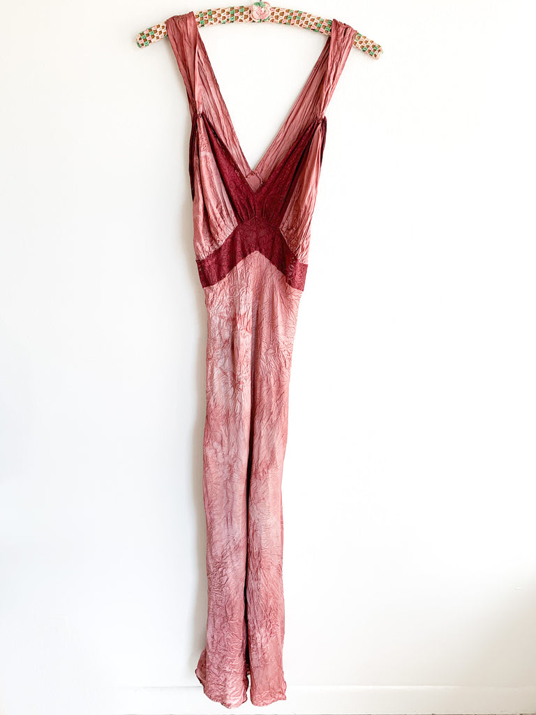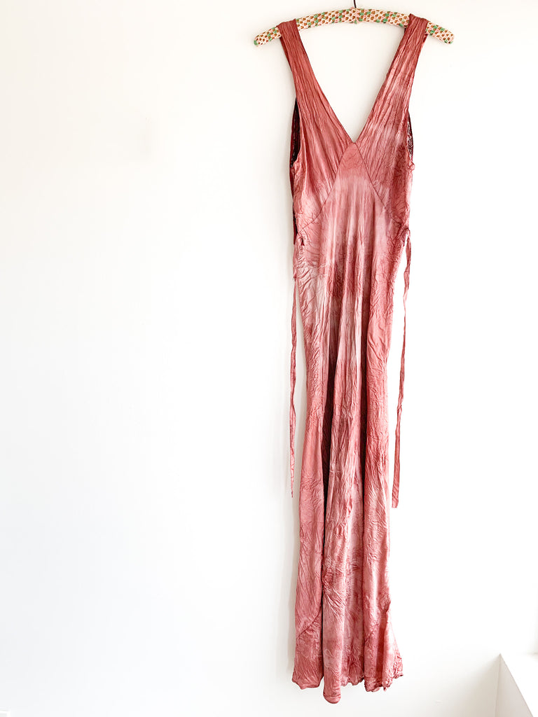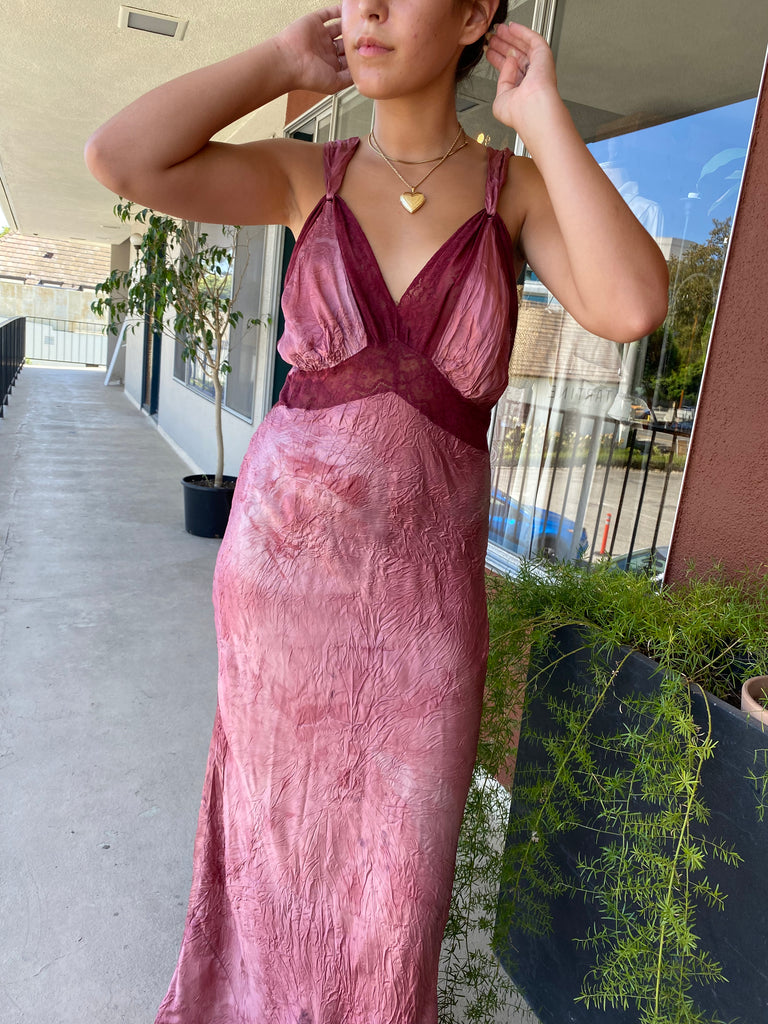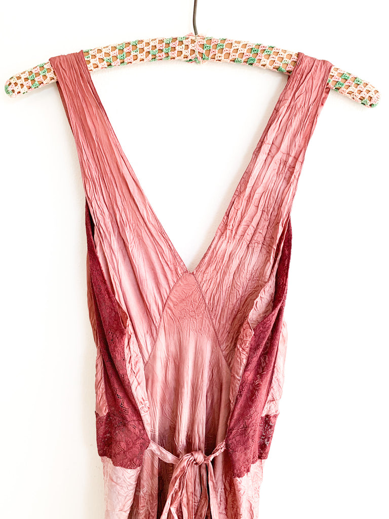 Hand dyed posey colored satin slip dress with lace detailing. Tie at back.