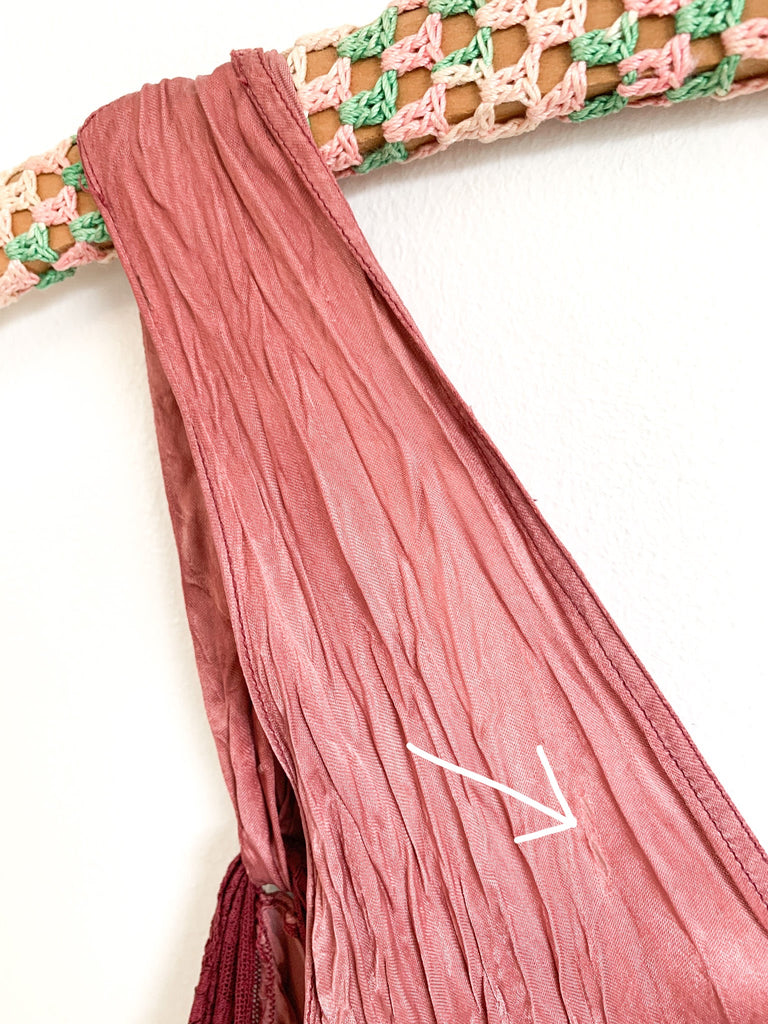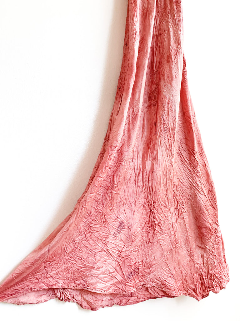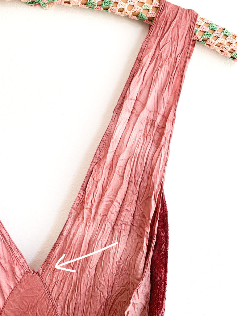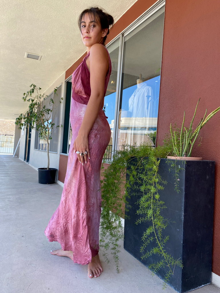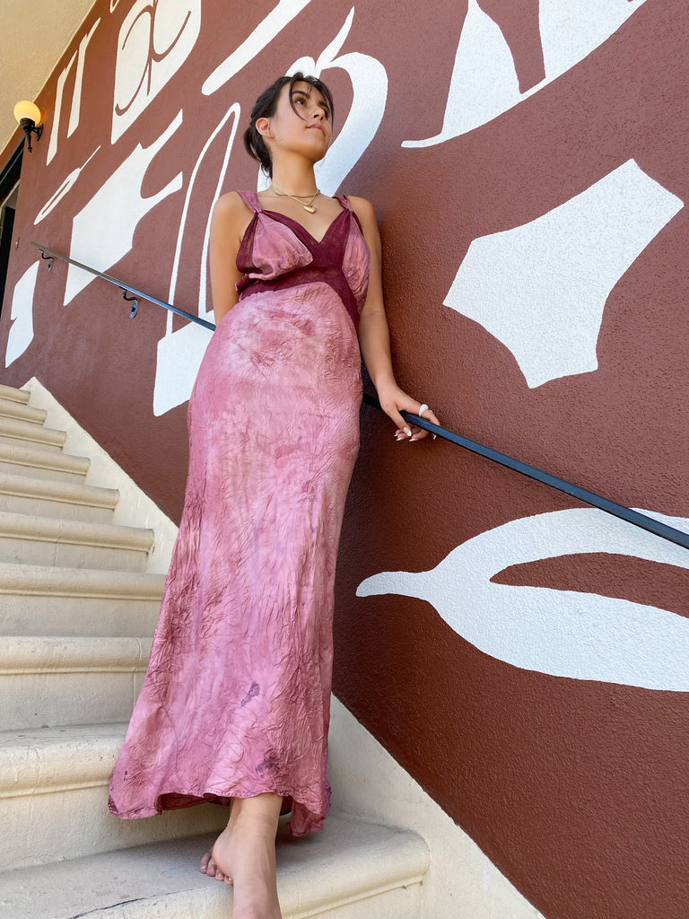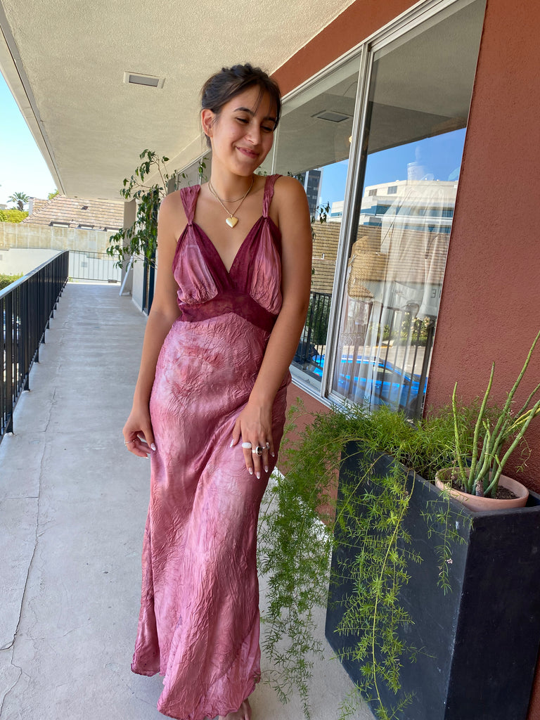 Hand dyed posey colored satin slip dress with lace detailing. Tie at back.