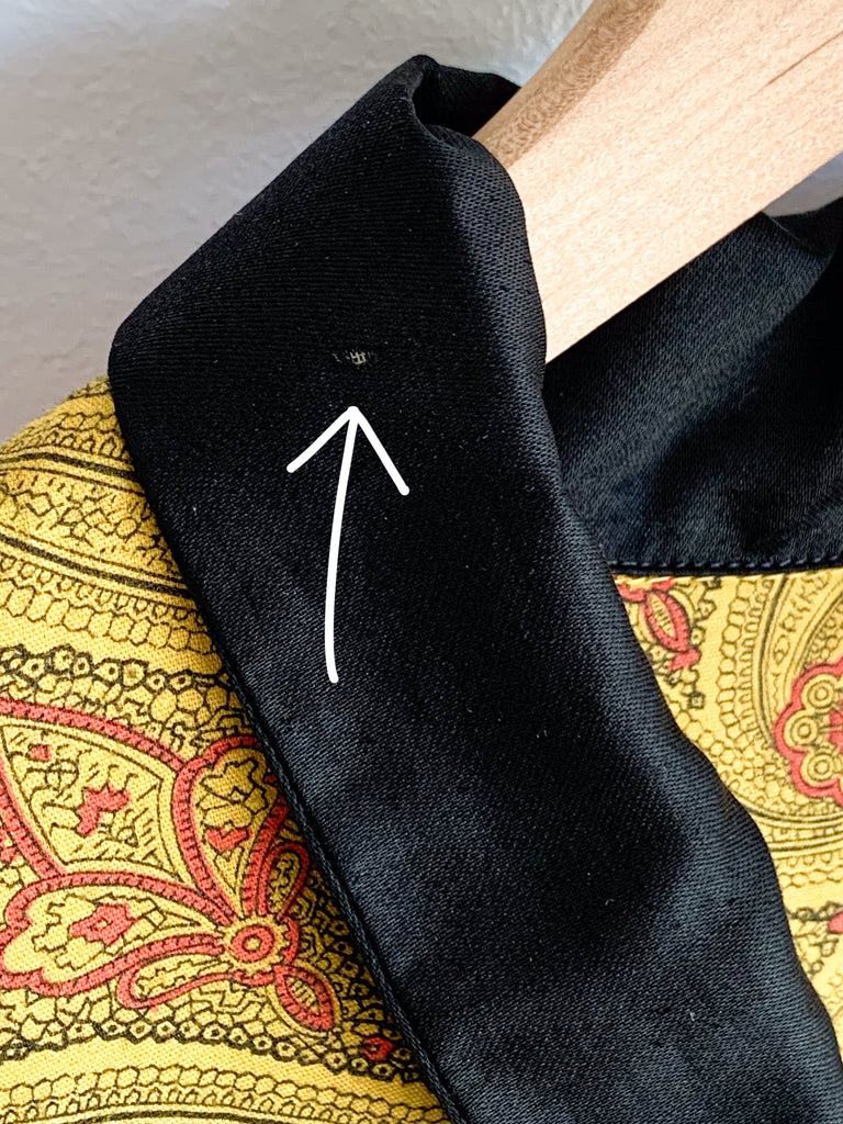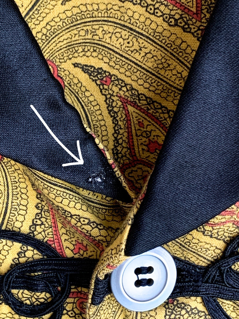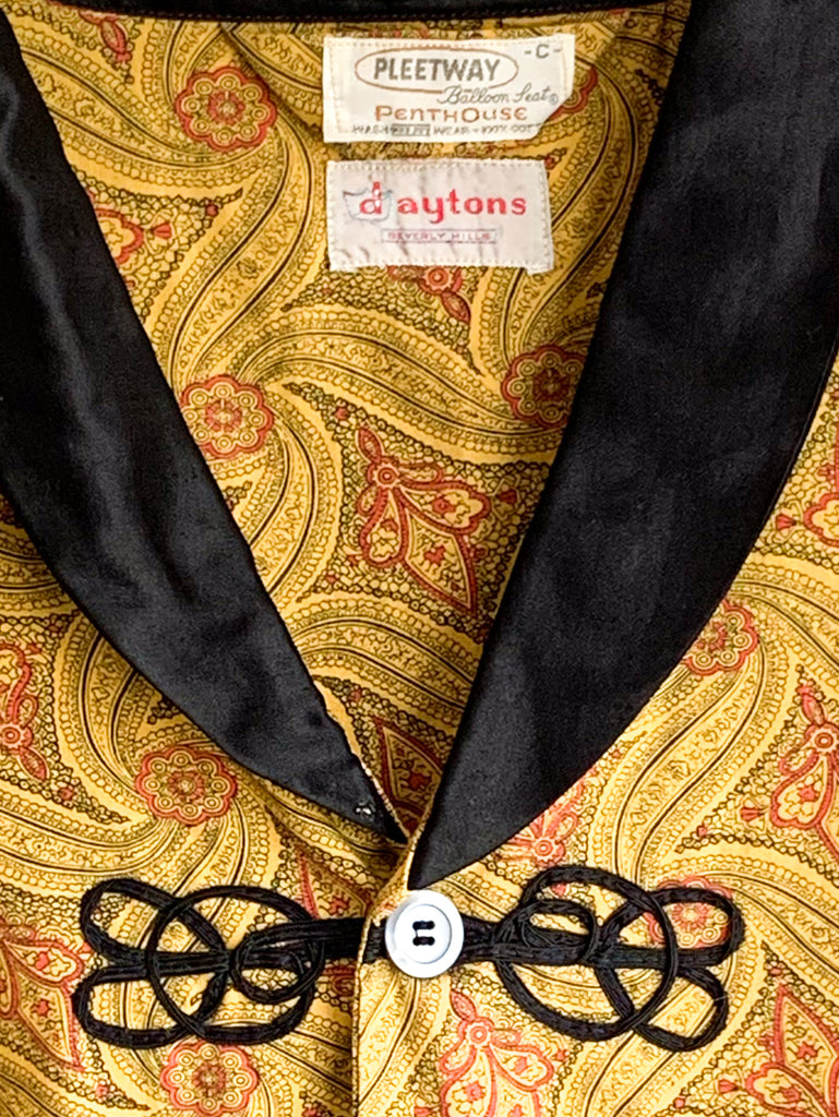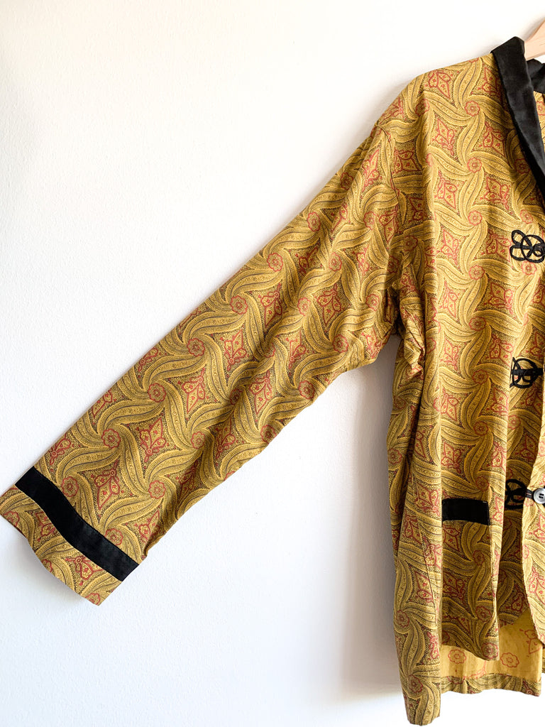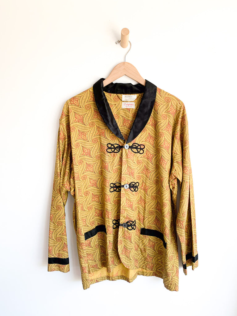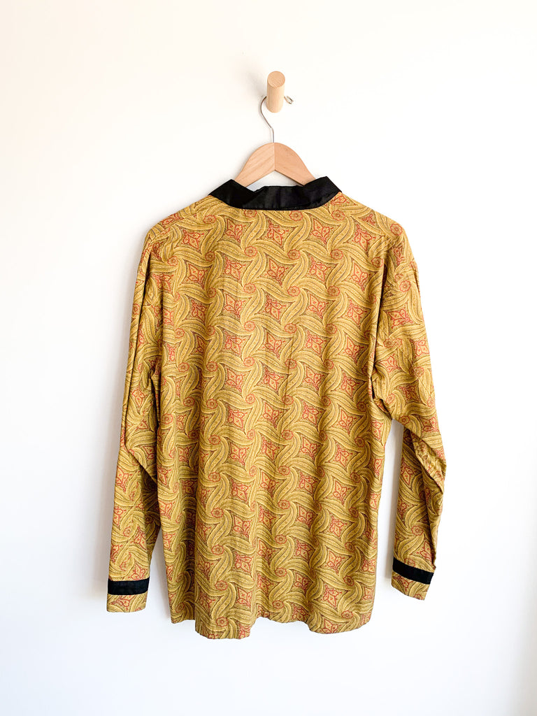 Gorgeous heavily detailed printed cotton pajama top with black collar and details around buttons pockets and sleeves. Yellow, black and red.