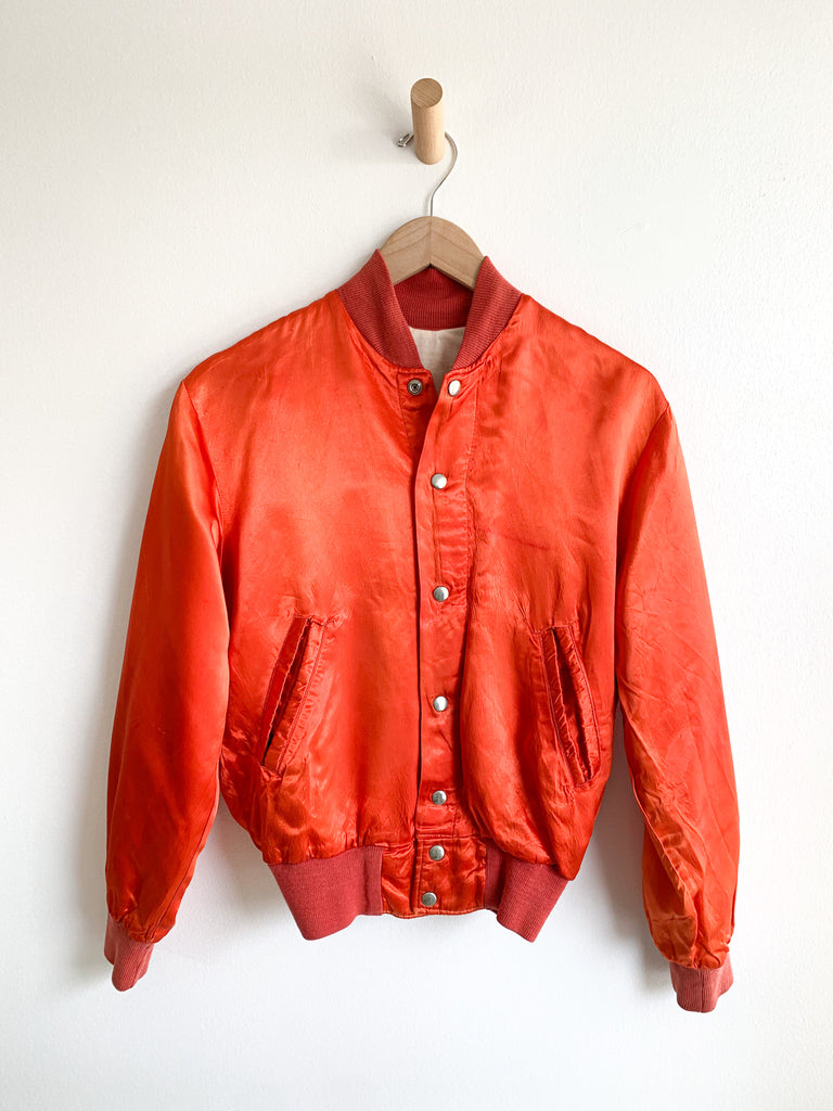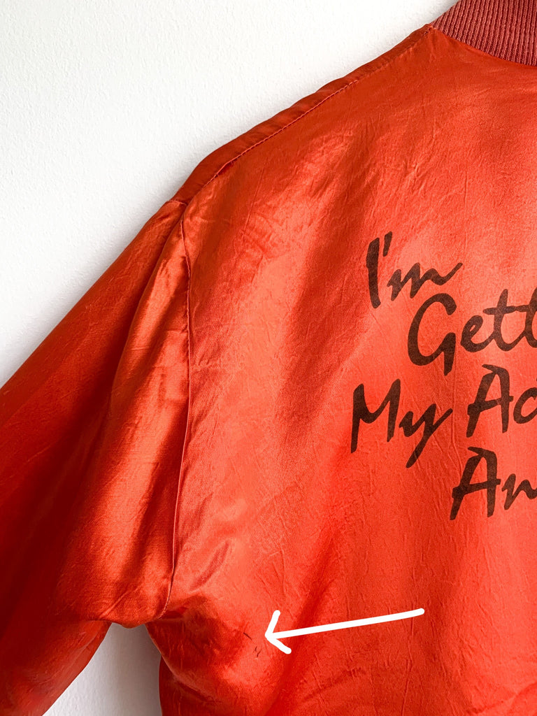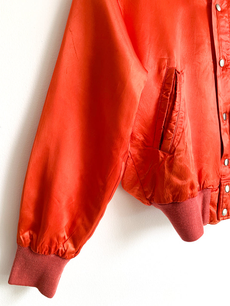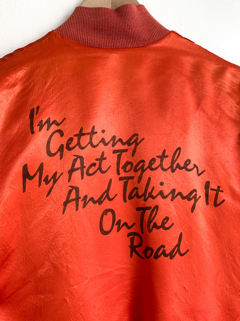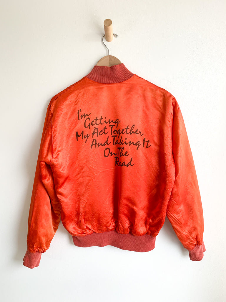 From the off-Broadway musical production "I'm Getting My Act Together and Taking It on the Road" that ran from 1978 to 1981. Great vibrant sheen on this orange satin jacket. Snaps and elastic in very good condition.