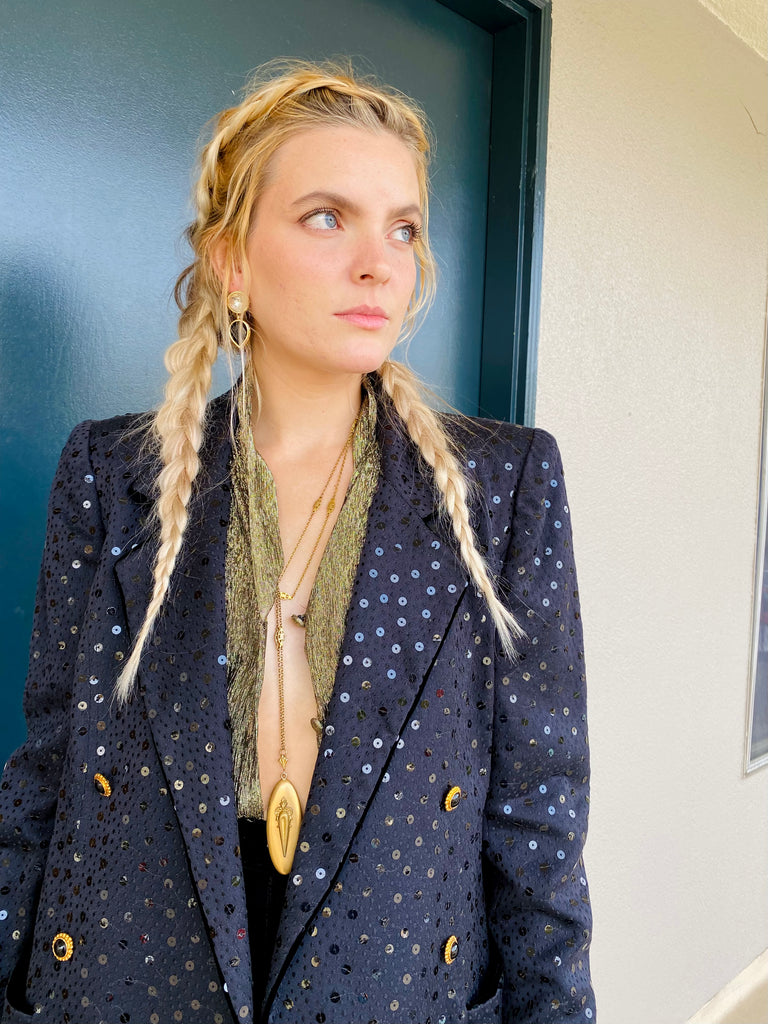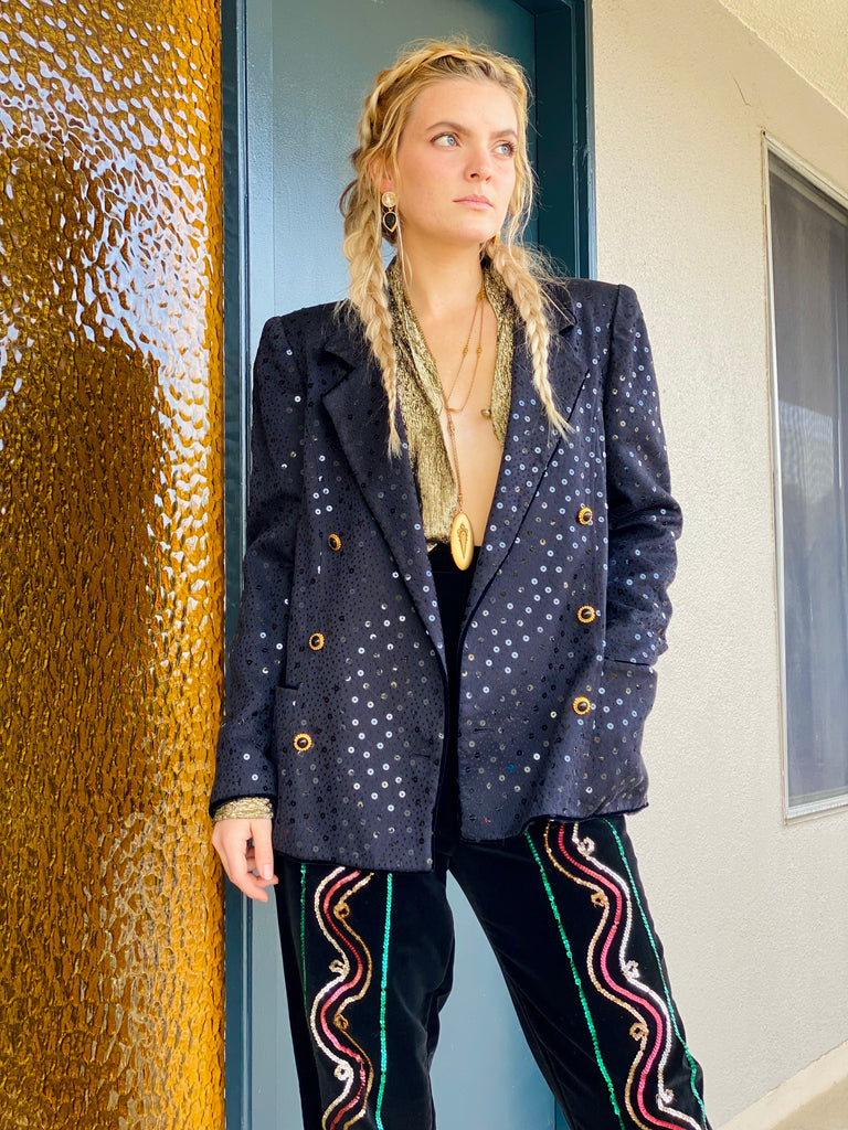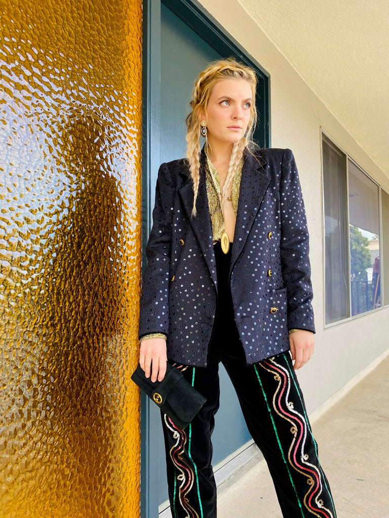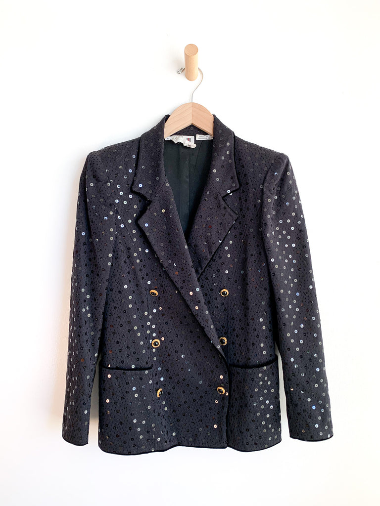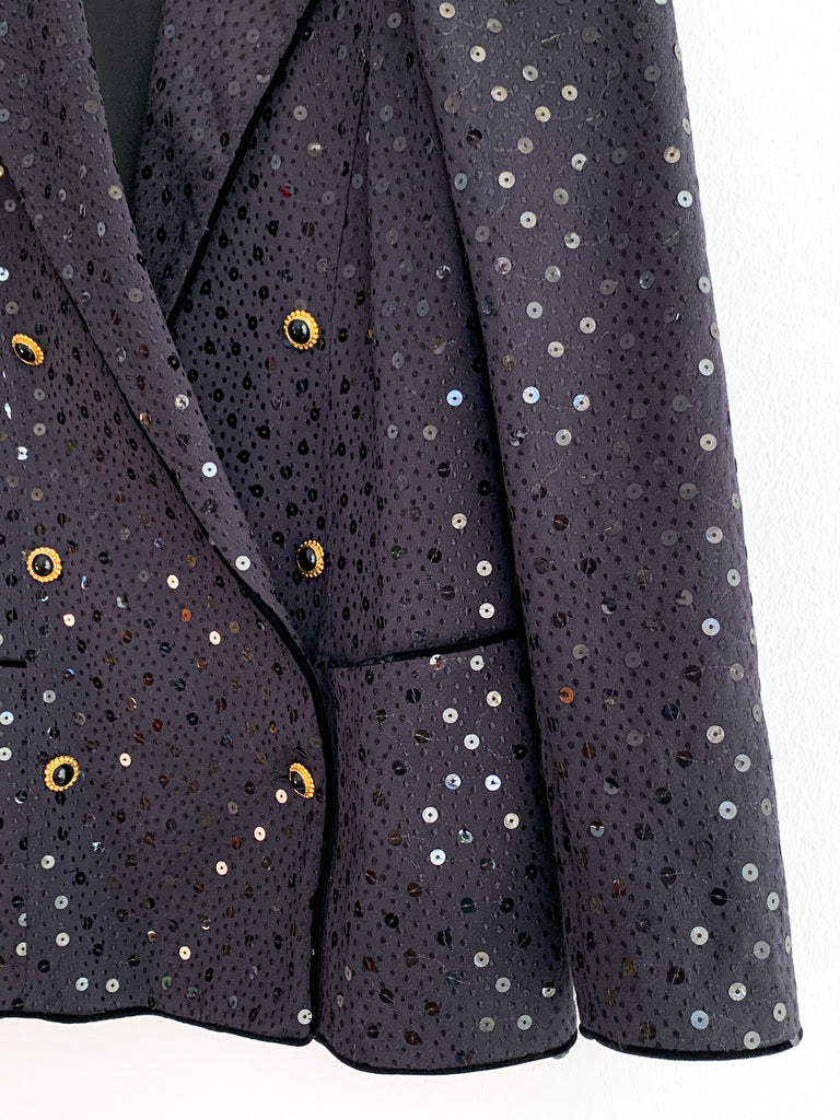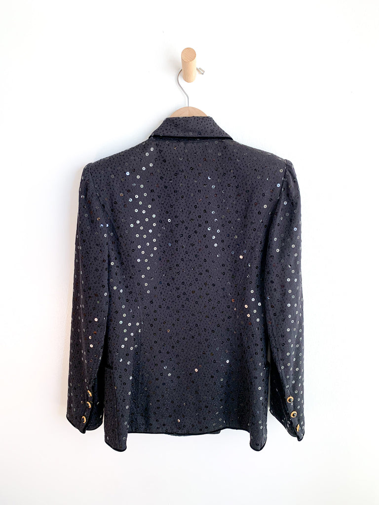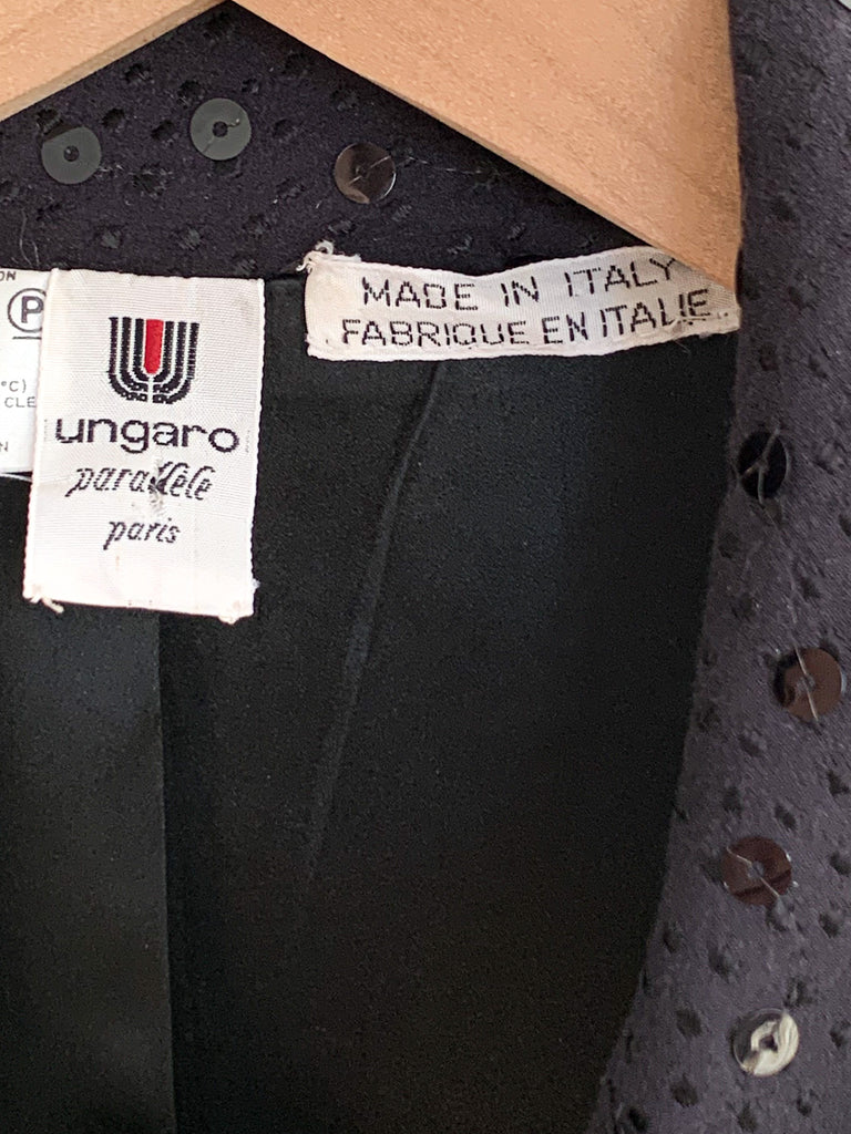 Beautiful construction on this black sequin double breasted blazer by Ungaro. Nice fit through shoulders and great gold and black buttons.