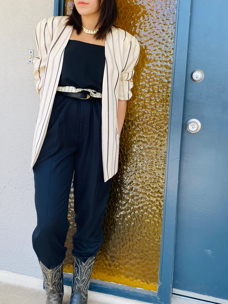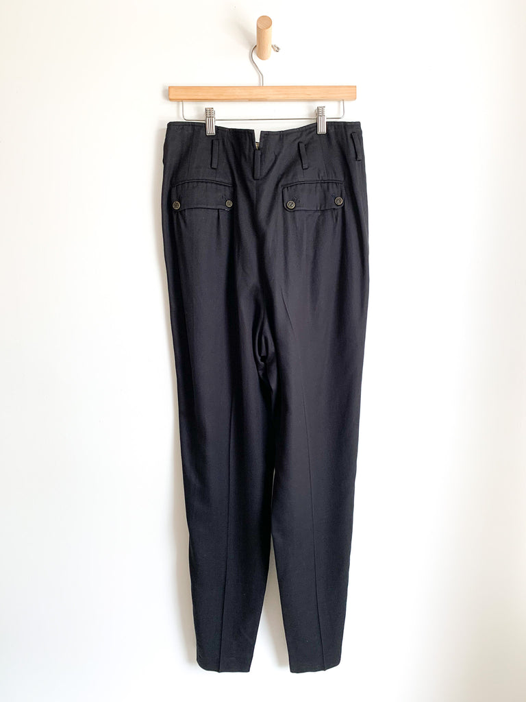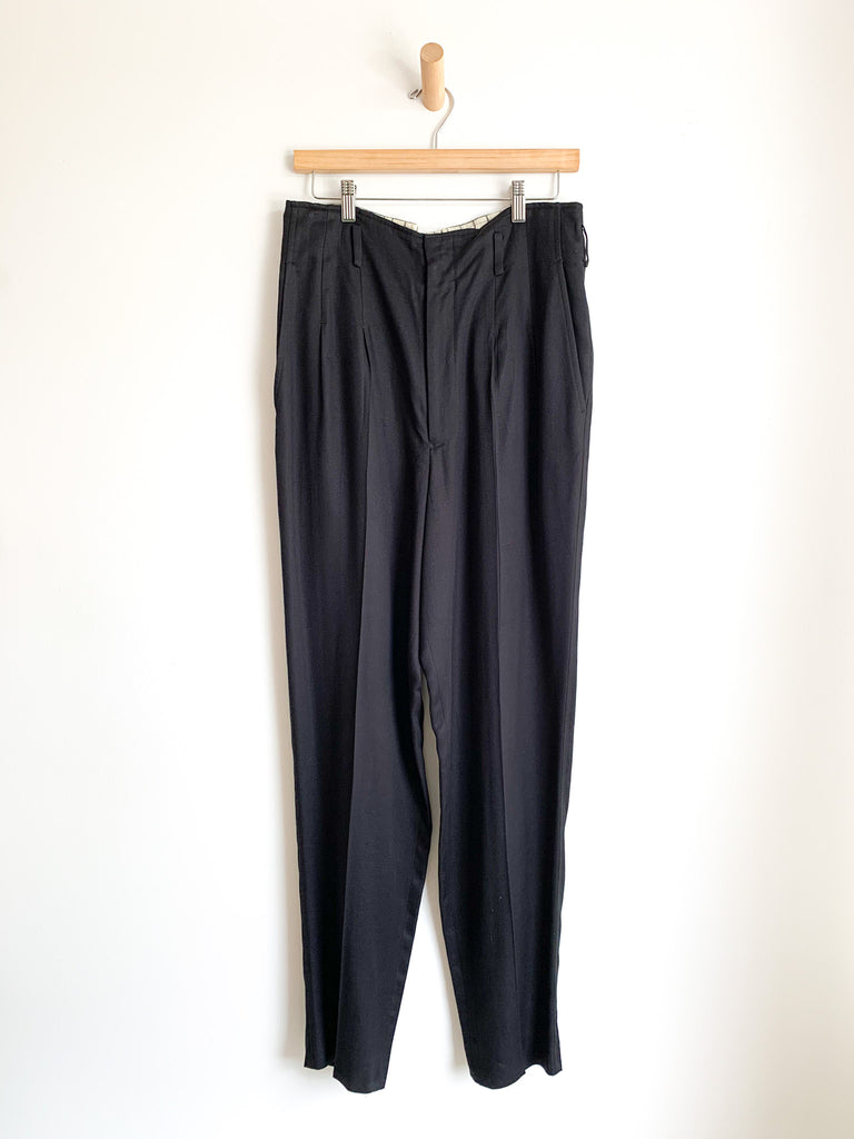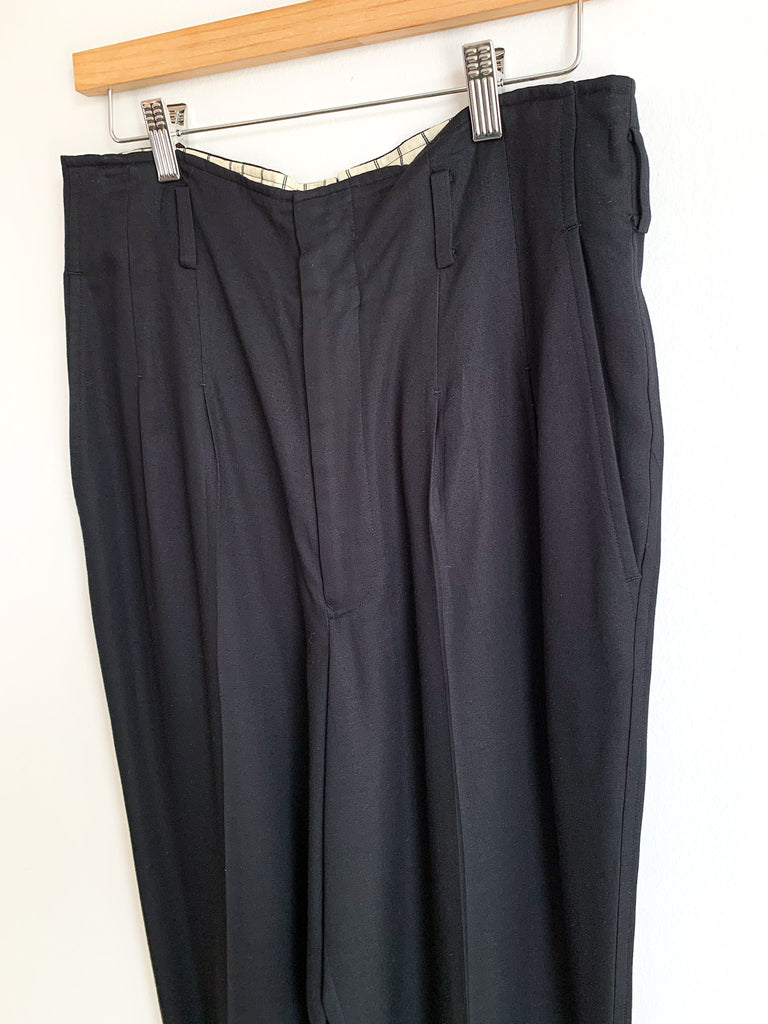 Classic black trousers with excellent drape. Shown styled with striped waist lining turned out for a nice paper bag waist effect. Definitely 1990’s style leanings and very of the moment now.