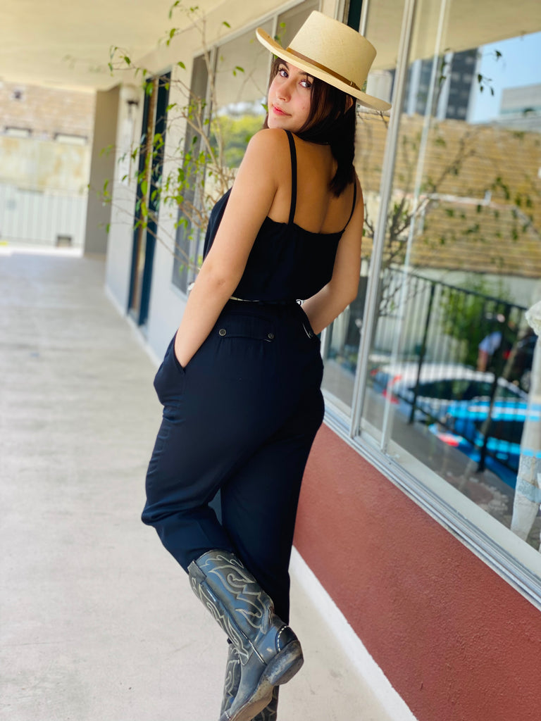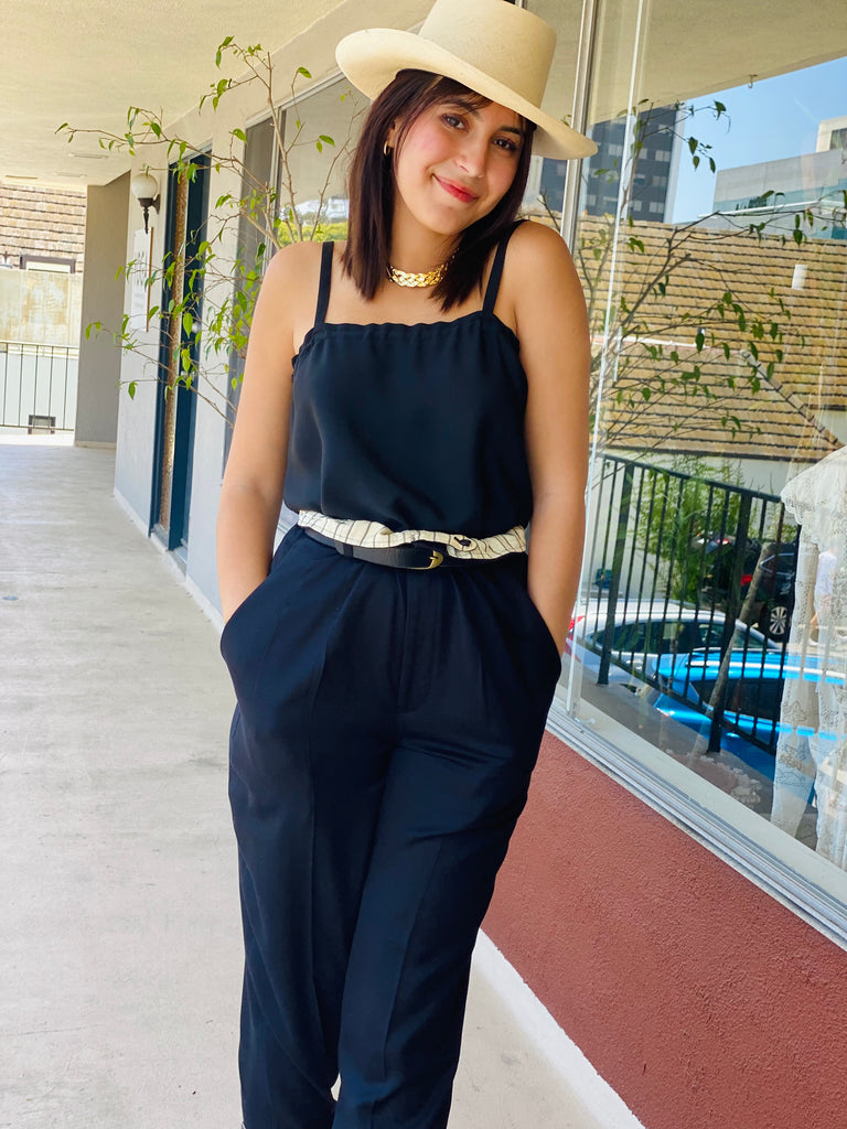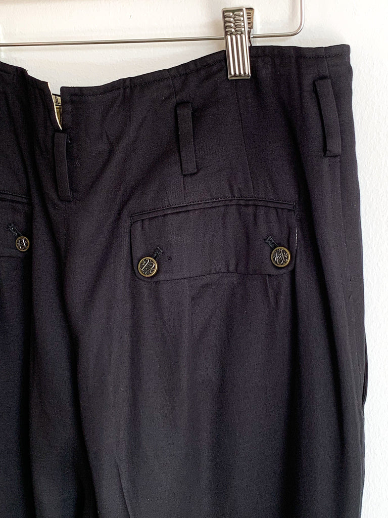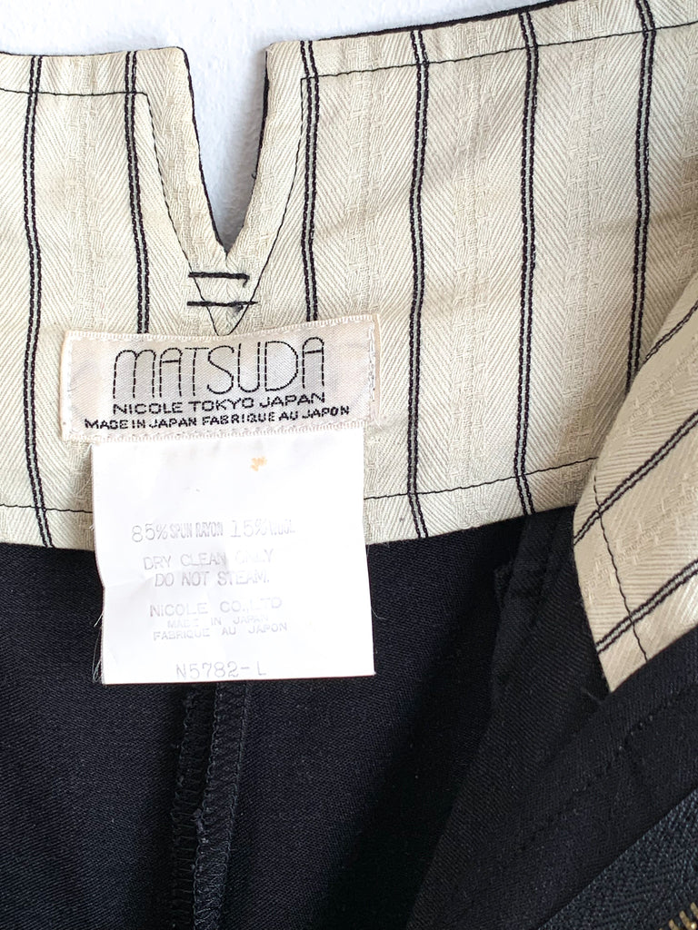 Classic black trousers with excellent drape. Shown styled with striped waist lining turned out for a nice paper bag waist effect. Definitely 1990’s style leanings and very of the moment now.