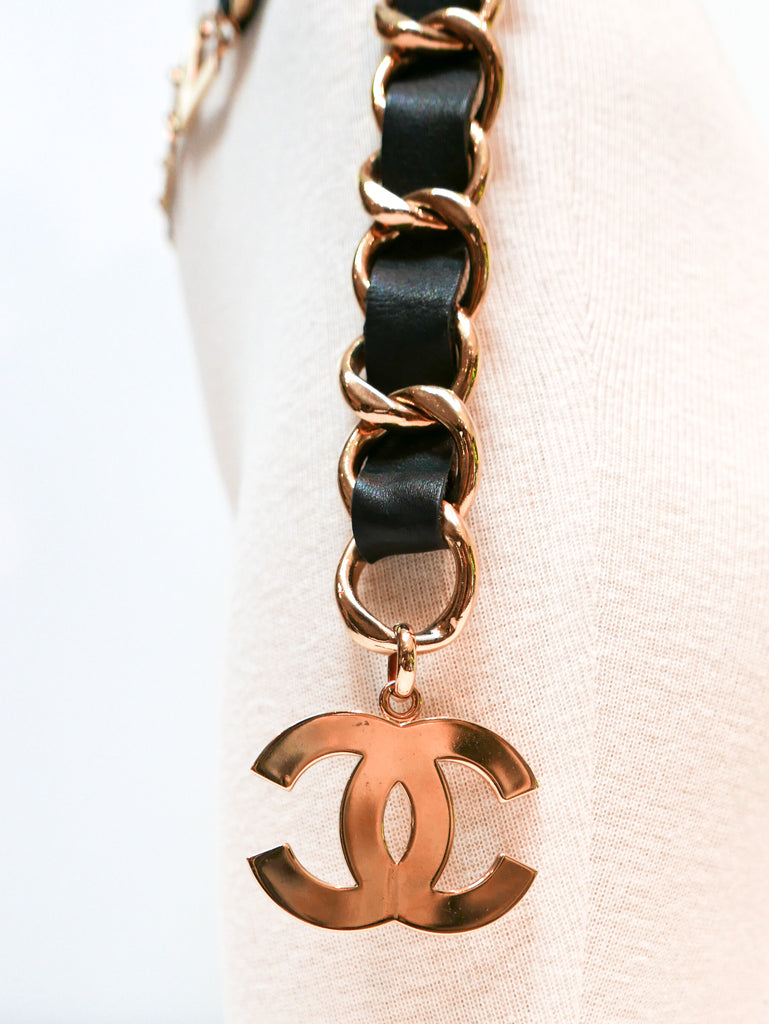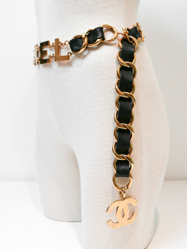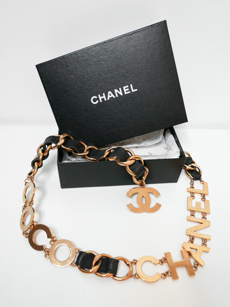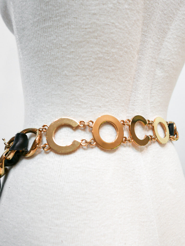 Bold letters spell out COCO CHANEL on this iconic 1993 accessory, complete with a large Chanel logo hanging at the end. Chain and leather complete with stampings indicating authenticity by year and season. This piece was recently re-plated in 18K gold and the black leather re-woven into the gold links. Authentic.