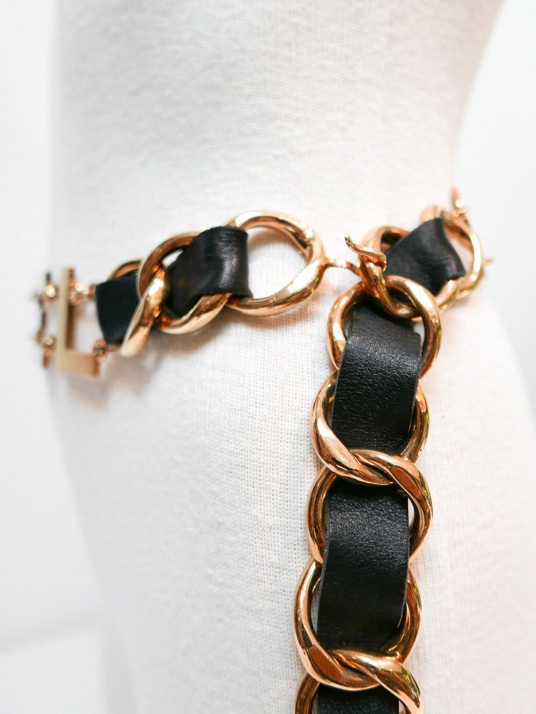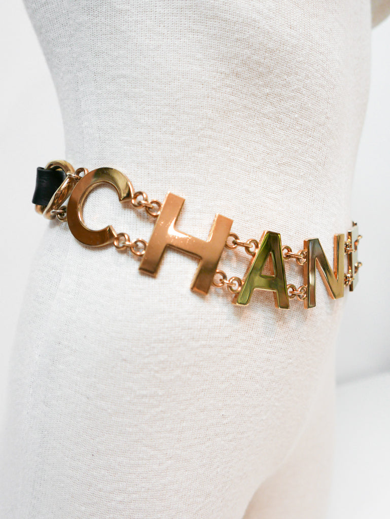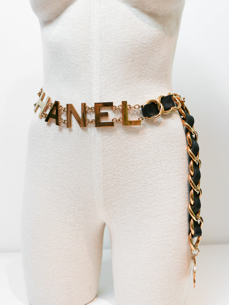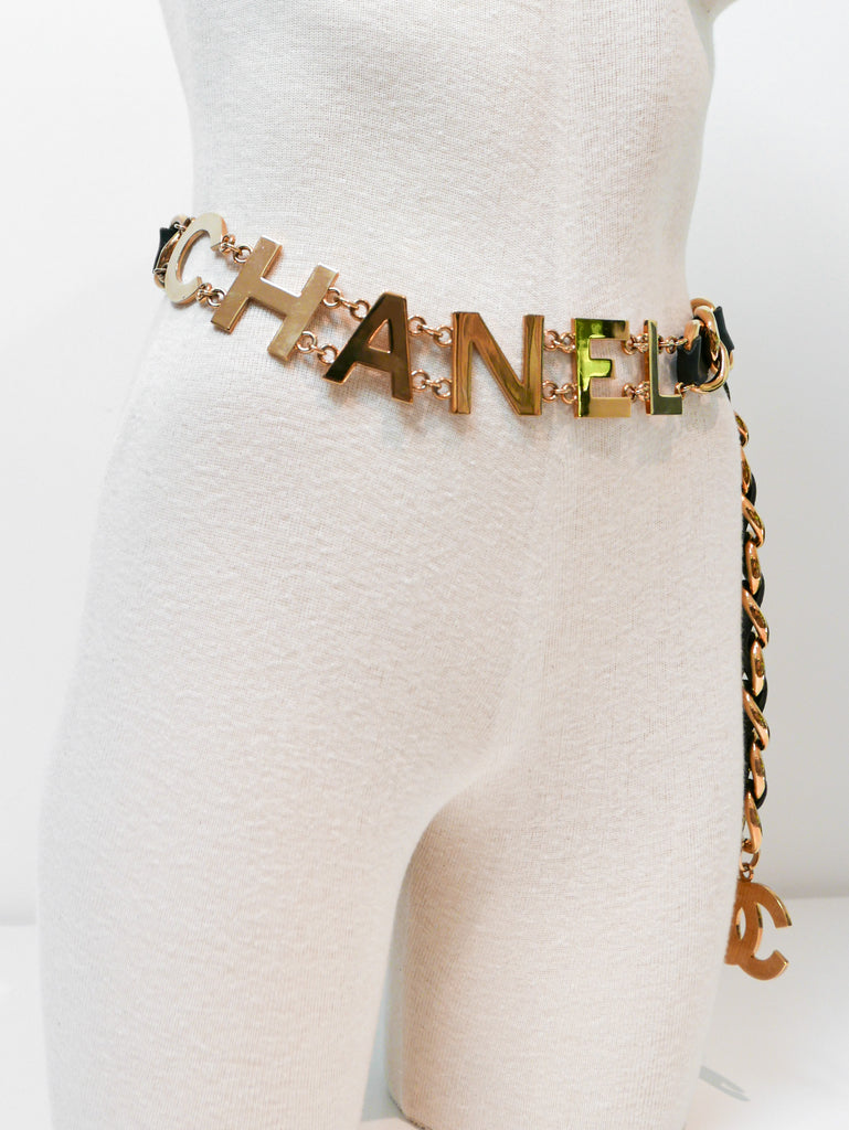 Bold letters spell out COCO CHANEL on this iconic 1993 accessory, complete with a large Chanel logo hanging at the end. Chain and leather complete with stampings indicating authenticity by year and season. This piece was recently re-plated in 18K gold and the black leather re-woven into the gold links. Authentic.