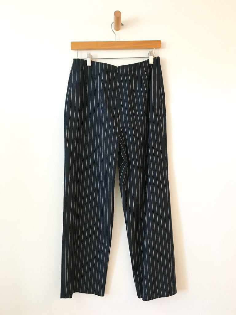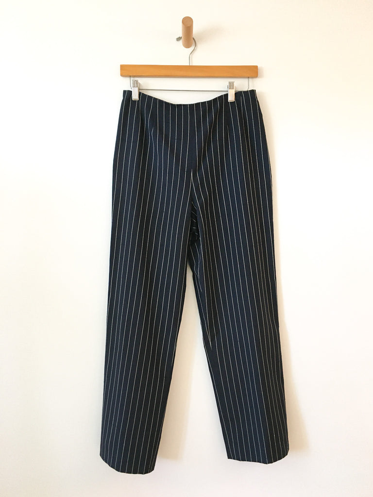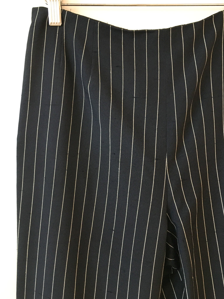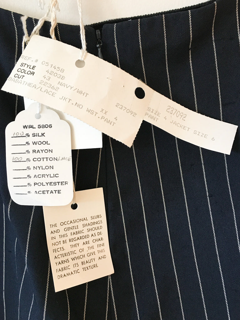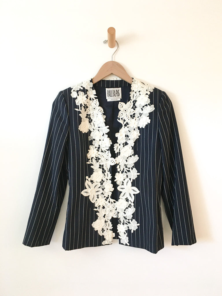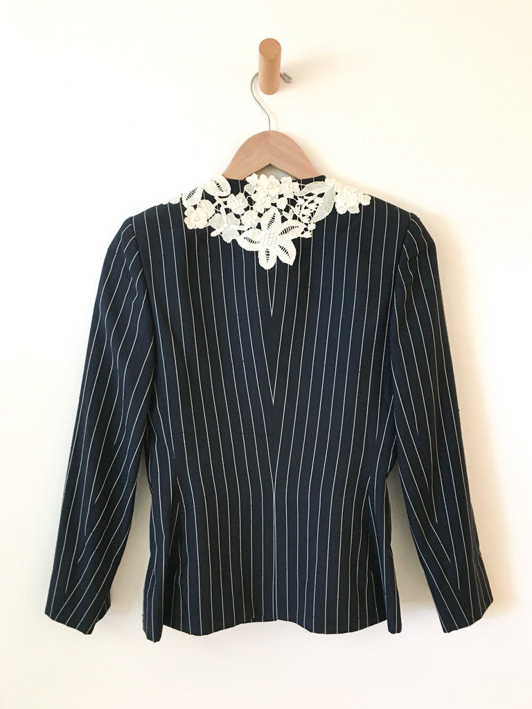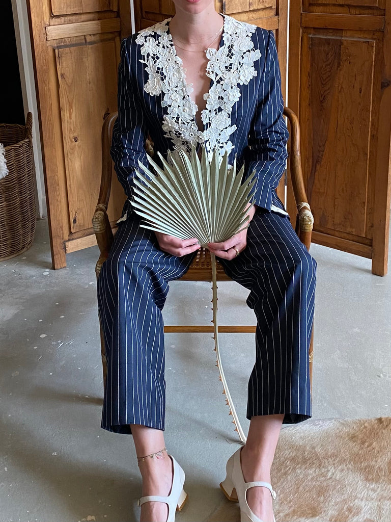 White lace detailing on navy silk pinstriped blazer with matching slim fit back zip trousers. Perfect suit to wear to a wedding.