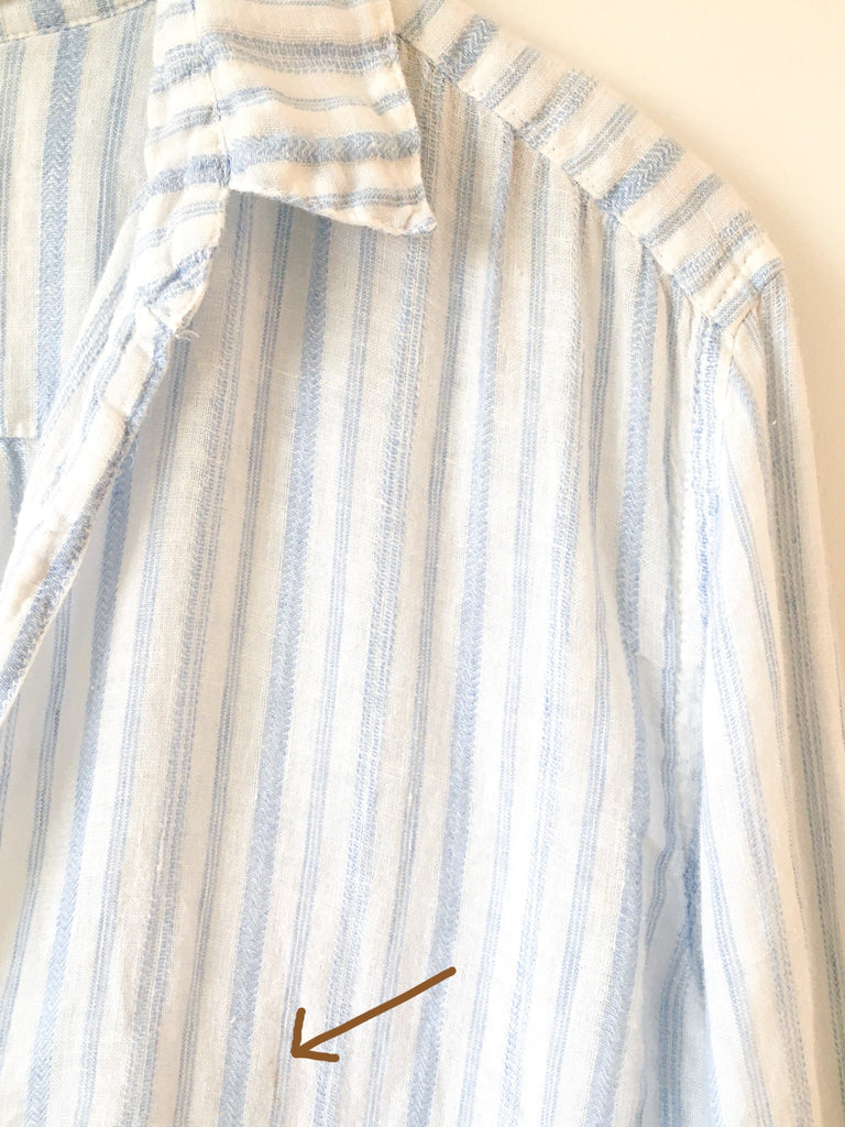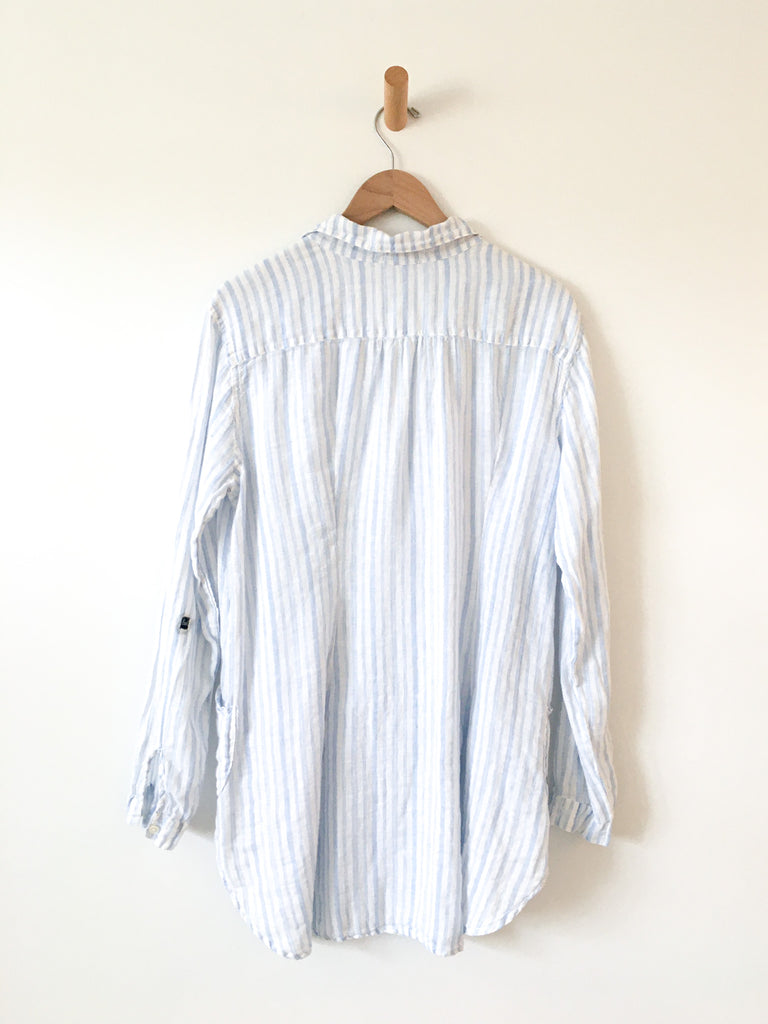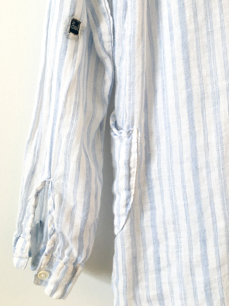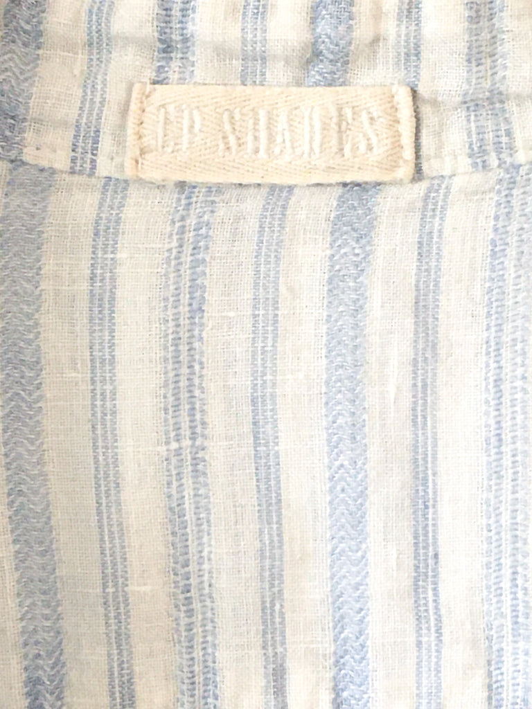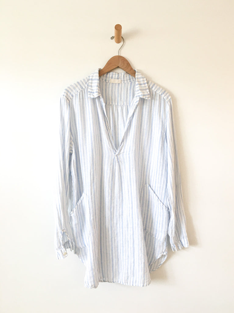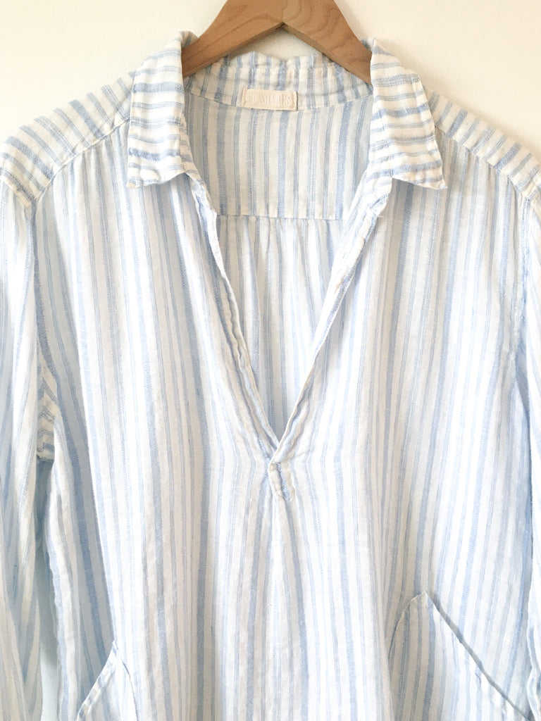 Linen white with delicate blue striped beach tunic with pockets. Enhanced by Carny Couture studios with an 1800’s calico mini patch at sleeve.