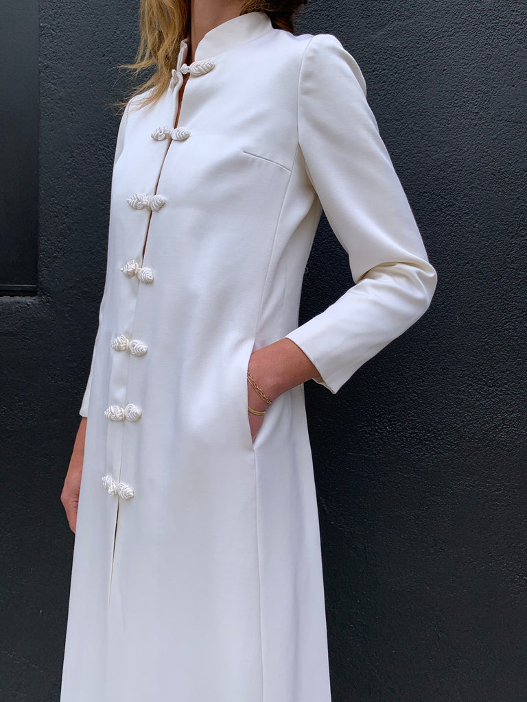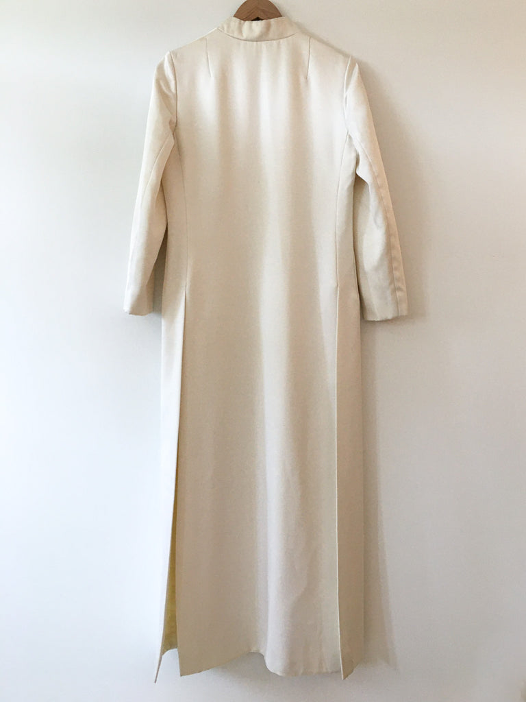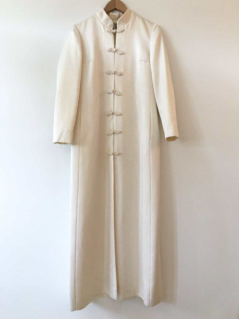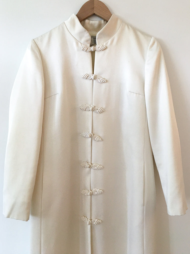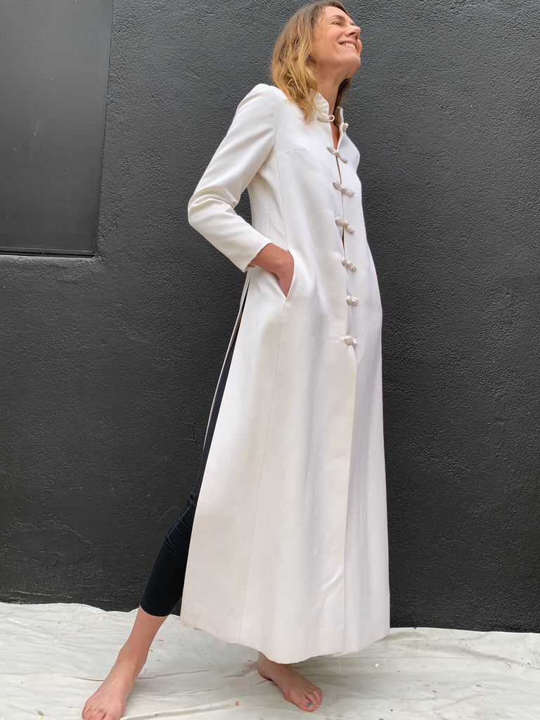 Mandarin high neck, sophisticated long lines coat. Frog closures down the front. Really a spectacular and elegant coat. Especially eye-catching are the high slits at either side at back. I would probably get married in this. It just makes your posture better!