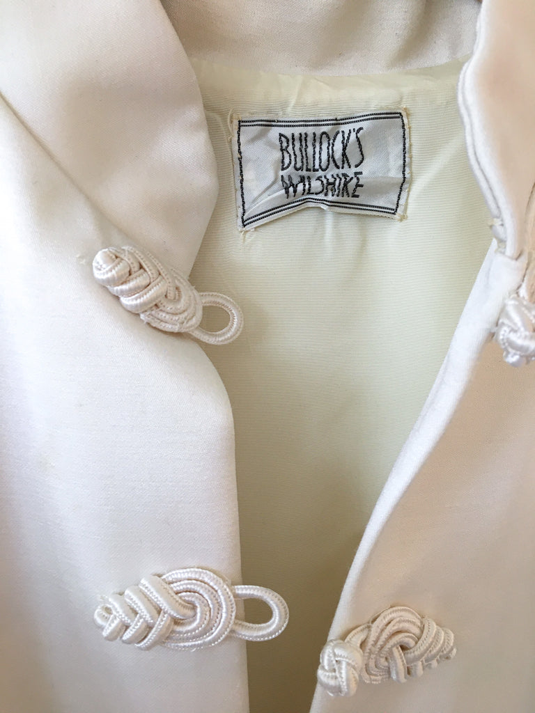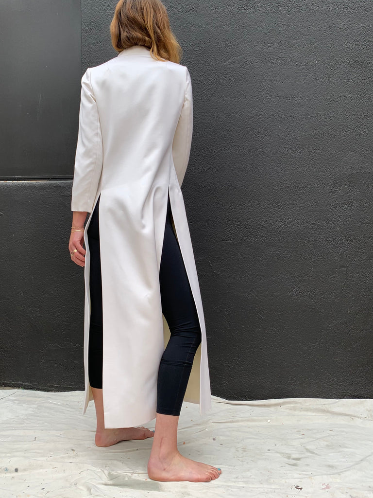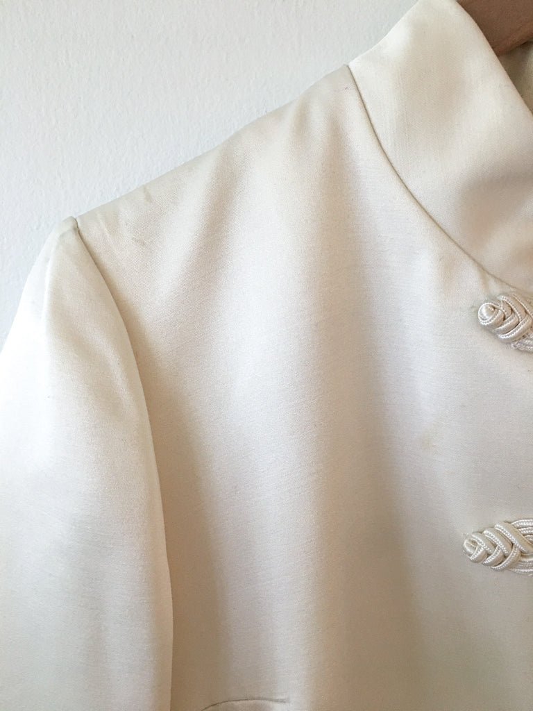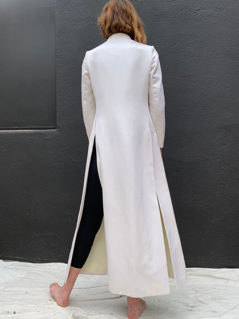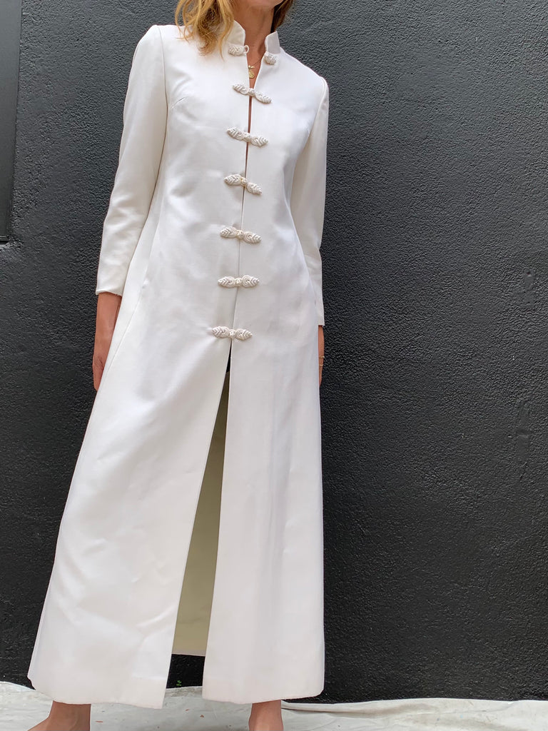 Mandarin high neck, sophisticated long lines coat. Frog closures down the front. Really a spectacular and elegant coat. Especially eye-catching are the high slits at either side at back. I would probably get married in this. It just makes your posture better!