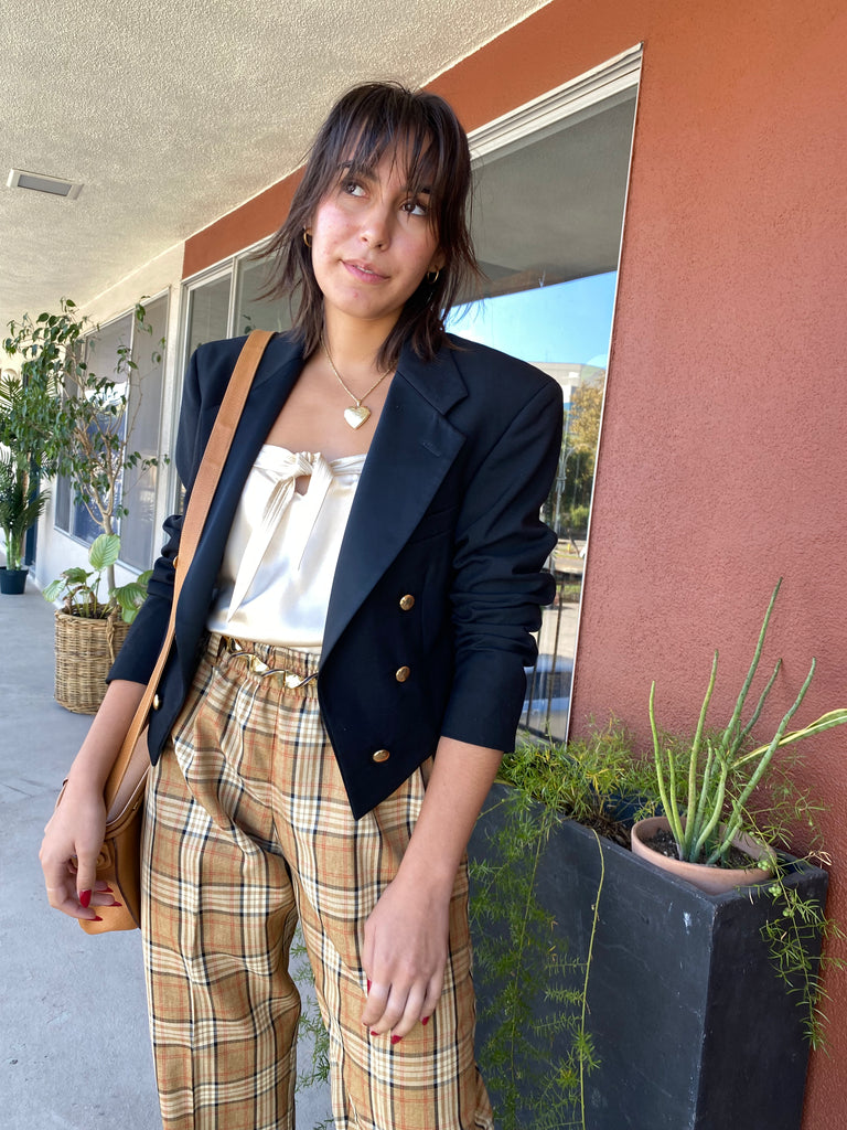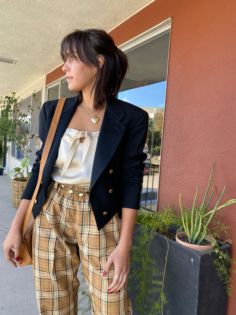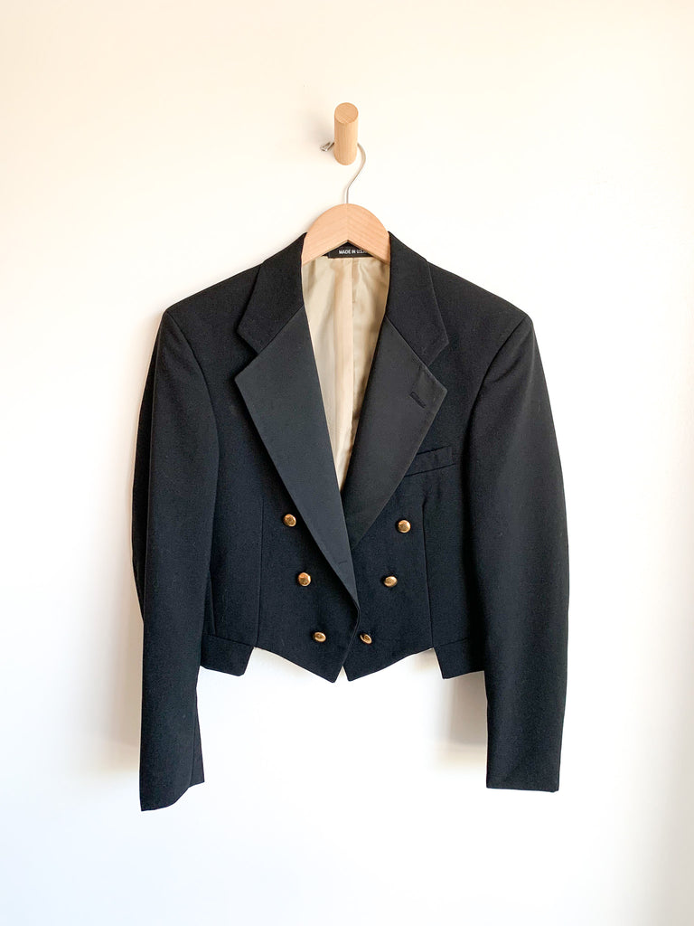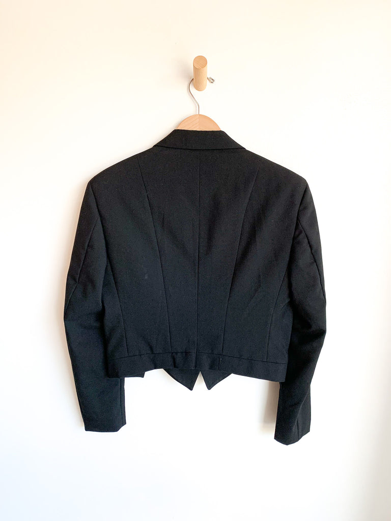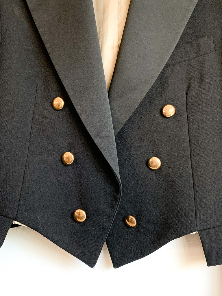 Flattering fit black wool blend with satin lapel blazer featuring symmetrically placed gold buttons. Fully lined. Completes every outfit.