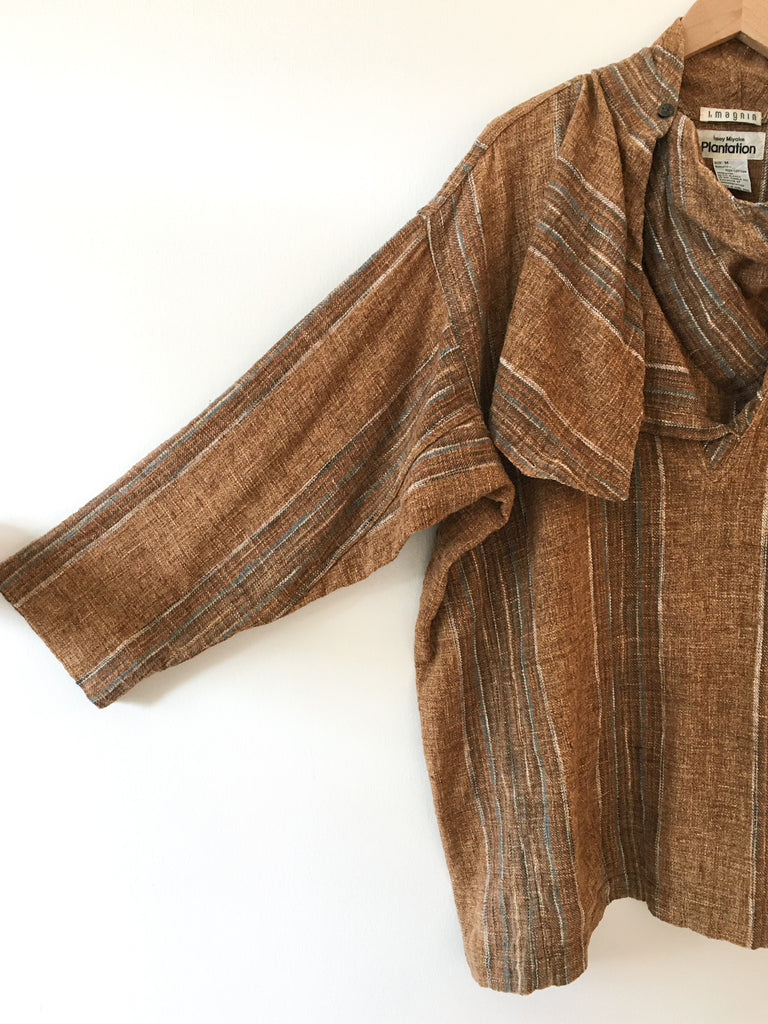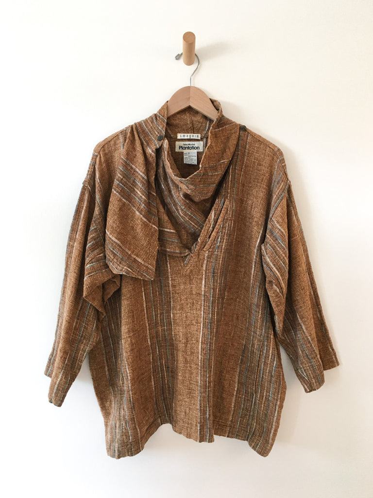 All Cotton over sized and Avant Garde pullover tunic top. Cozy and timeless older 1980’s Plantation from Issey Miyake. Wear the funnel neck collar open or buttoned single or both.