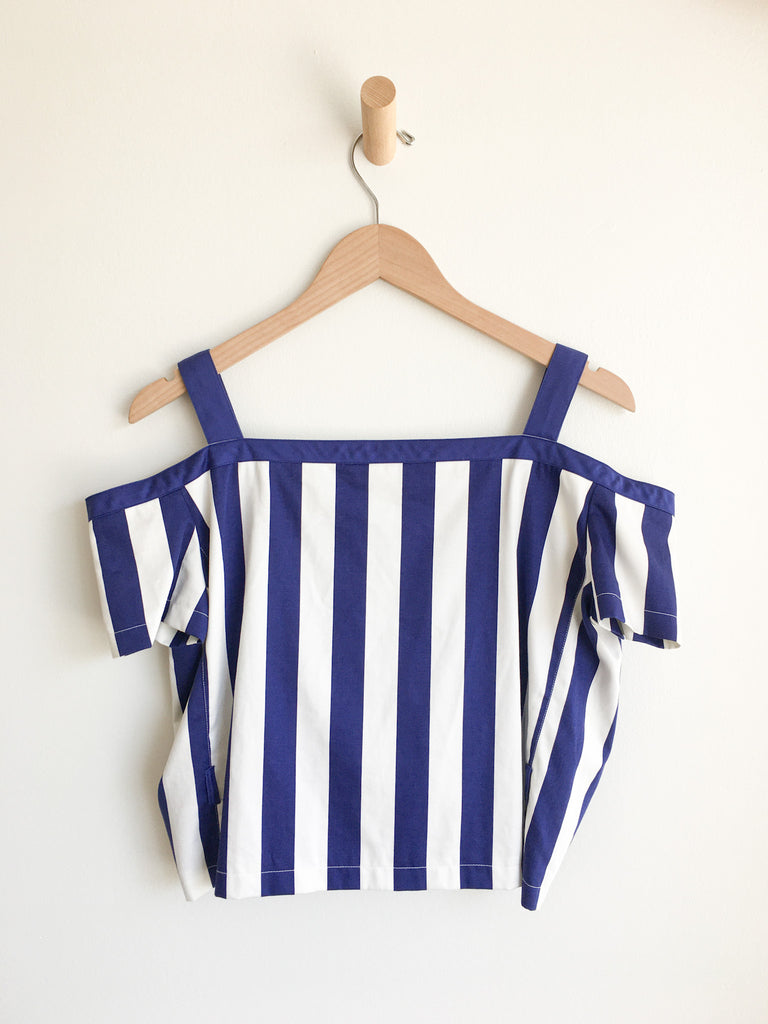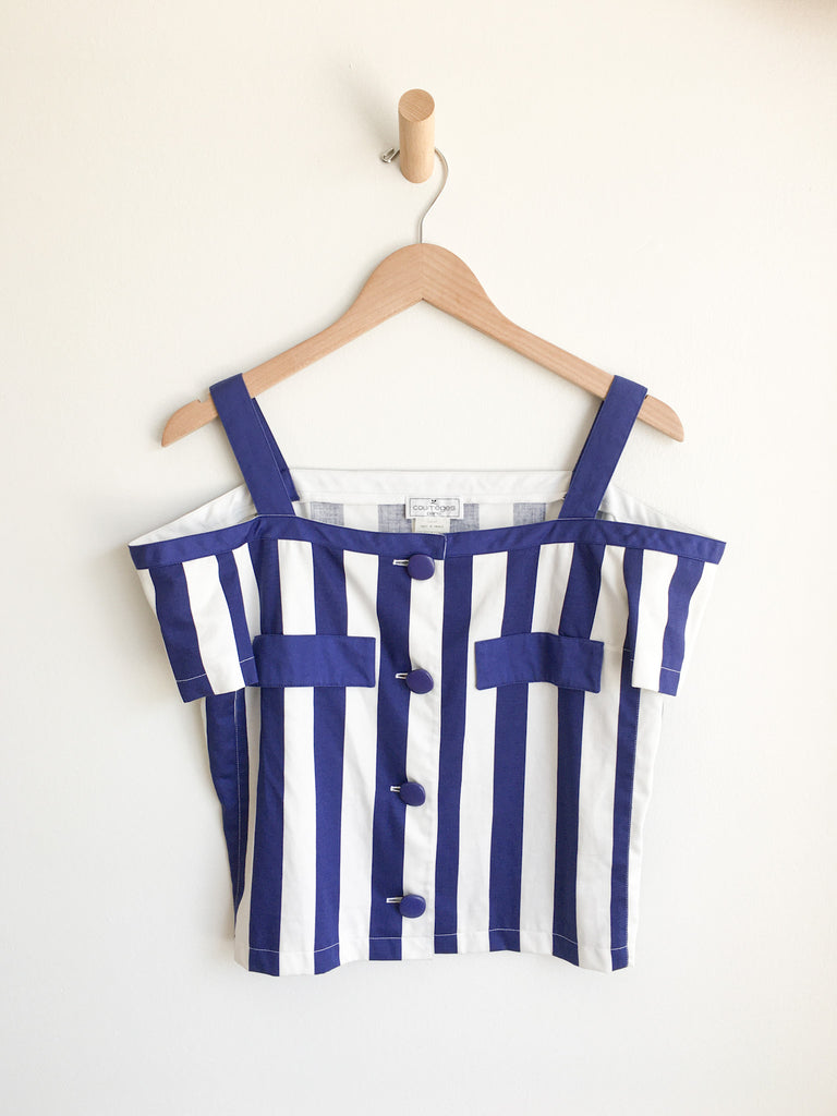 Such a great classic striped nautical inspired top. Can be belted (there are loops) or worn tucked with a high waist pant. A chain belt would be a perfect addition!