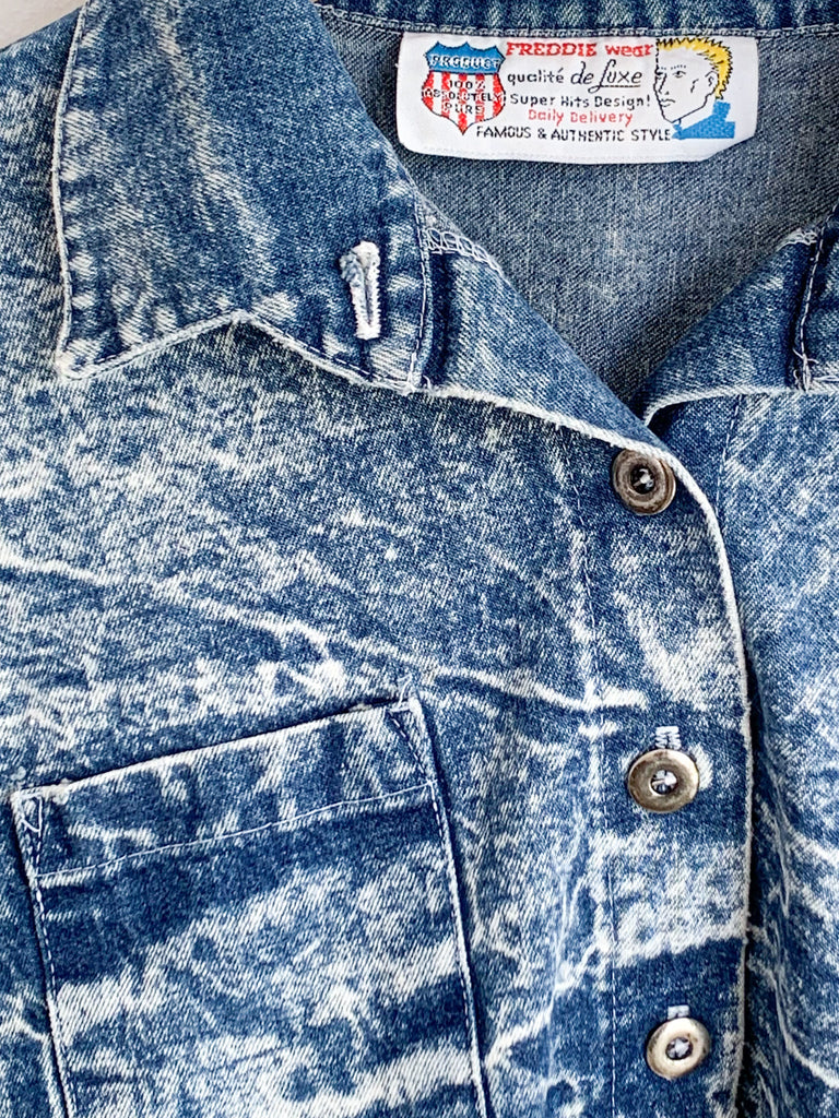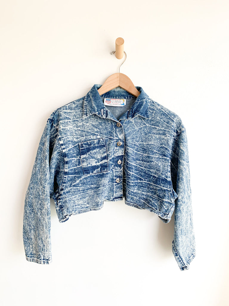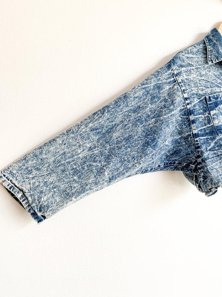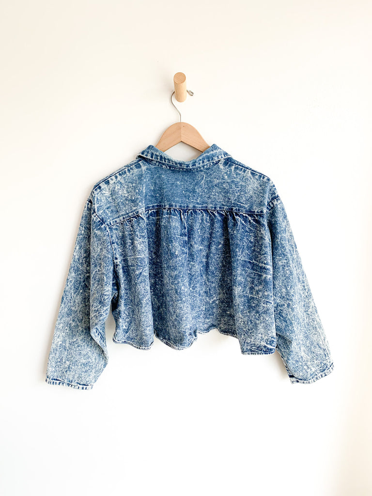 Acid washed perfection. Nice cropped “shacket” with front buttons and slight dolman sleeves. Easy wearing go to layering piece.