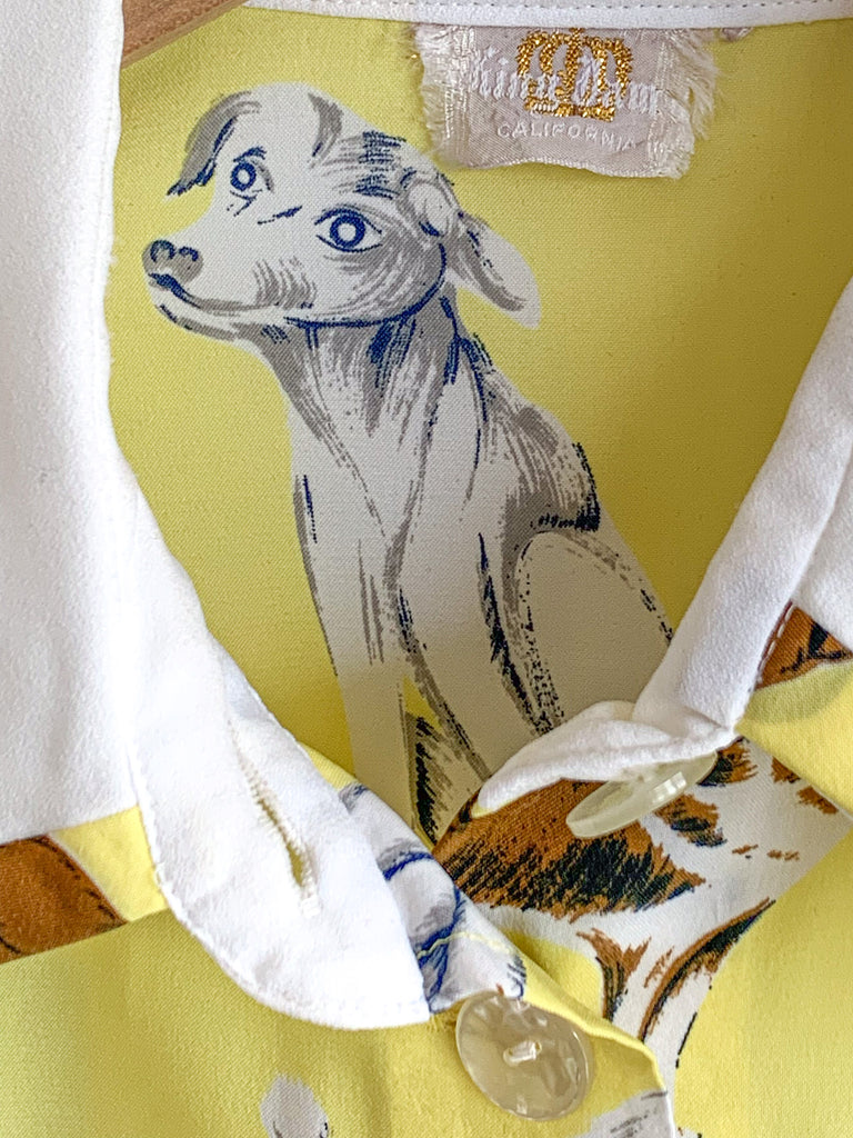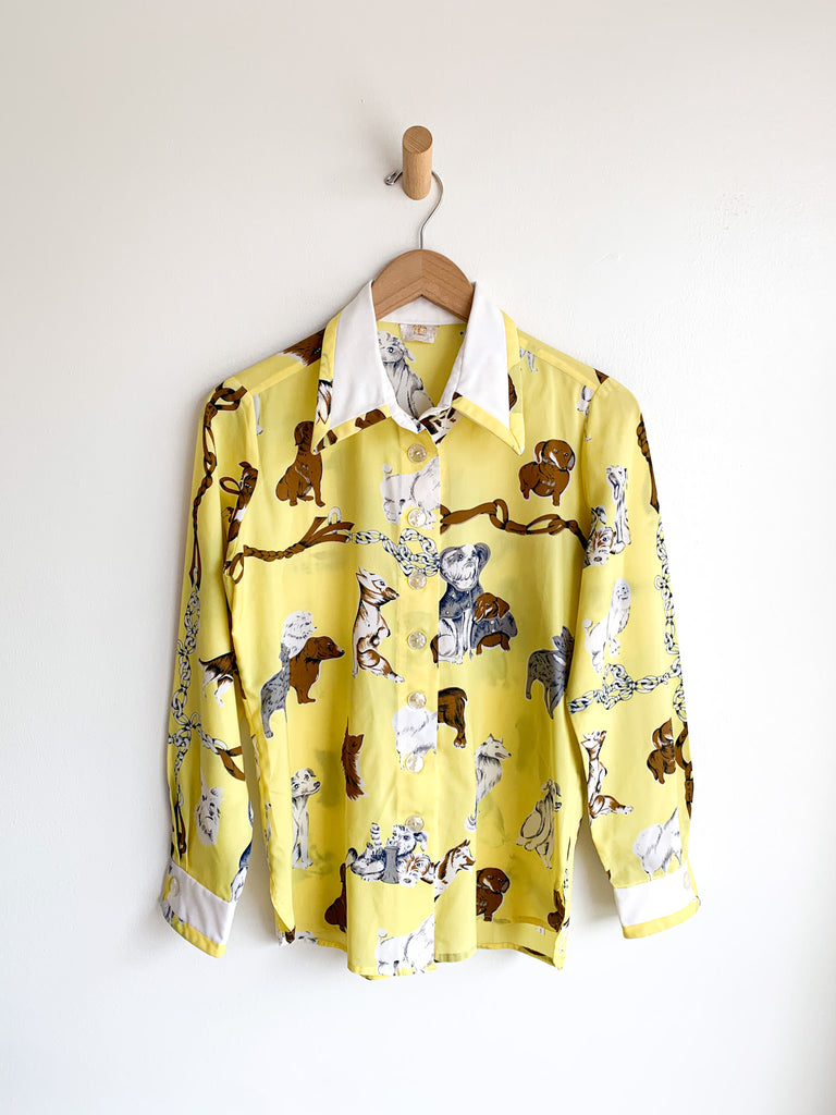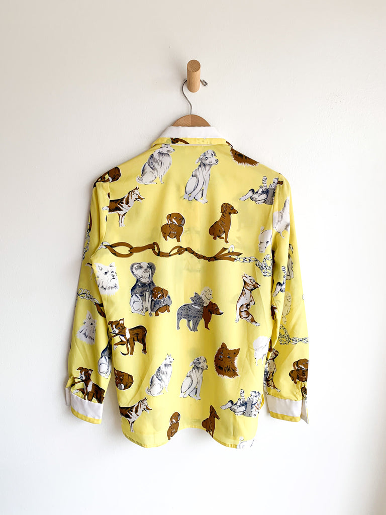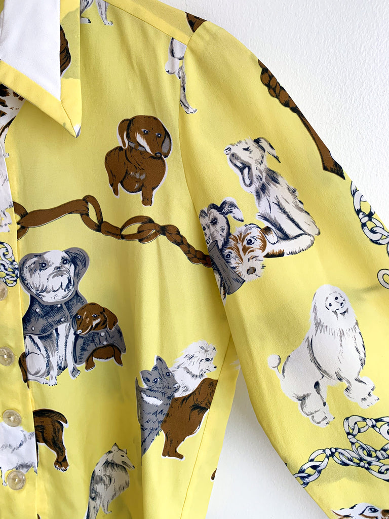 Novelty print dog shirt. Long sleeve button front in lemon yellow with white collar, lightweight synthetic fabric is easy wearing, doesn’t wrinkle, washer and dryer simple cleaning.