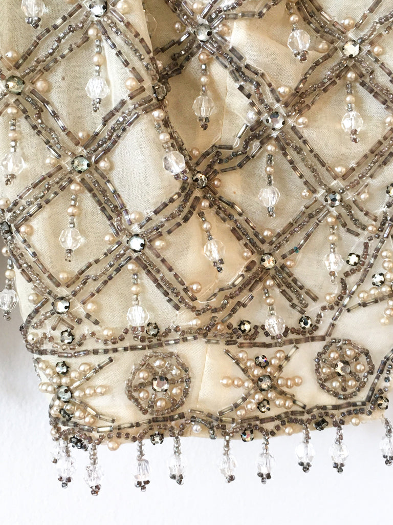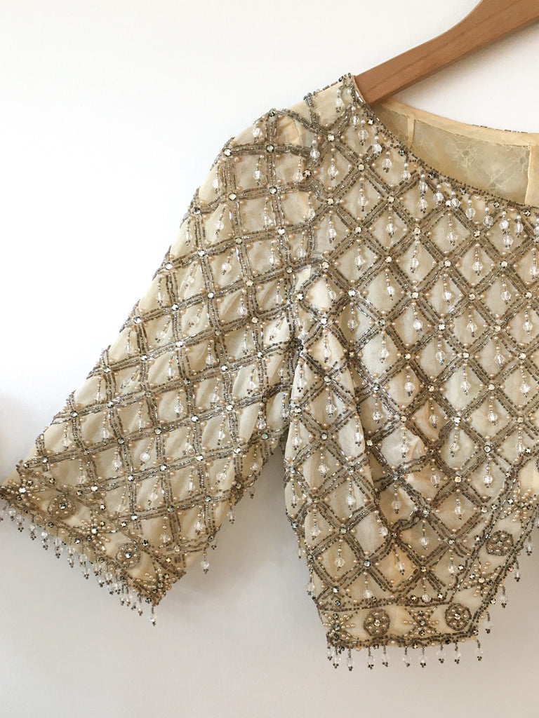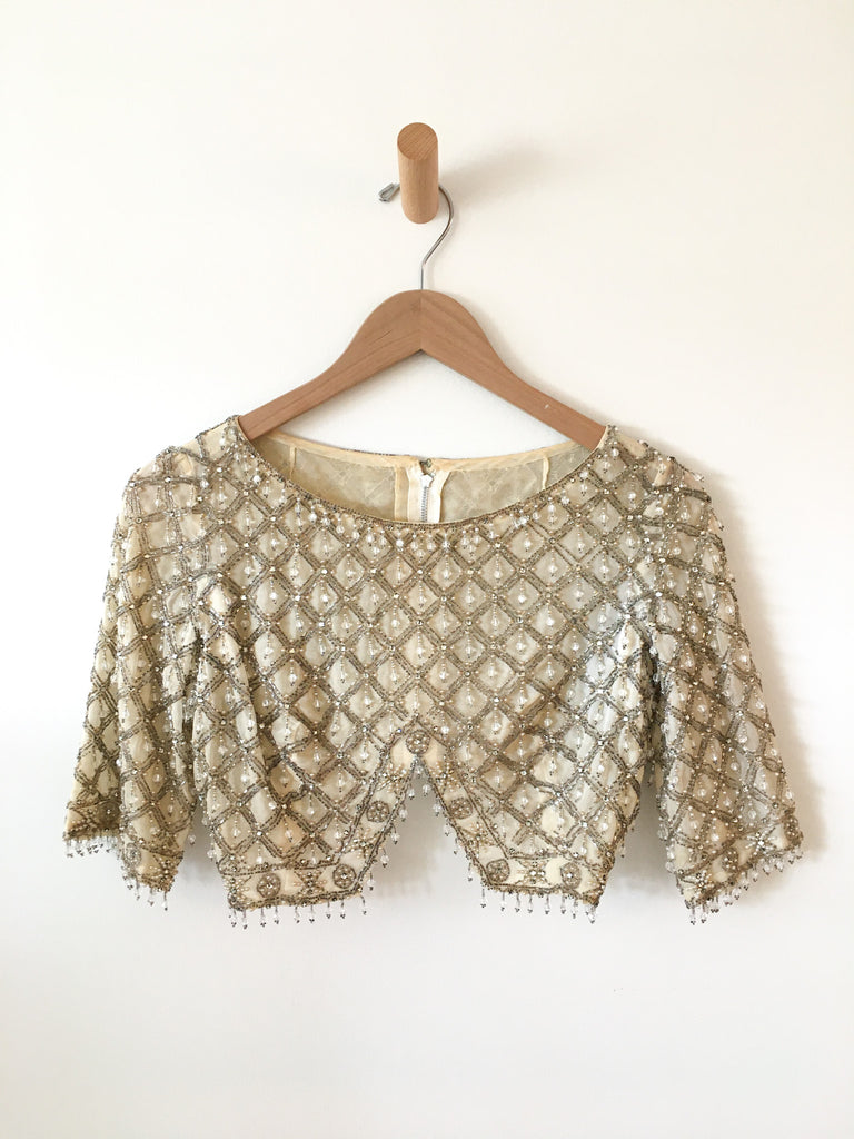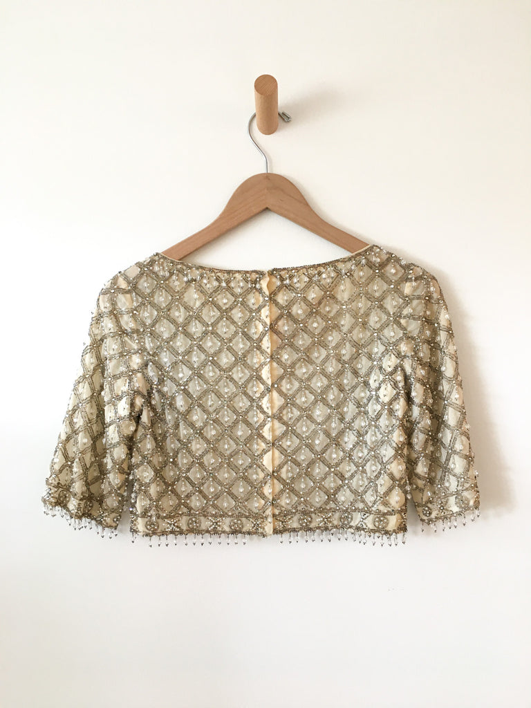 Very cropped silver bead embellished top. Sexy evening wear layered over a slip dress or as always pair with denim for our favorite high low go-to look. 3/4 sleeves and drop beads at hem and sleeves. Zips up back. Fitted style.