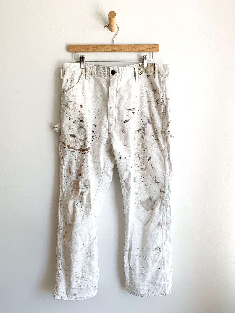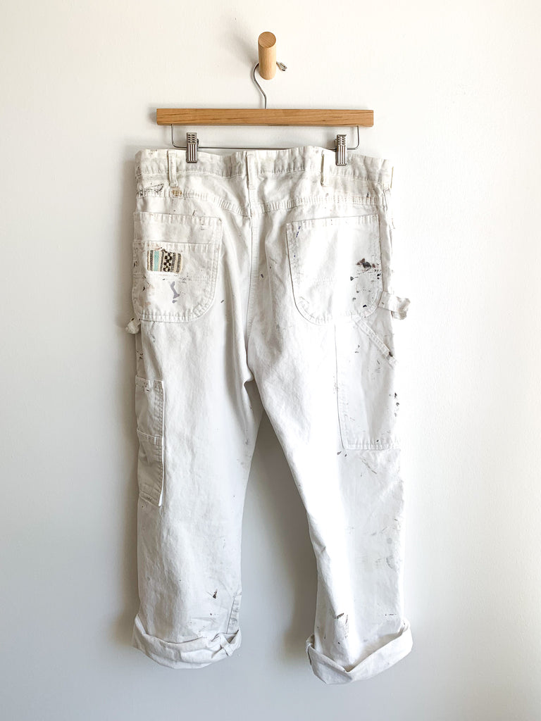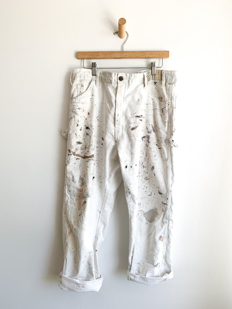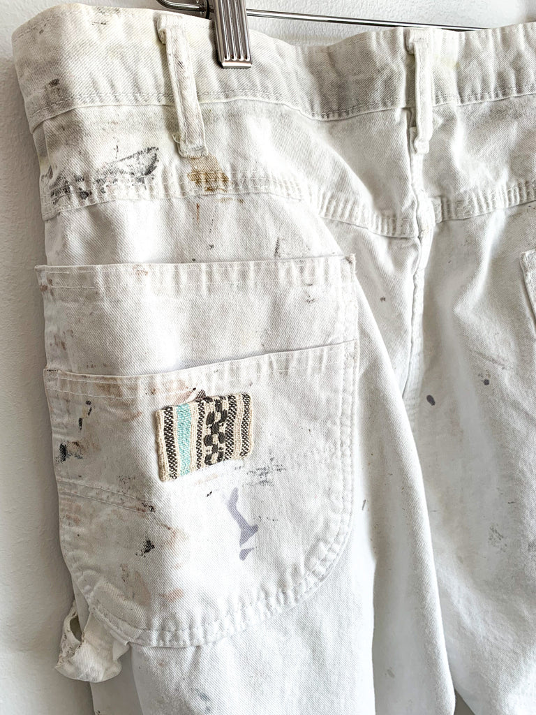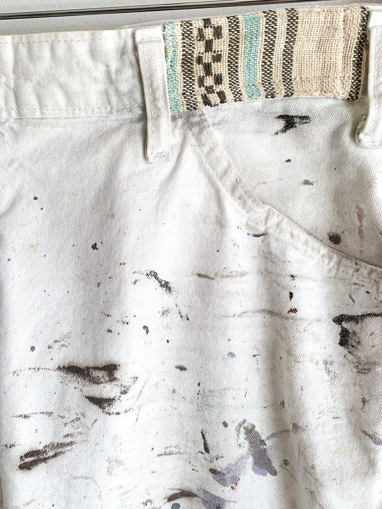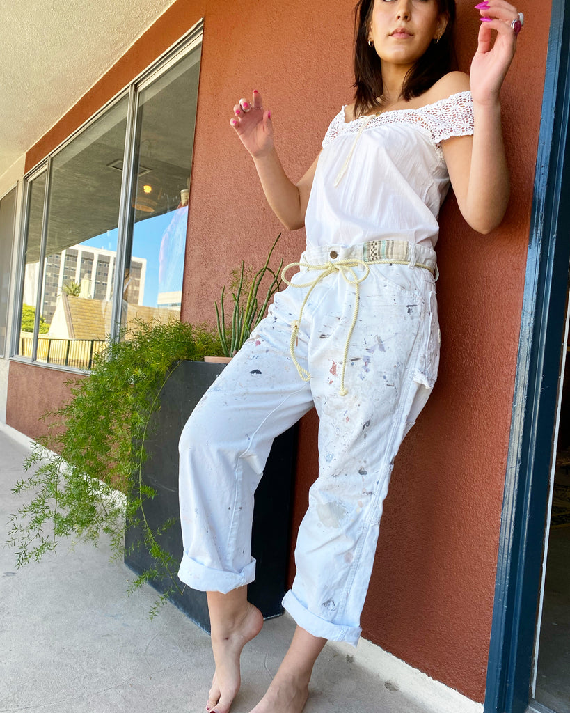 White cotton splattered and patched work pants. Shown styled with our cotton rope belt made from 1940’s military tent (sold separately). Imperfectly perfect.