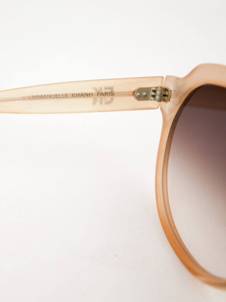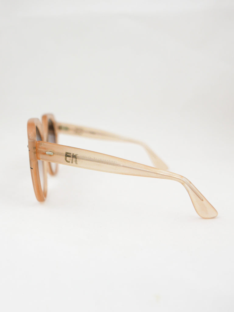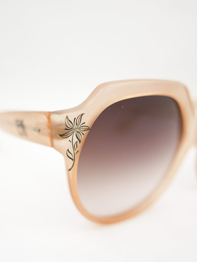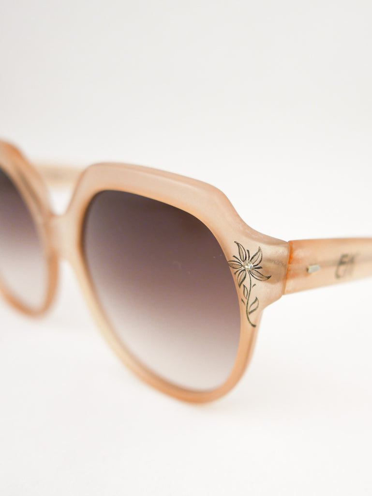 Emmanuelle Khanh sunglasses with a happy sparkle flower in each corner of the translucent peach frames. Made in France.