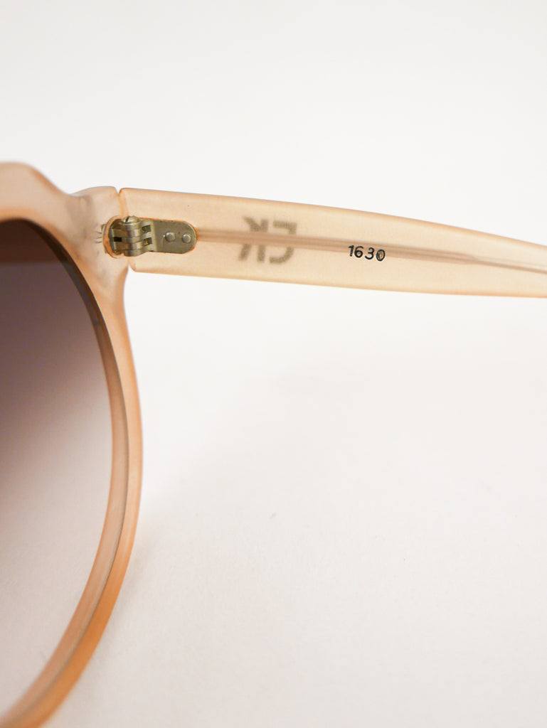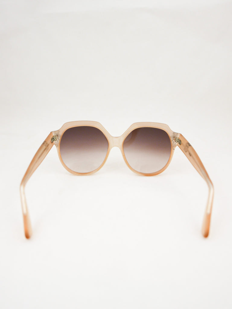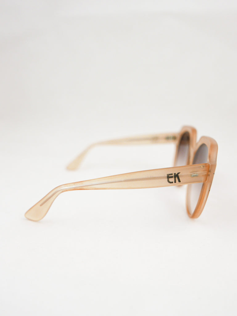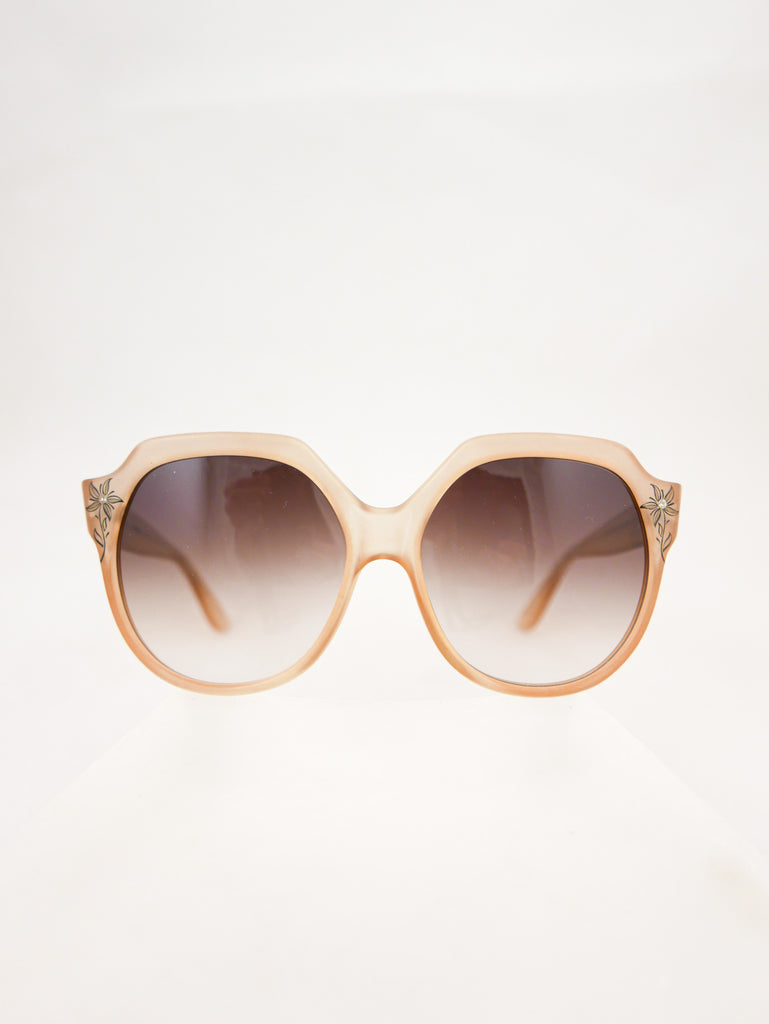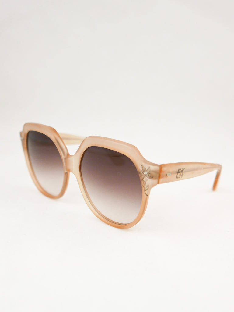 Emmanuelle Khanh sunglasses with a happy sparkle flower in each corner of the translucent peach frames. Made in France.