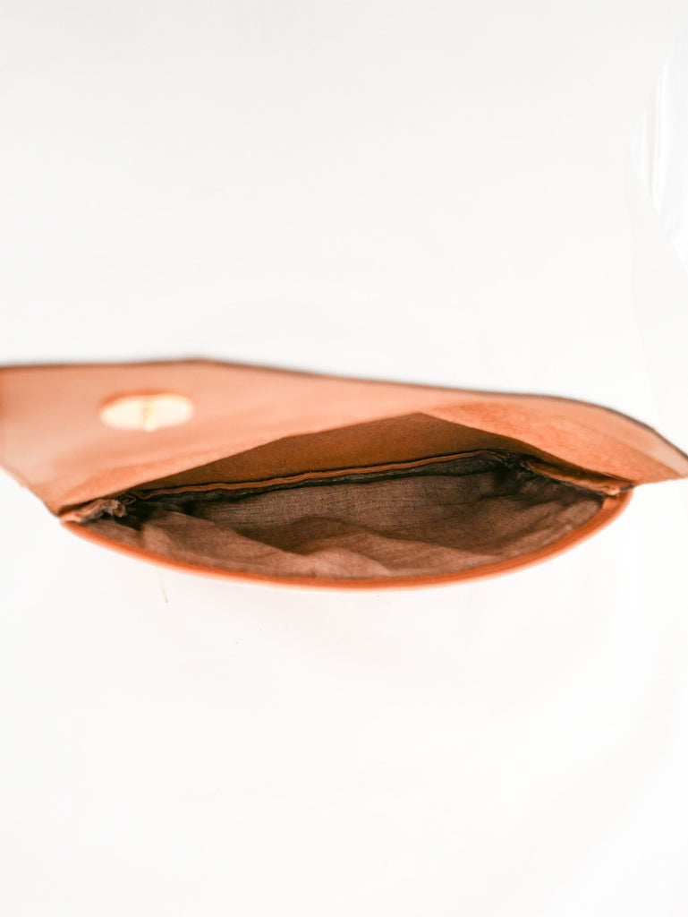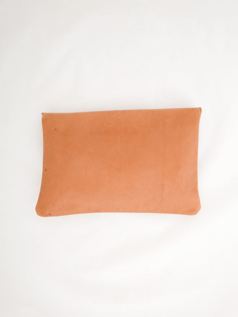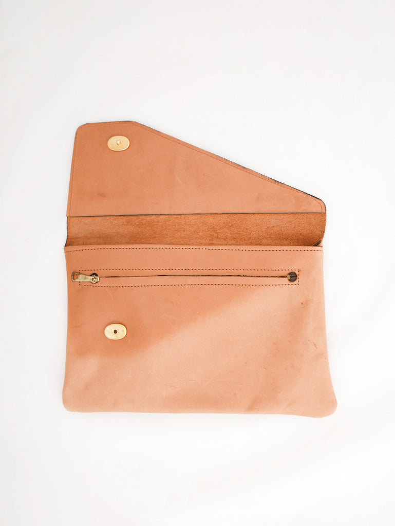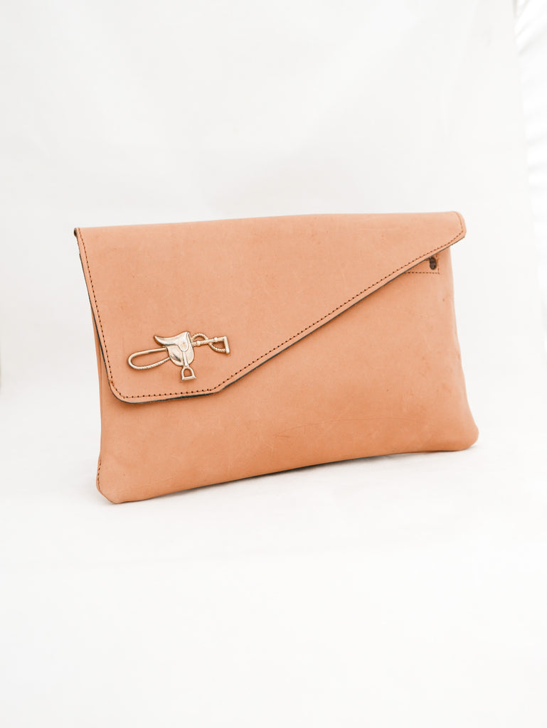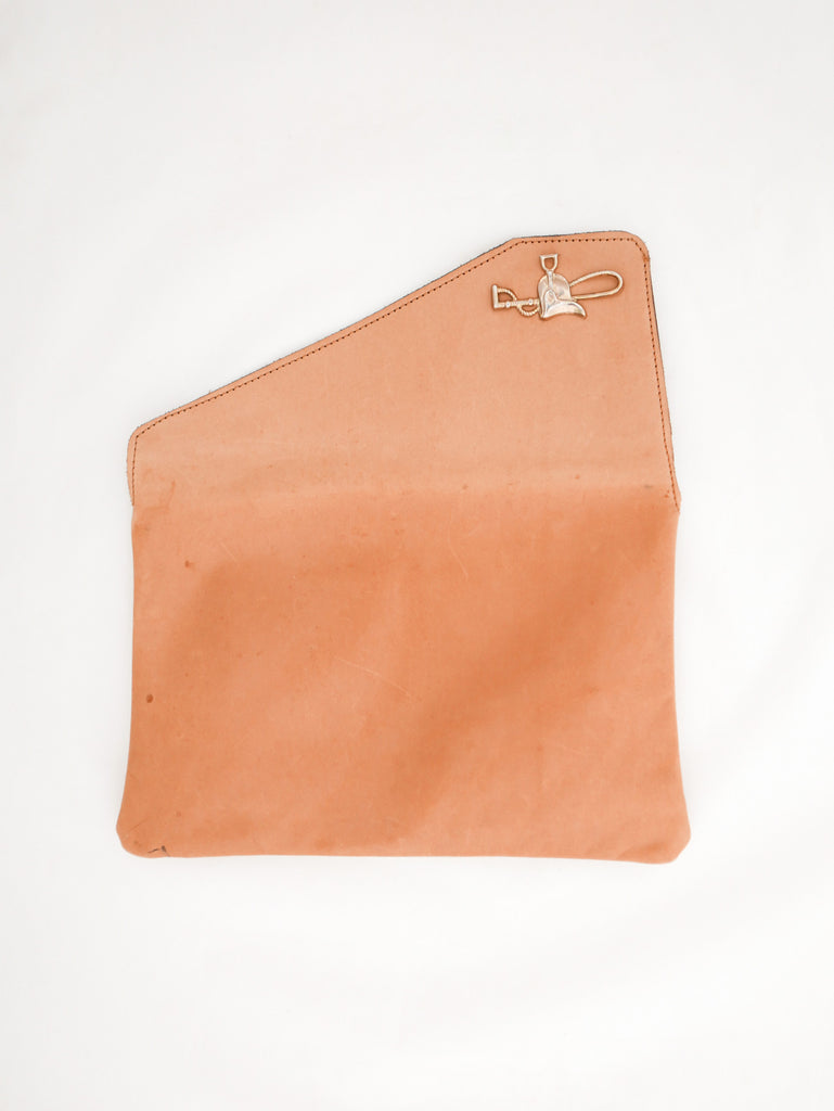 Nicely worn clutch with equestrian vibe. Contrast stitching and jockey saddle and whip decorative element. Smooth tan leather envelope style with snap front and inside zipper compartment.